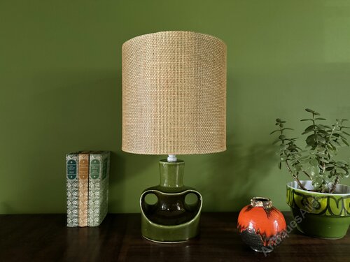 A very cool, 60s table lamp marked Kabaka Ware, with original woven shade. The lamp is olive green ceramic and comes with a perfectly matched shade with a green background overlaid with natural weaved hessian. The lamp has been rewired and PAT tested.