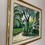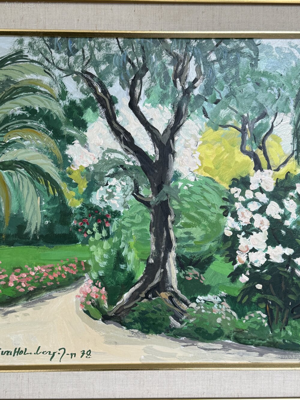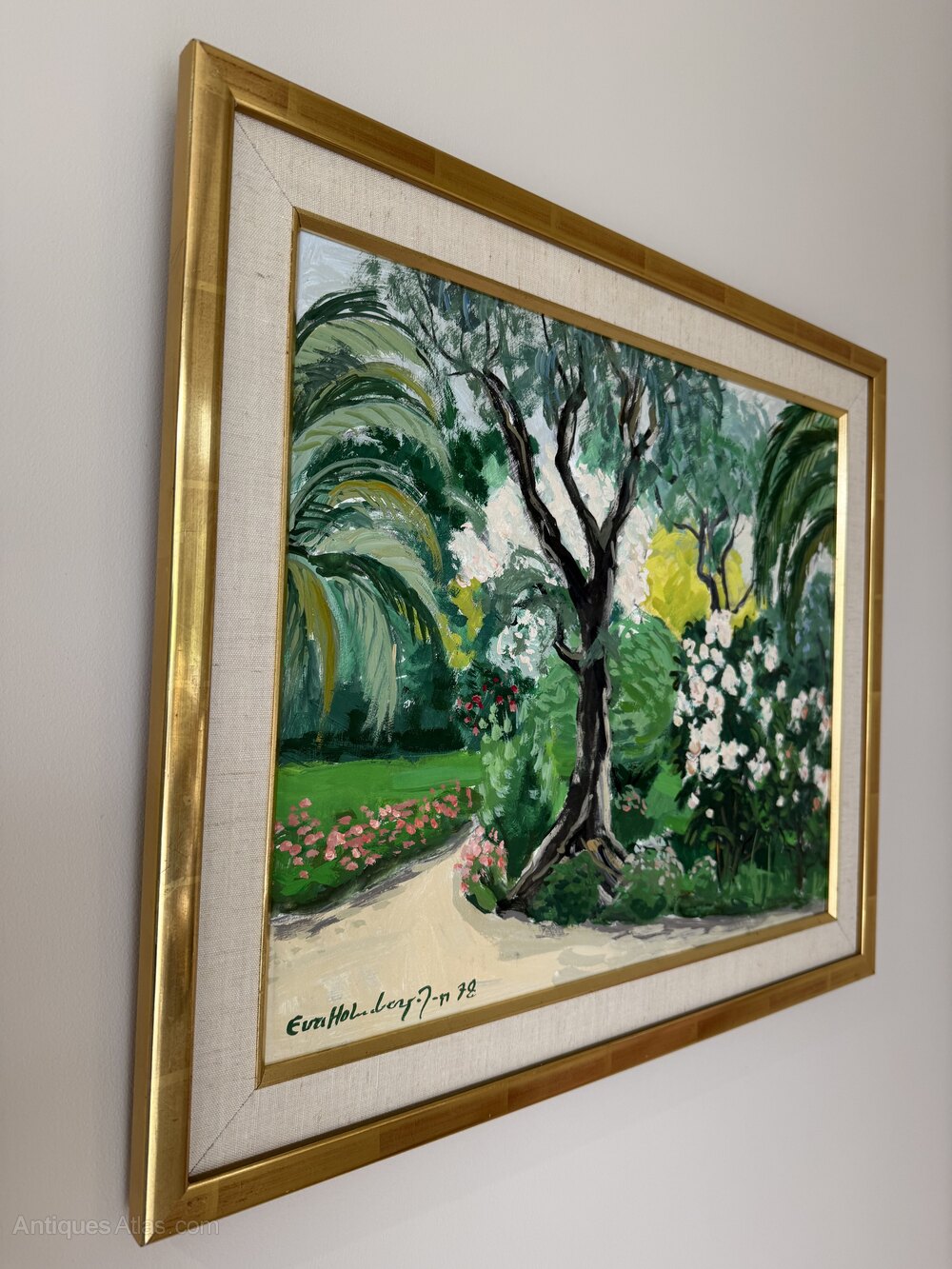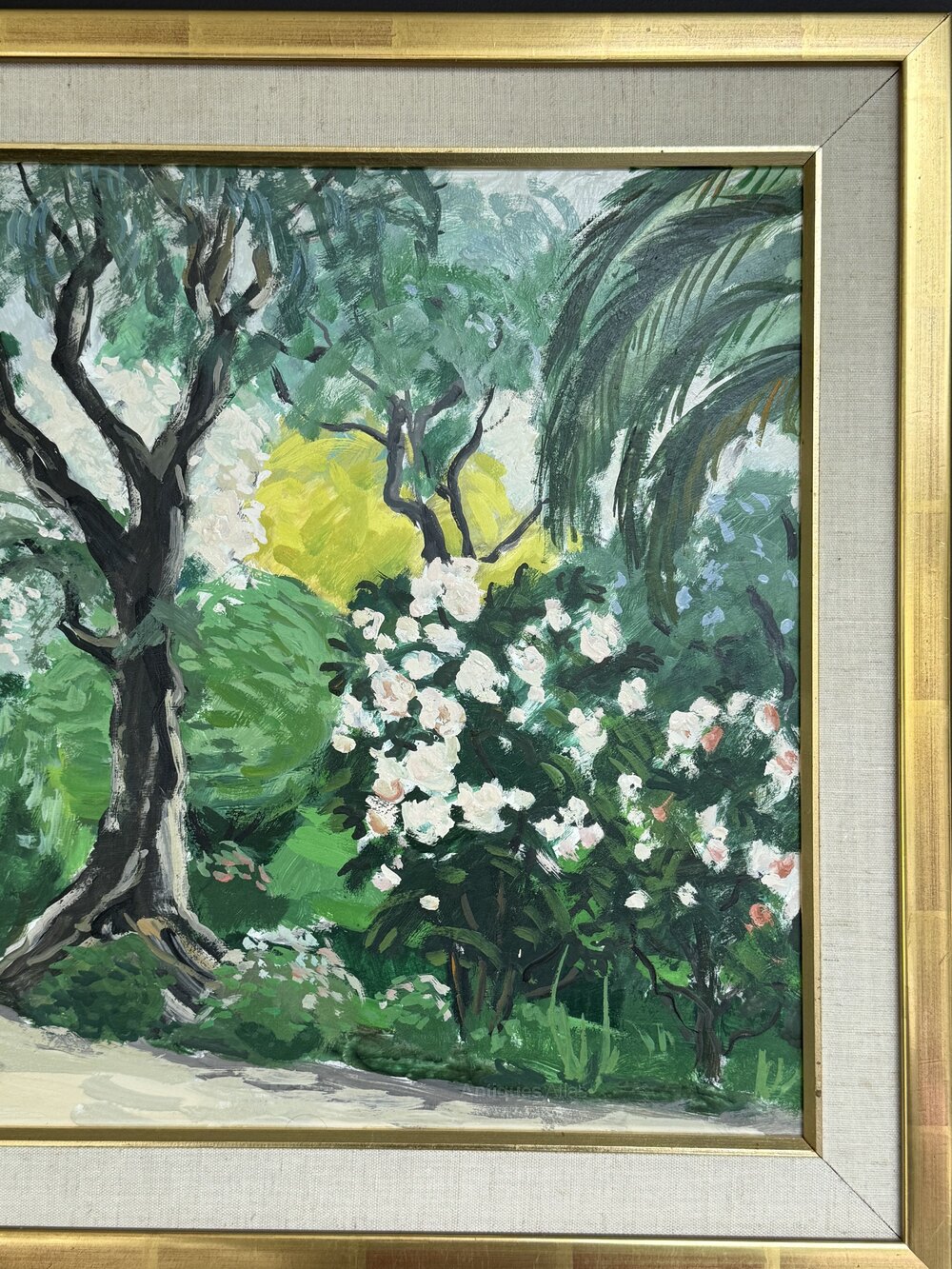 This is a particularly lovely example depicting a vibrant garden with her signature palm trees and a beautiful rose tree to the foreground. All displayed in the original quality lined frame.