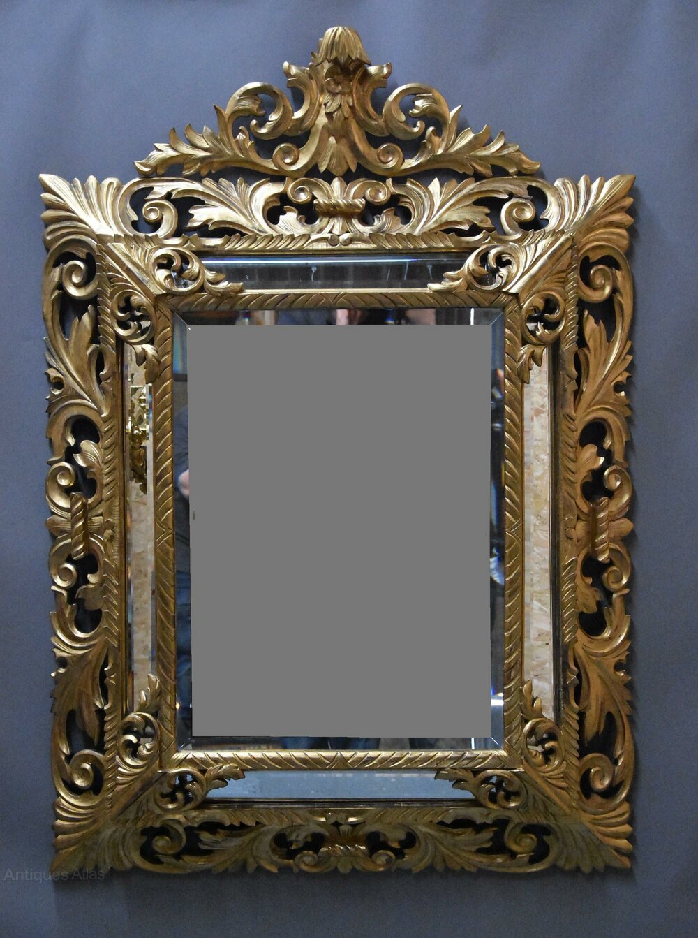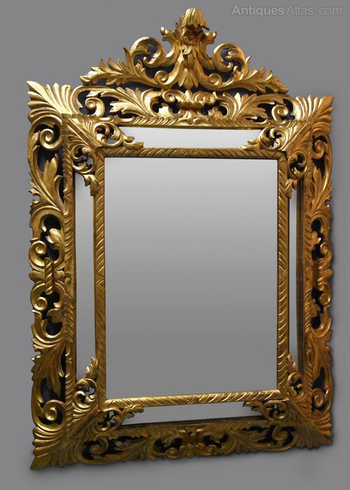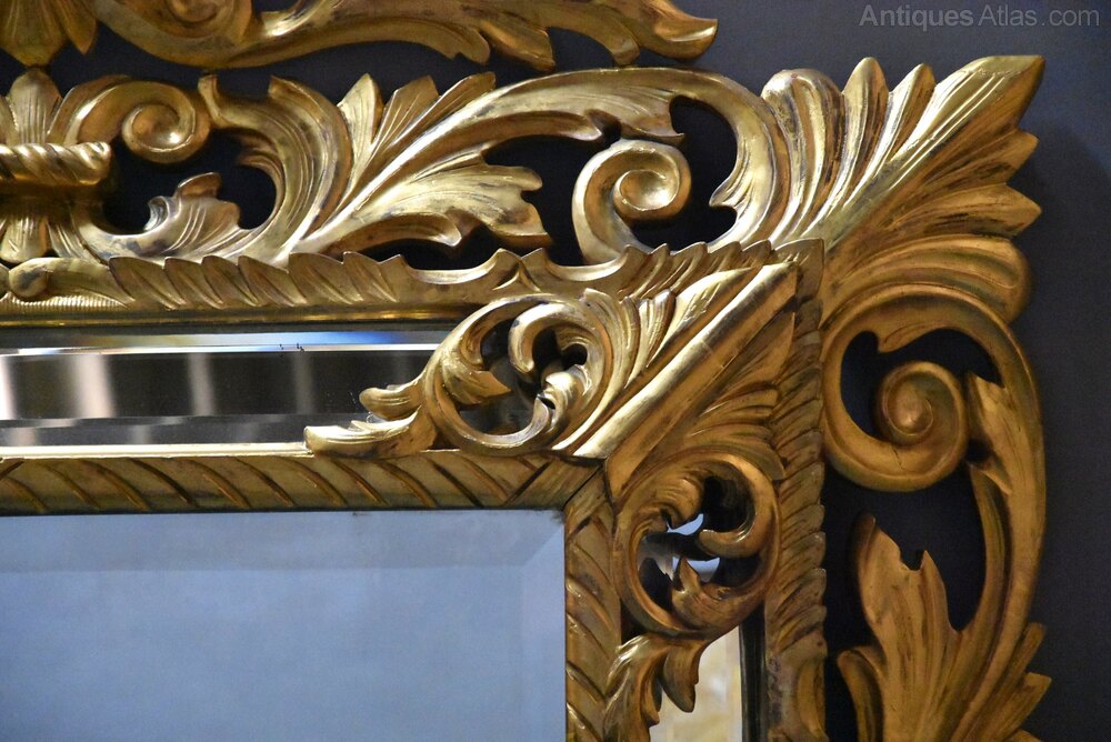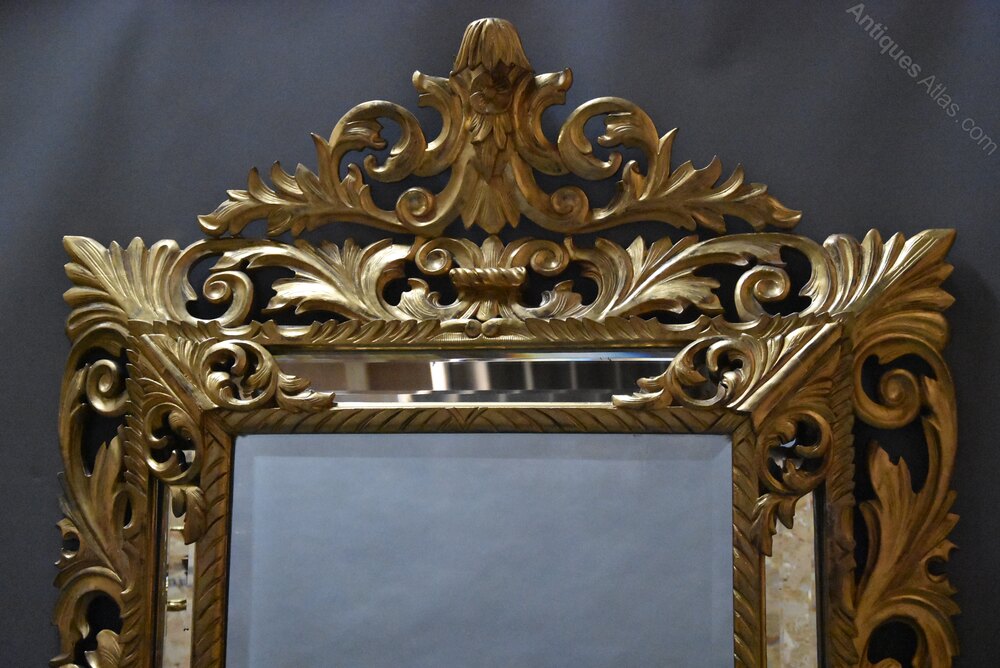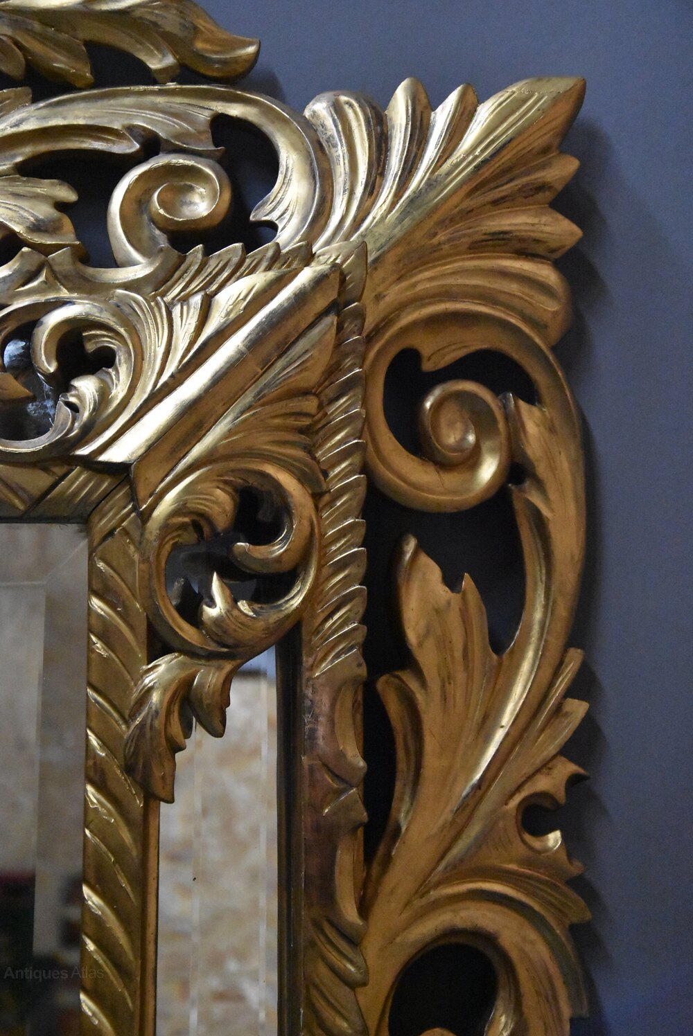 The mirror consists of a superbly carved cresting to the top with floral and scrolling foliate decoration with original bevelled glass in all sections.