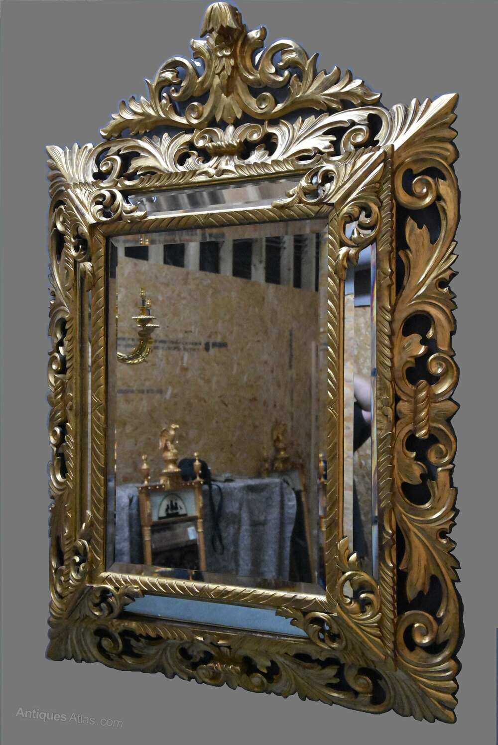 A large late 19th century highly decorative Italian superbly carved giltwood cushion mirror, probably Florentine.