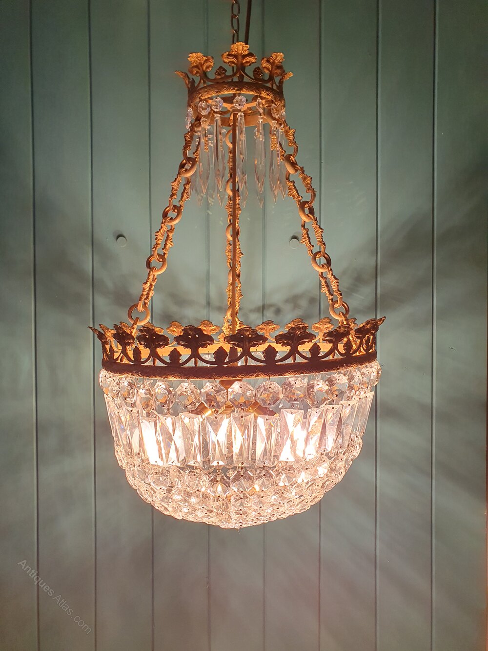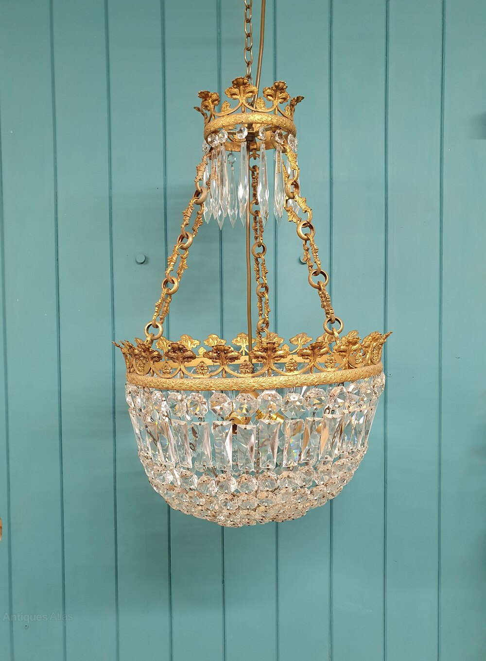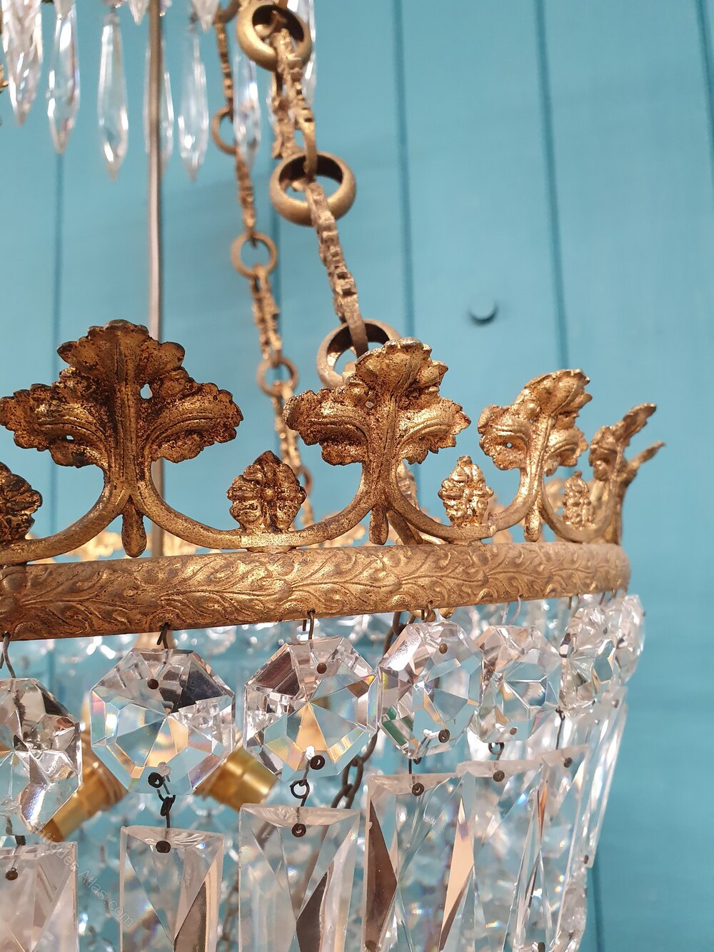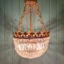 This chandelier has a brass ring at the top with leaf and flower decoration. It is decorated with long spikes. From this, the piece hangs on three decorative chains. The main ring is also decorated with leaves and flowers. From this hangs the large bag with prisms, held together at the bottom with a brass clasp. The piece, without the chain at the top, measures 28 cm. This piece comes with three large bayonet bulb holders (B22).