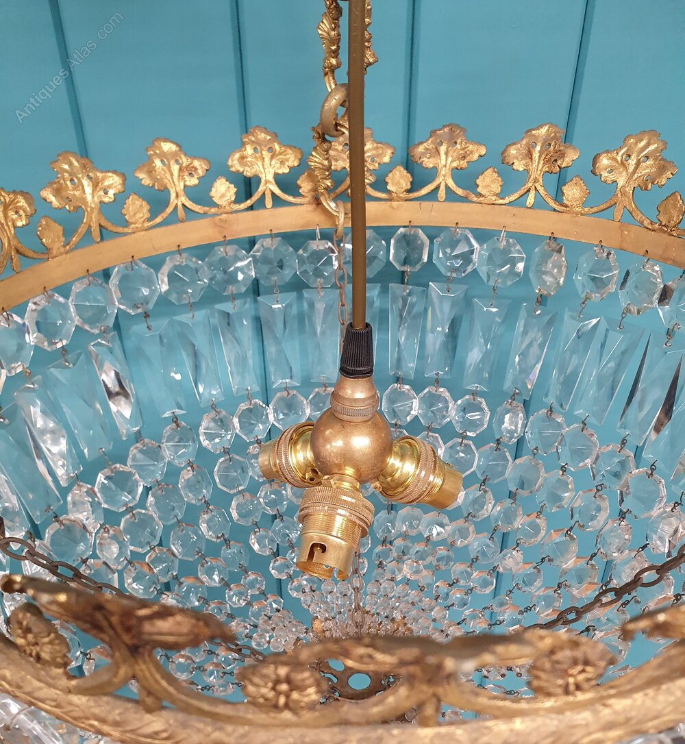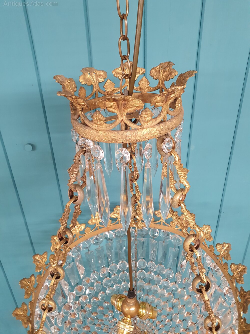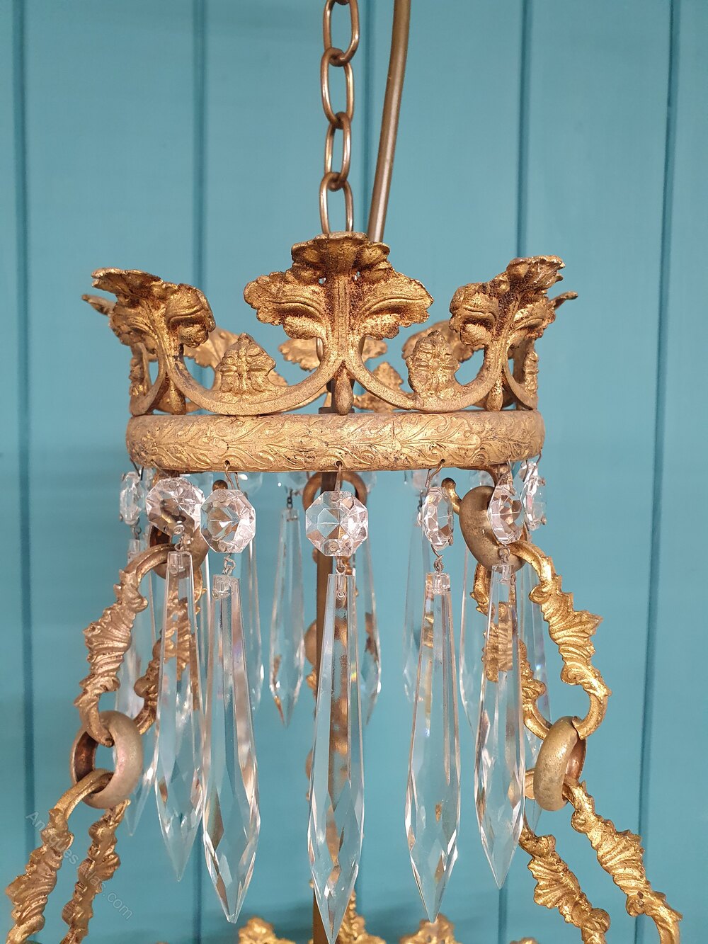 This chandelier has a brass ring at the top with leaf and flower decoration. It is decorated with long spikes. From this, the piece hangs on three decorative chains. The main ring is also decorated with leaves and flowers. From this hangs the large bag with prisms, held together at the bottom with a brass clasp. The piece, without the chain at the top, measures 28 cm. This piece comes with three large bayonet bulb holders (B22).