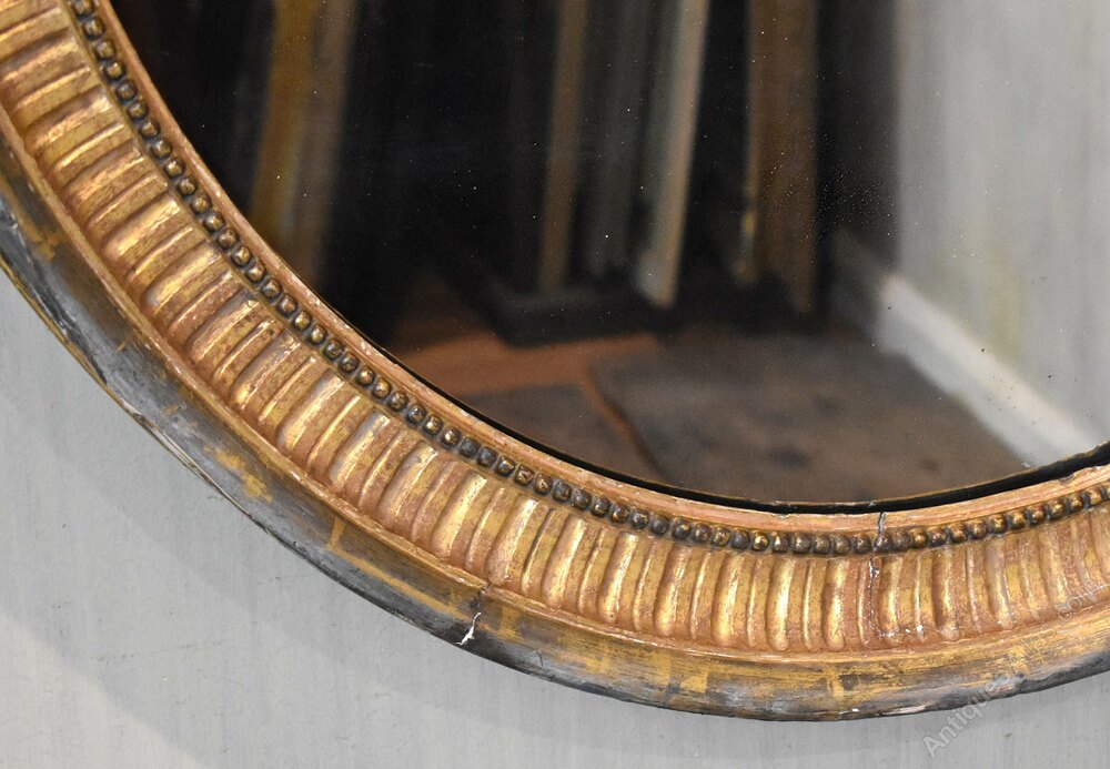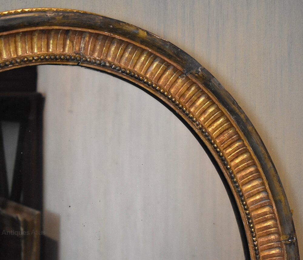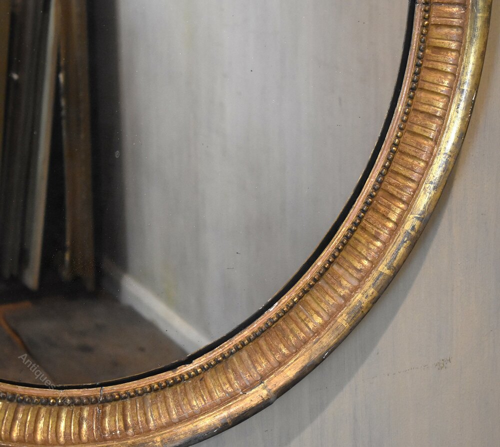 Fine quality large oval gilt mirror dating to the early nineteenth century. The mirror is very simple in form and of classical design with a small acanthus leaf design to the outside edge, cavetto moulding and a beaded inner edge. The original gilding is two tones in colour, alternating between a grey and red bole. The whole is in good antique condition with the usual wear and a small amount of repair in areas. The mirror plate is old and has some foxing and age though I am unsure if it is the original. The whole is a great decorative piece with a superb country house look. C.1830.