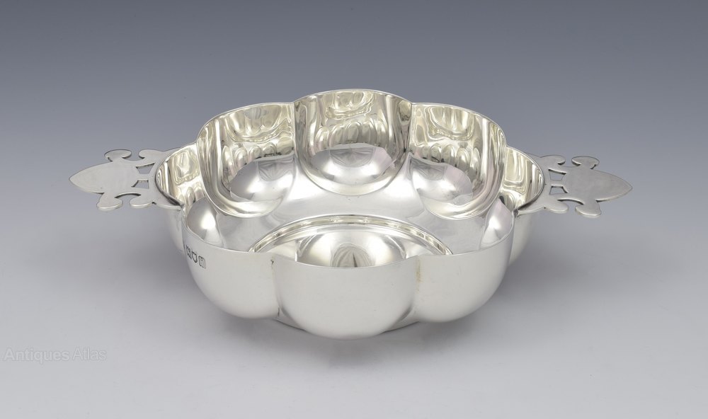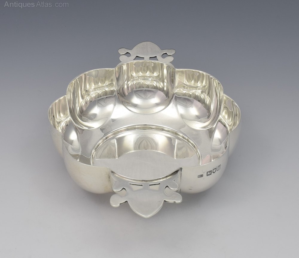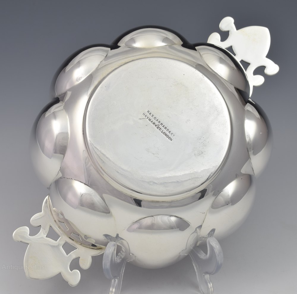 Very attractive round lobed silver quaich of art nouveau style with pretty pierced, organic form side handles. Hallmarked for London 1904, maker Sebastian Henry Garrard and further marked to the base R. & S. Garrard & Co., Haymarket, London.
