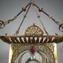 A beautiful English high quality antique hallway hanging lantern, very well made in cast brass with an ornate fretwork top and bottom along with clear cut glass panes and diamond shaped cranberry glass panes. Leaded to the centres are unusual oval convex and cut glass panes. In superb condition, all very complete and intact and complete with the original four ornate hanging chains. English and dating to around 1860-70. to the top of the chain hook, the height is 75cm. The actual lantern is 45cm high.
