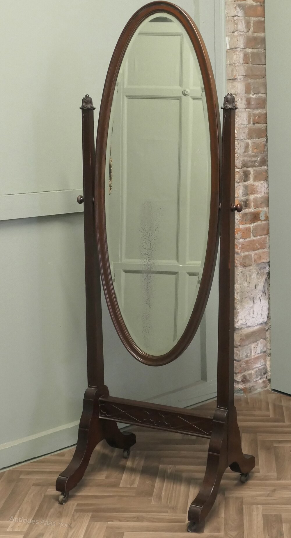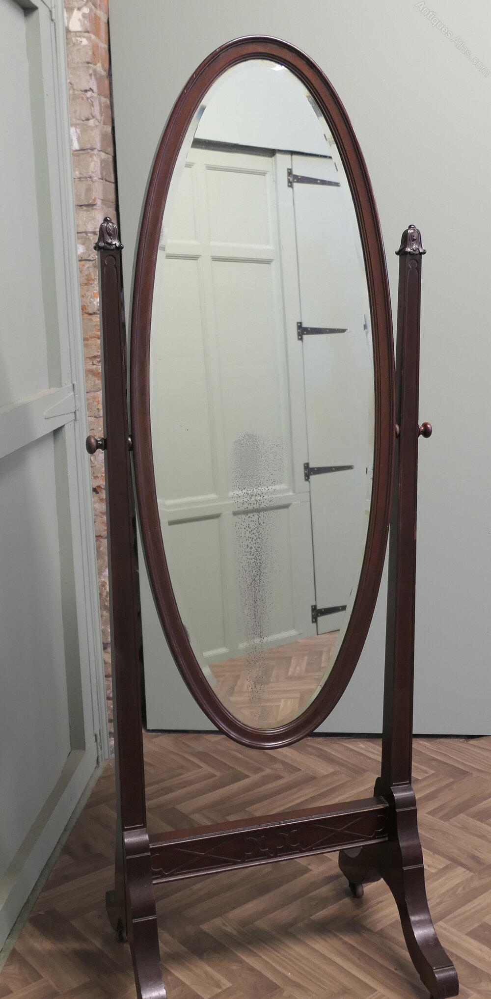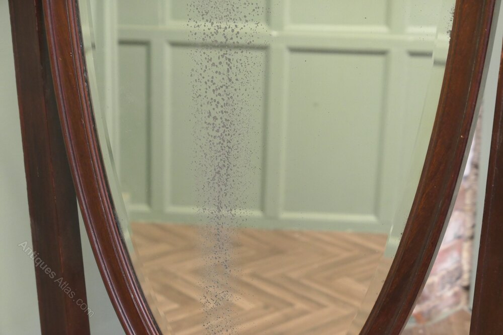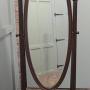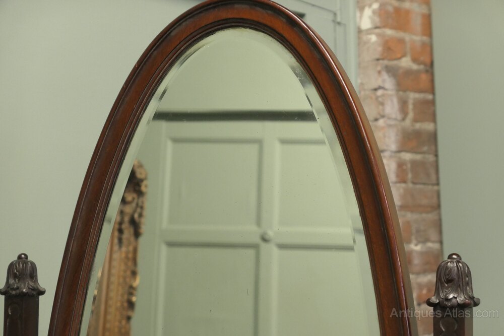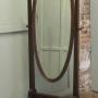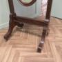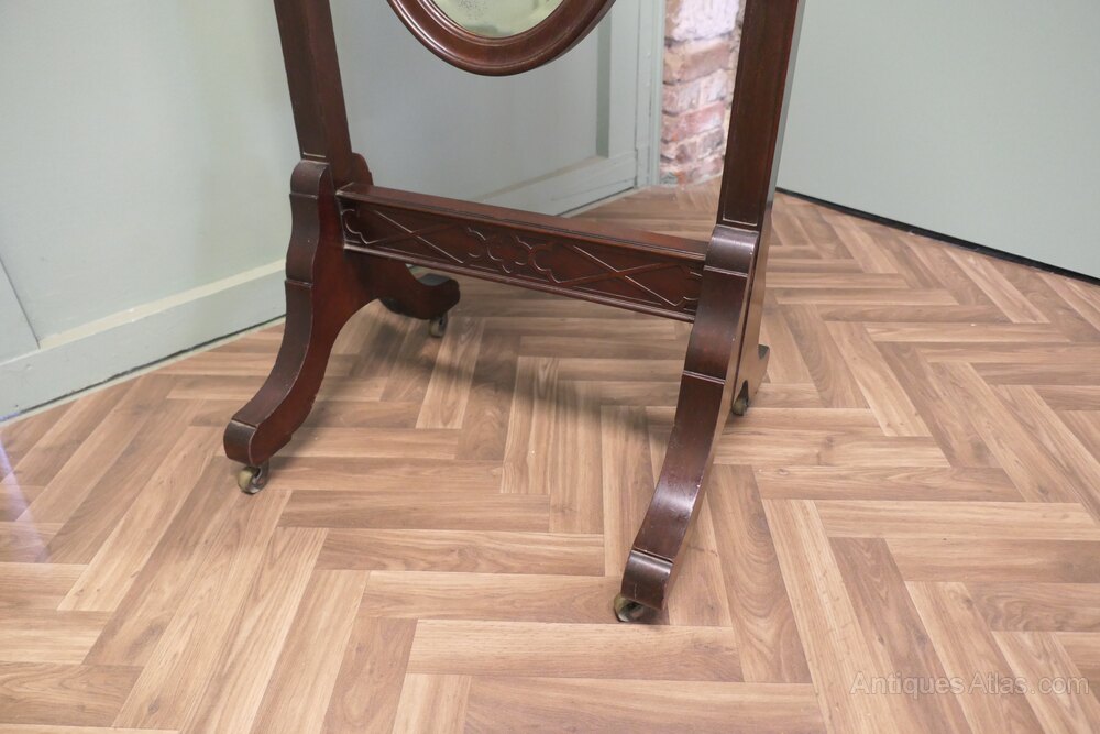 This is a very stylish and elegant piece it has an Oval mirror, which sits firmly in its decorative stand it is held in place either tilting or upright by chunky knobs, the mirror has decorative wooden finials and dainty brass casters on the feet and is in very good condition with some shadow foxing to lower half of the bevelled mirror