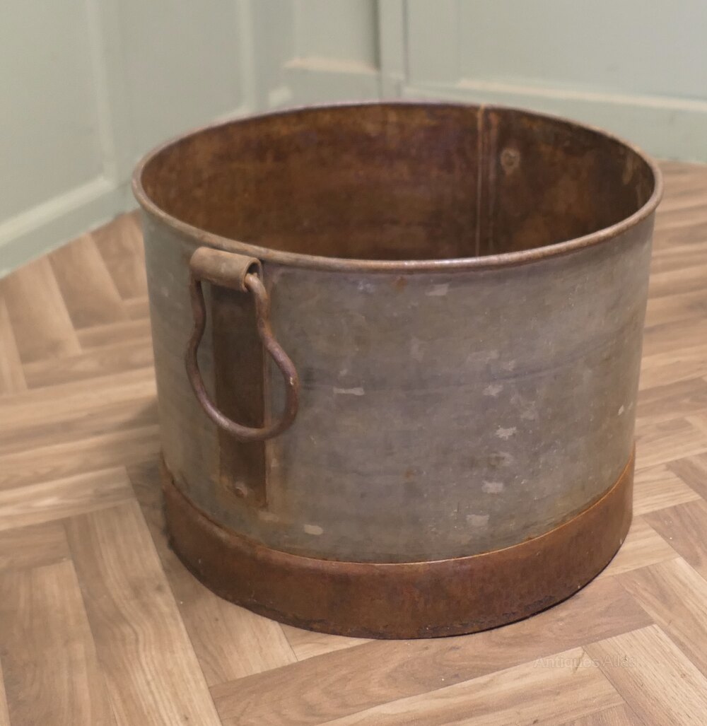 This is a large galvanised pot it has swing handles for carrying, an unusual piece of brutalist design, this is a strong piece and it would make a great log carrier