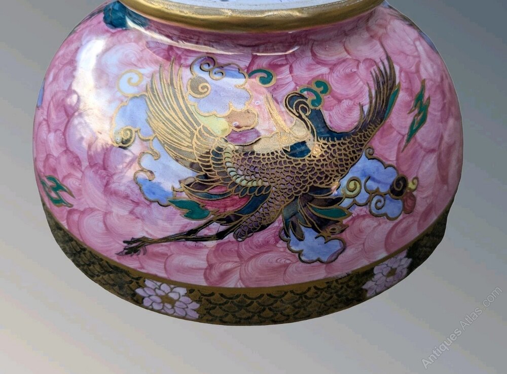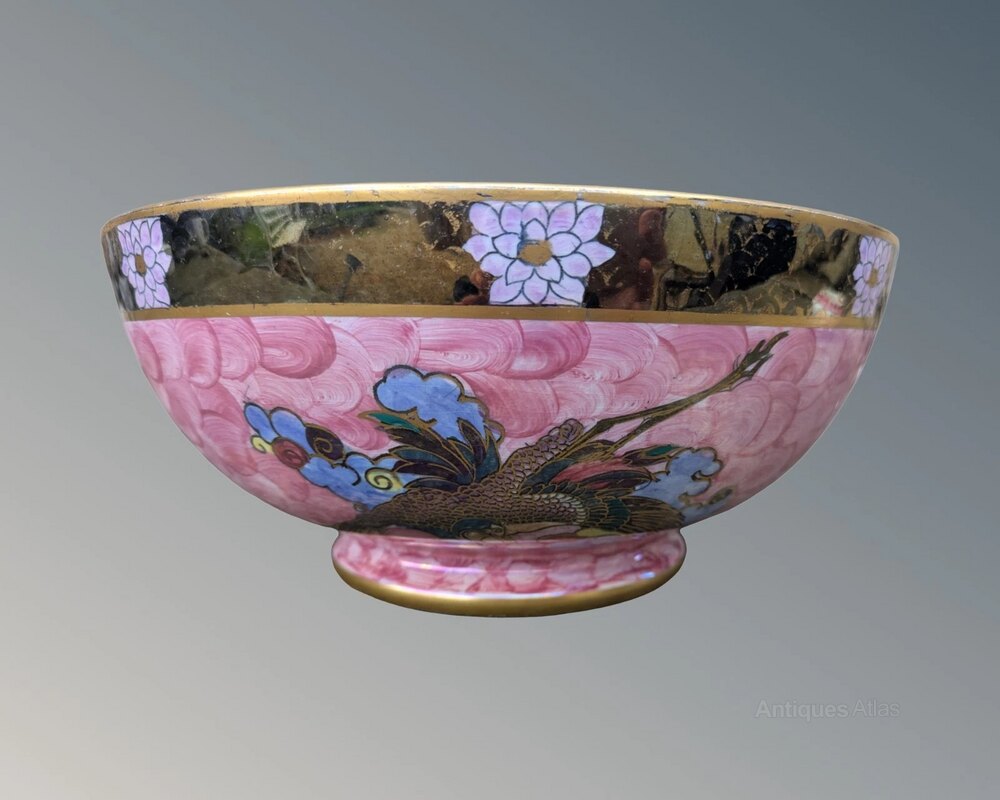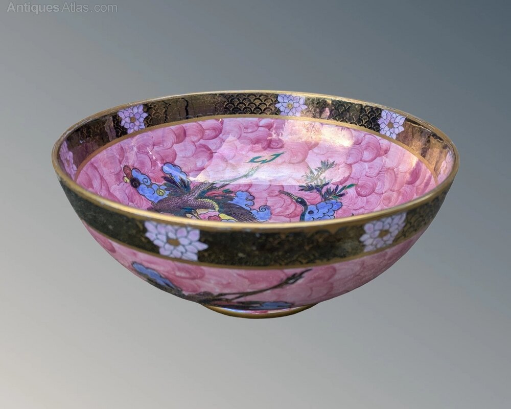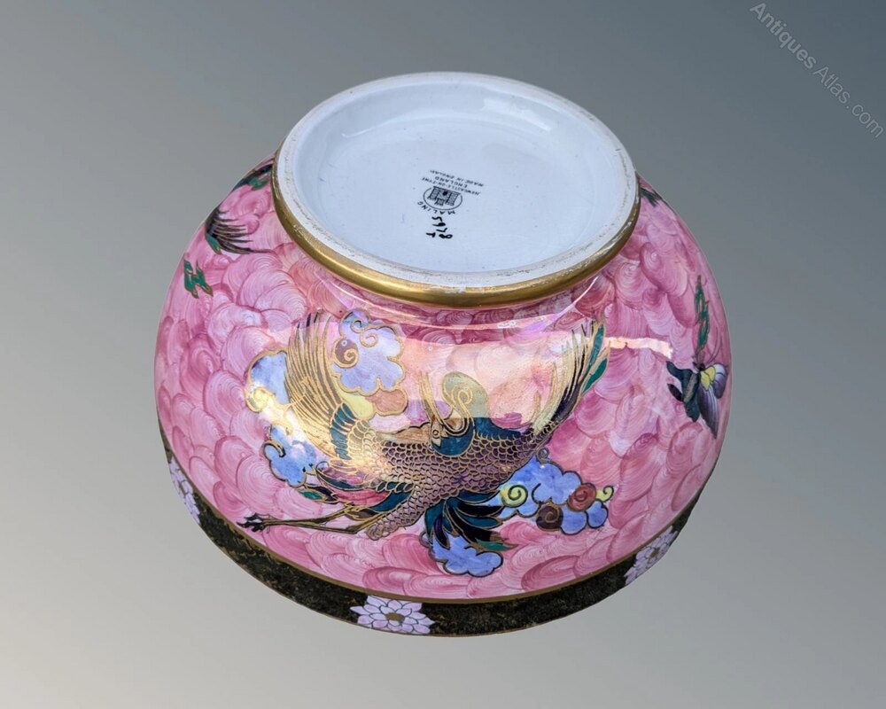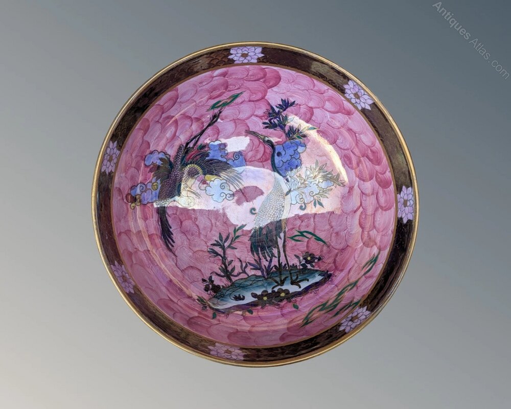 A good Maling pink lustre bowl with rare heron design in perfect condition dating from 1920.