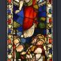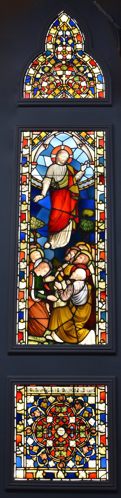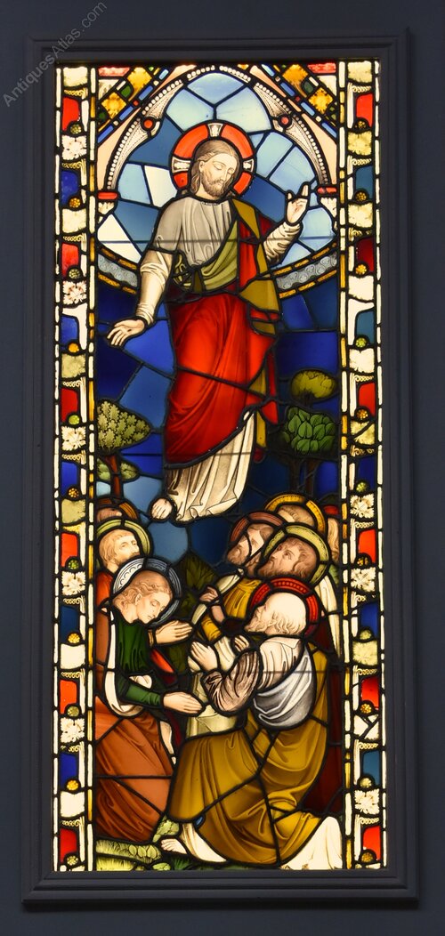 The middle section, of rectangular form, consists of various pieces of coloured glass depicting the Ascension of Jesus as He ascends to Heaven the Apostles watch him below with a leaf and berry design border, all within a moulded wooden frame.