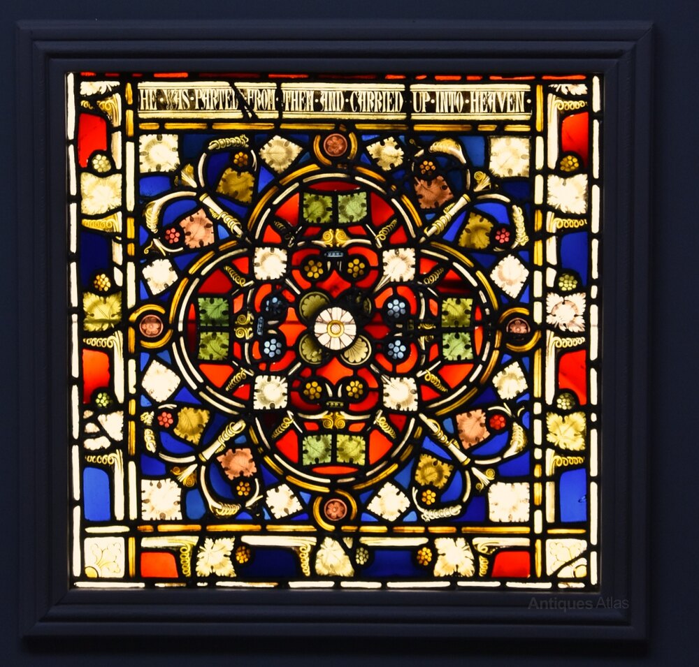 The lower section, of square form, again consisting of various pieces of coloured glass creating a stunning quatrefoil design to the centre and other deigns depicting the words ‘HE WAS PARTED FROM THEM AND CARRIED UP INTO HEAVEN’ to the top with a leaf and berry design border, all within a moulded wooden frame.