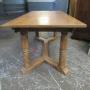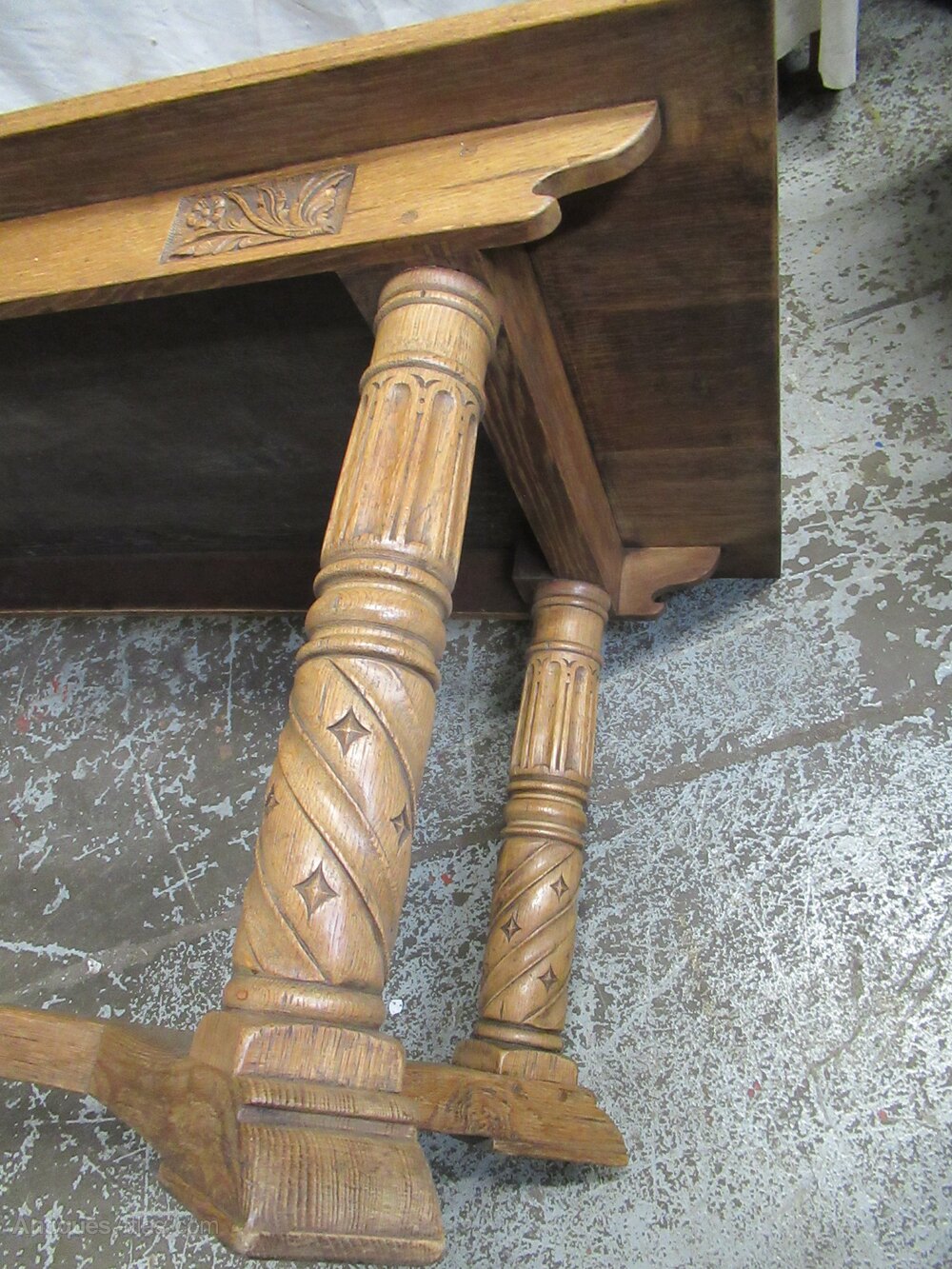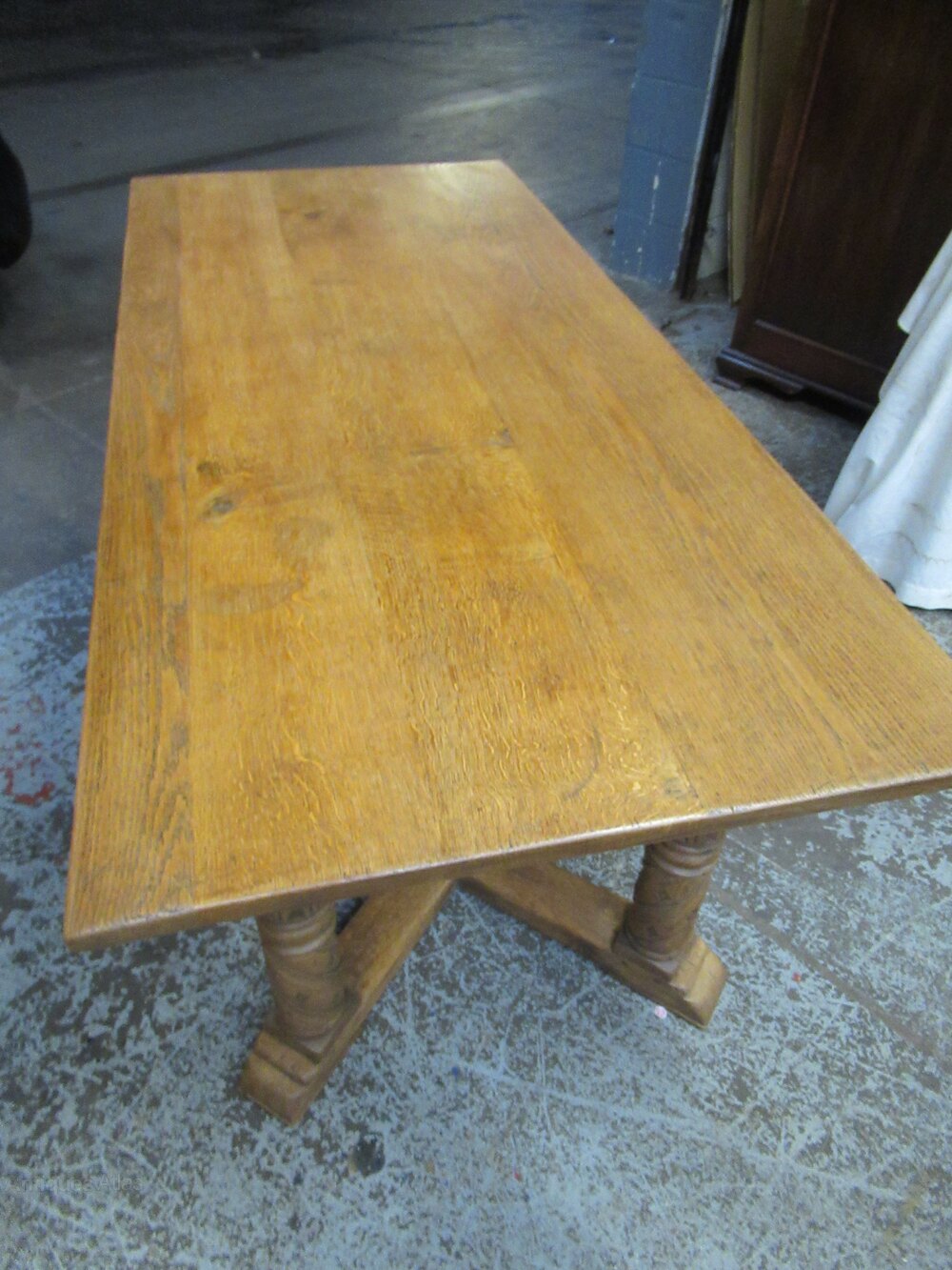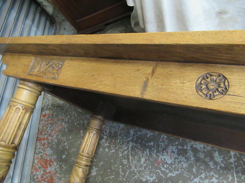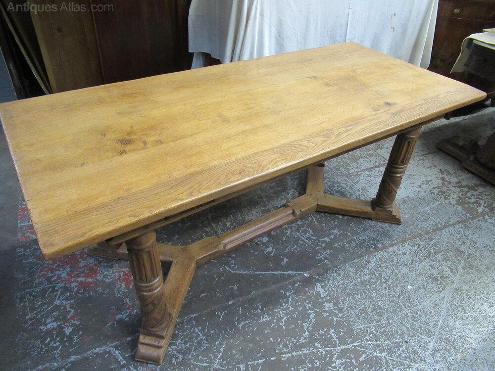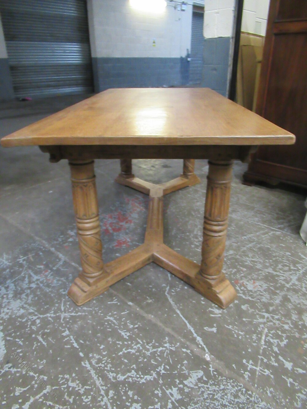 Large oak 1920s refectory dining table , a very solid built piece , with a plank top .Shaped underside frame which as some carved detail . Standing on four turned and carved legs , to A lower Y shaped cross stretcher with shaped feet.