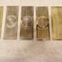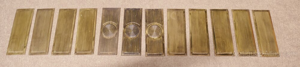 There are 12 brass plates in the set, they are made in pressed brass and 3 have a swirl pattern, the 9 are reeded