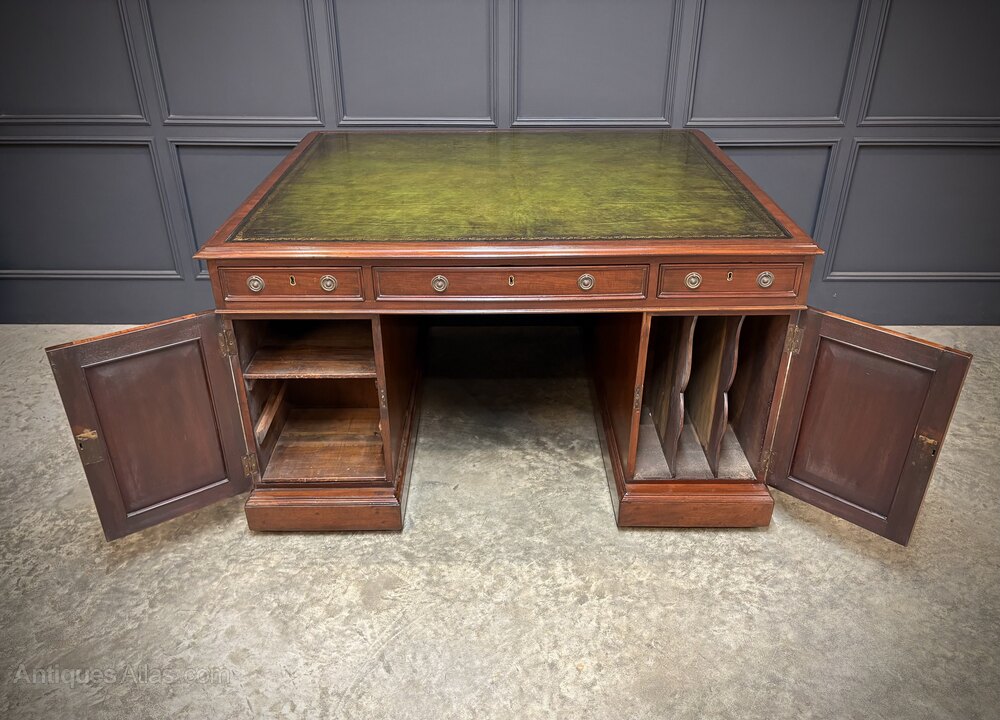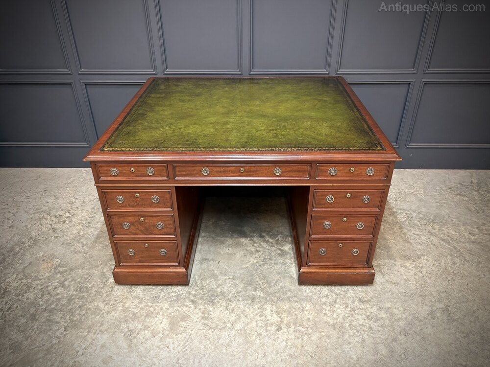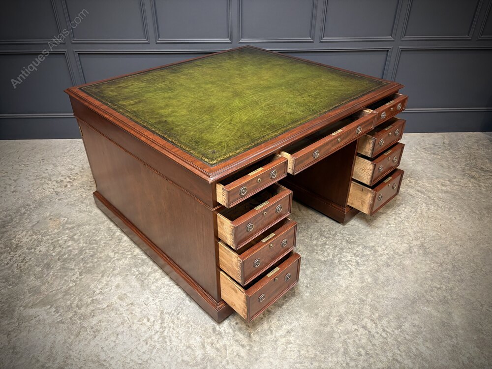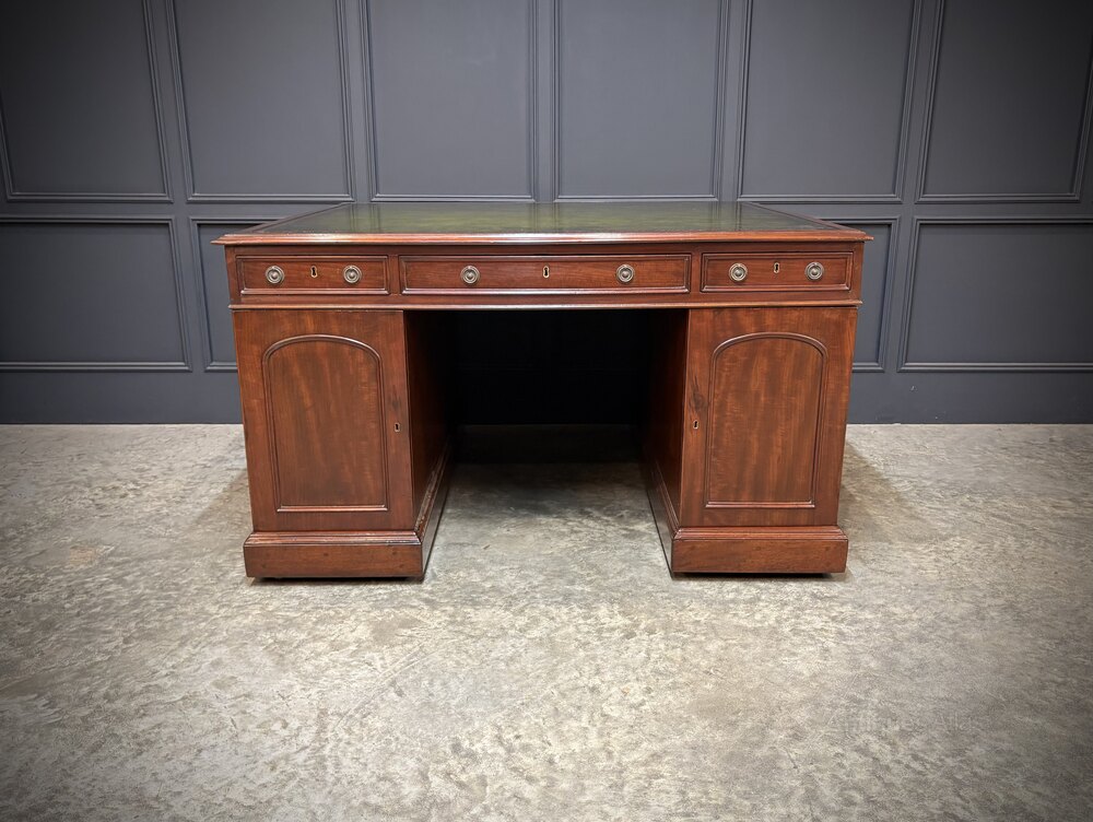 A superb quality 19th-century Victorian partners desk, made using rich mahogany and featuring a newly hand-dyed green leather writing surface. This generously proportioned piece is both elegant and practical, designed to accommodate two people working face-to-face, making it ideal for a library, study, or home office.