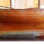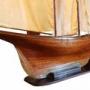 The craftsmanship is notable, with individually pinned strakes, shaped bow and stern sections, and turned wooden masts with period rigging rings and fittings. The deck features a raised hatch and carefully detailed bulwarks, while the elegant sheer and sweeping bow suggest the lines of a fast Victorian racing yacht.
