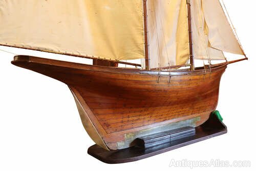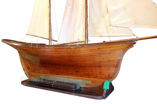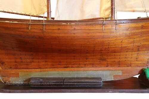 A large and impressive late 19th-century scratch-built model of a ketch-rigged racing yacht, complete with its full complement of original canvas sails. Beautifully constructed, the hull is finely ribbed and planked in the carvel manner, with a planked deck and a lead keel set into the underside for stability.