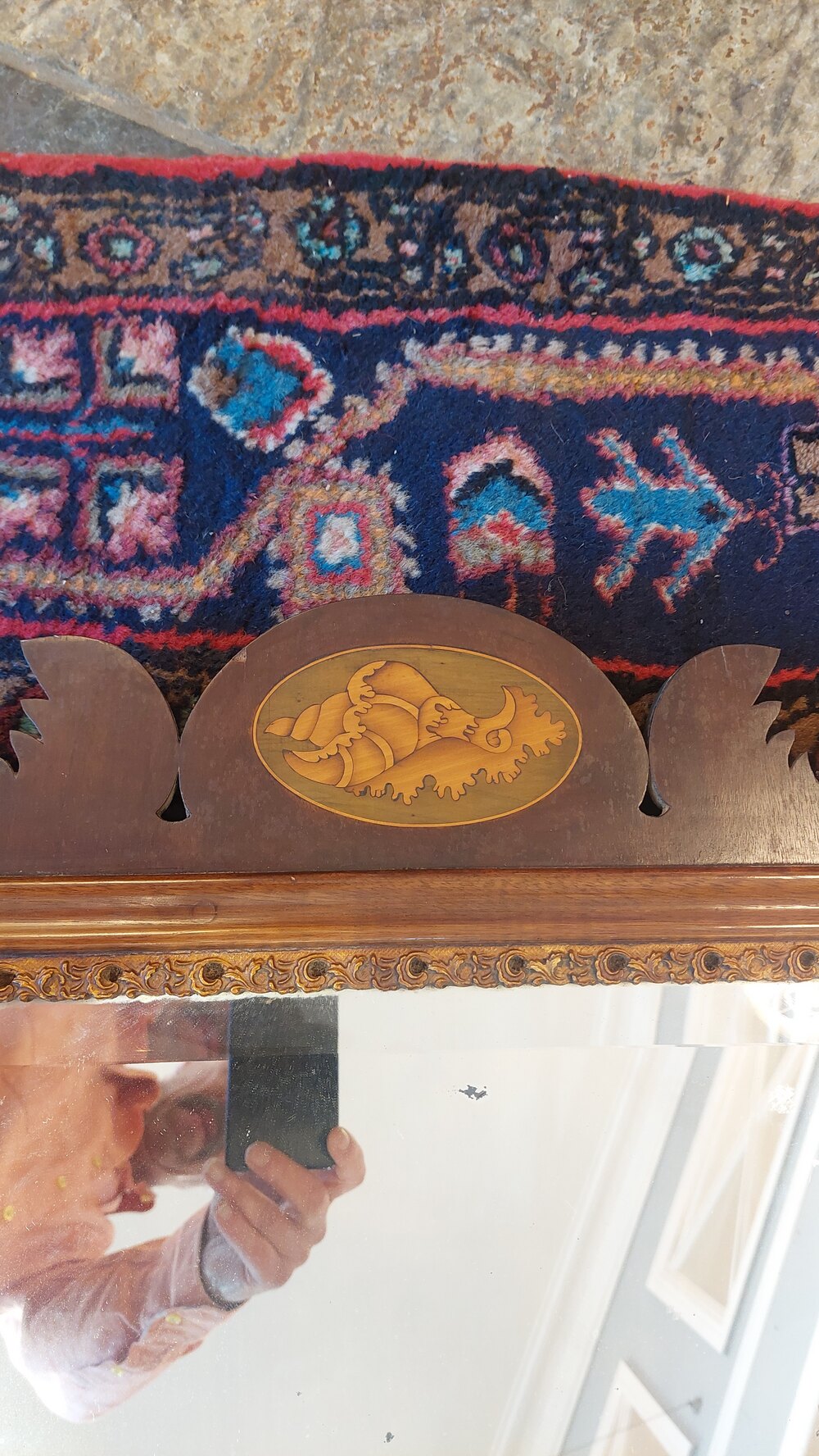 Late 19thC George II Style Walnut & Giltwood Wall Mirror - having a bevelled glass and pierced foliate slip, fret cut frame with gilt HoHo bird and with a shell in satinwood and harewood - 23"w x 41"h