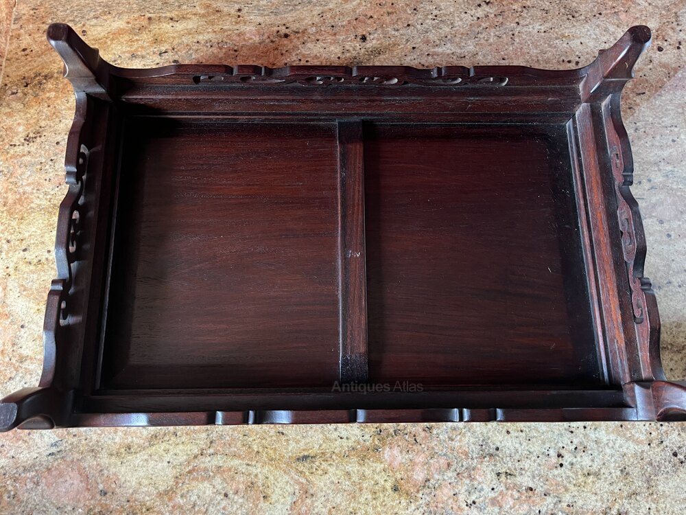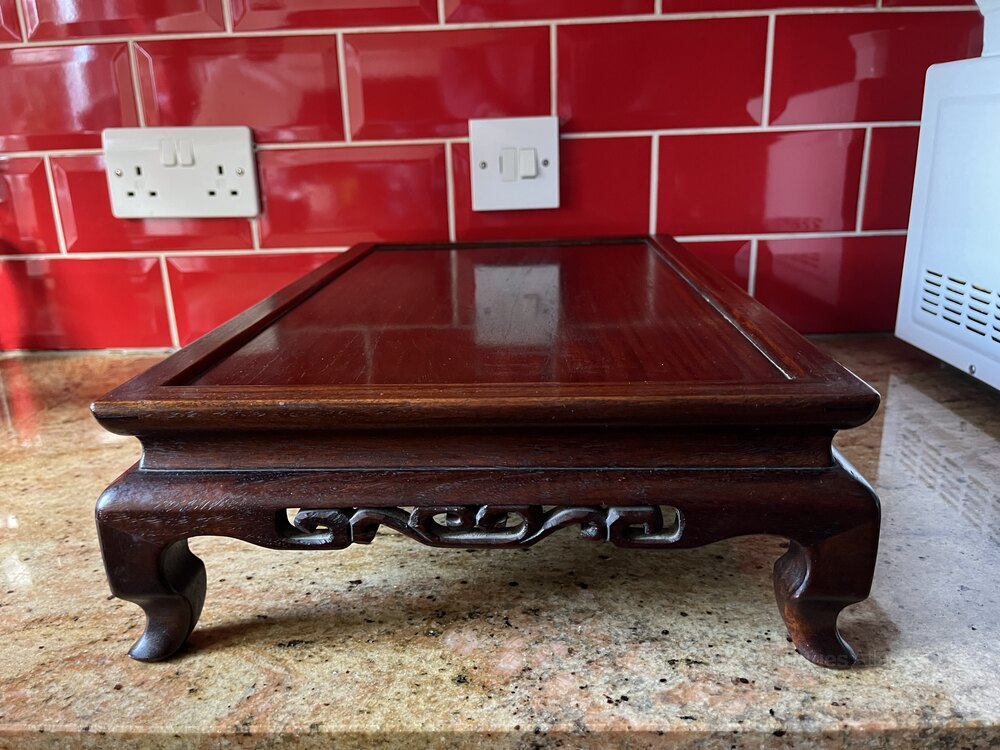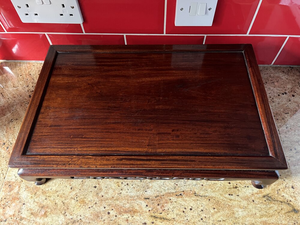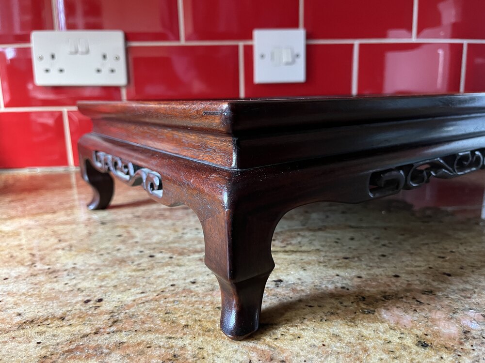 Pretty Chinese antique rosewood stand measuring 47.5cm x 30 x 11.5 (high) and dating from the late Qing dynasty in excellent condition. Pictured with a wine bottle for illustrating size only.
