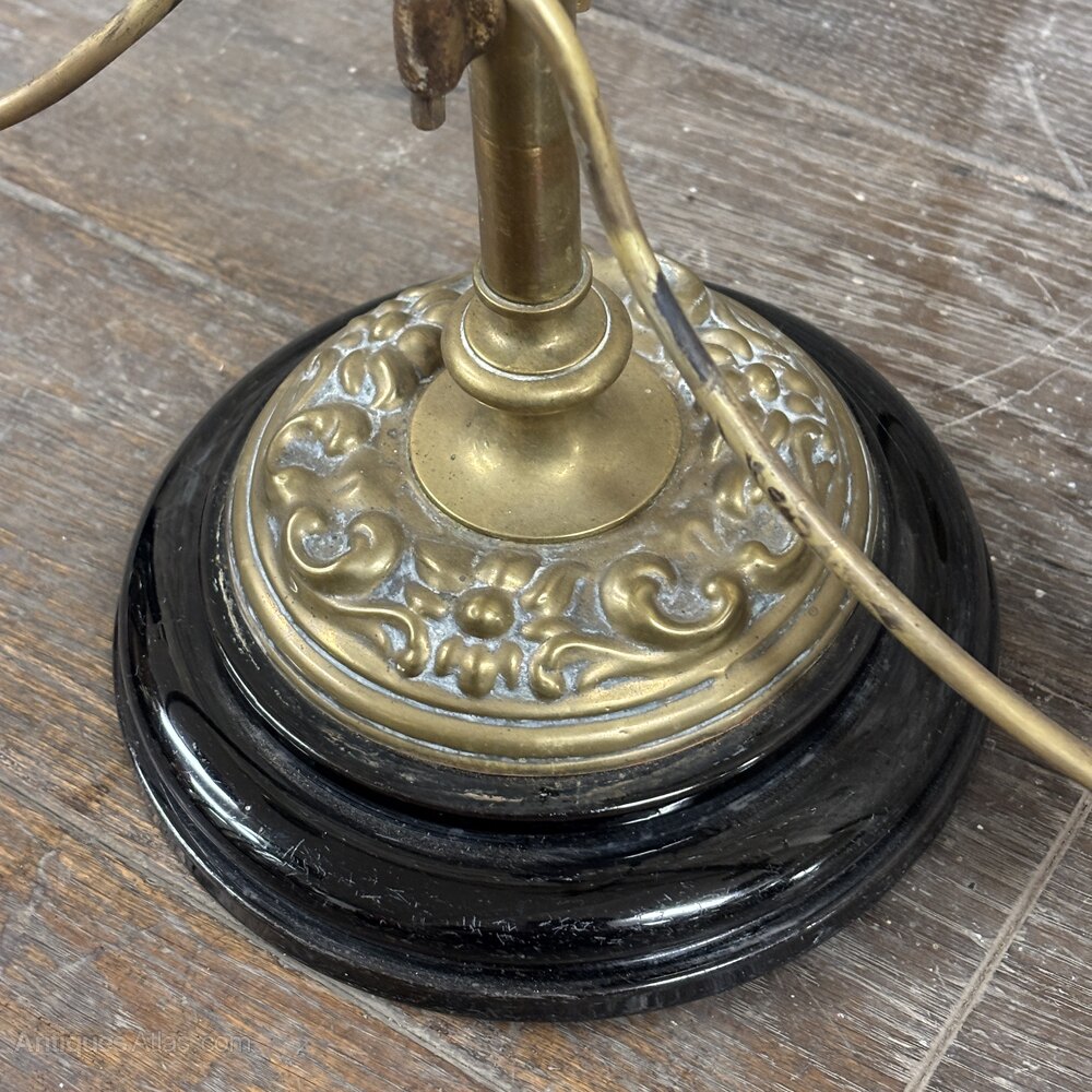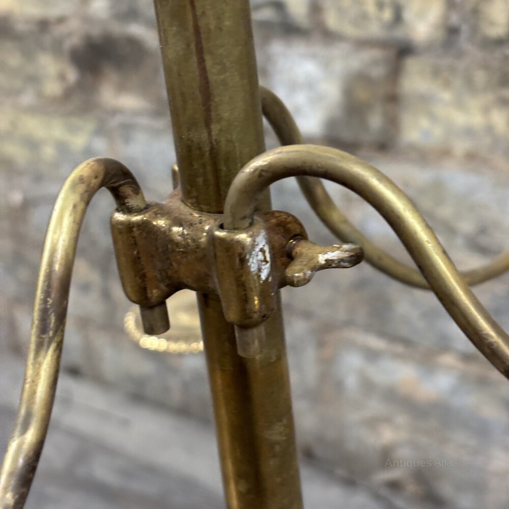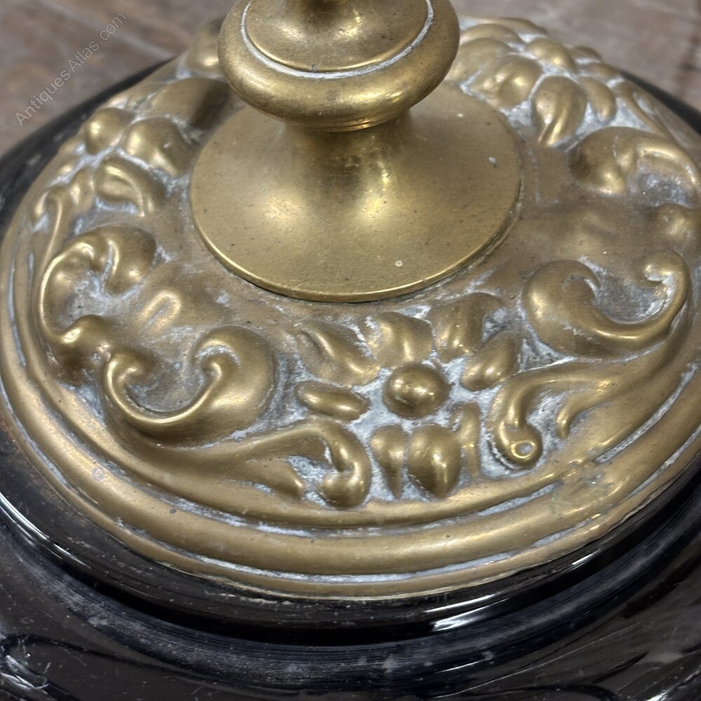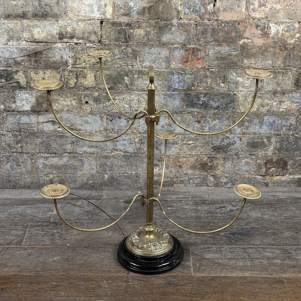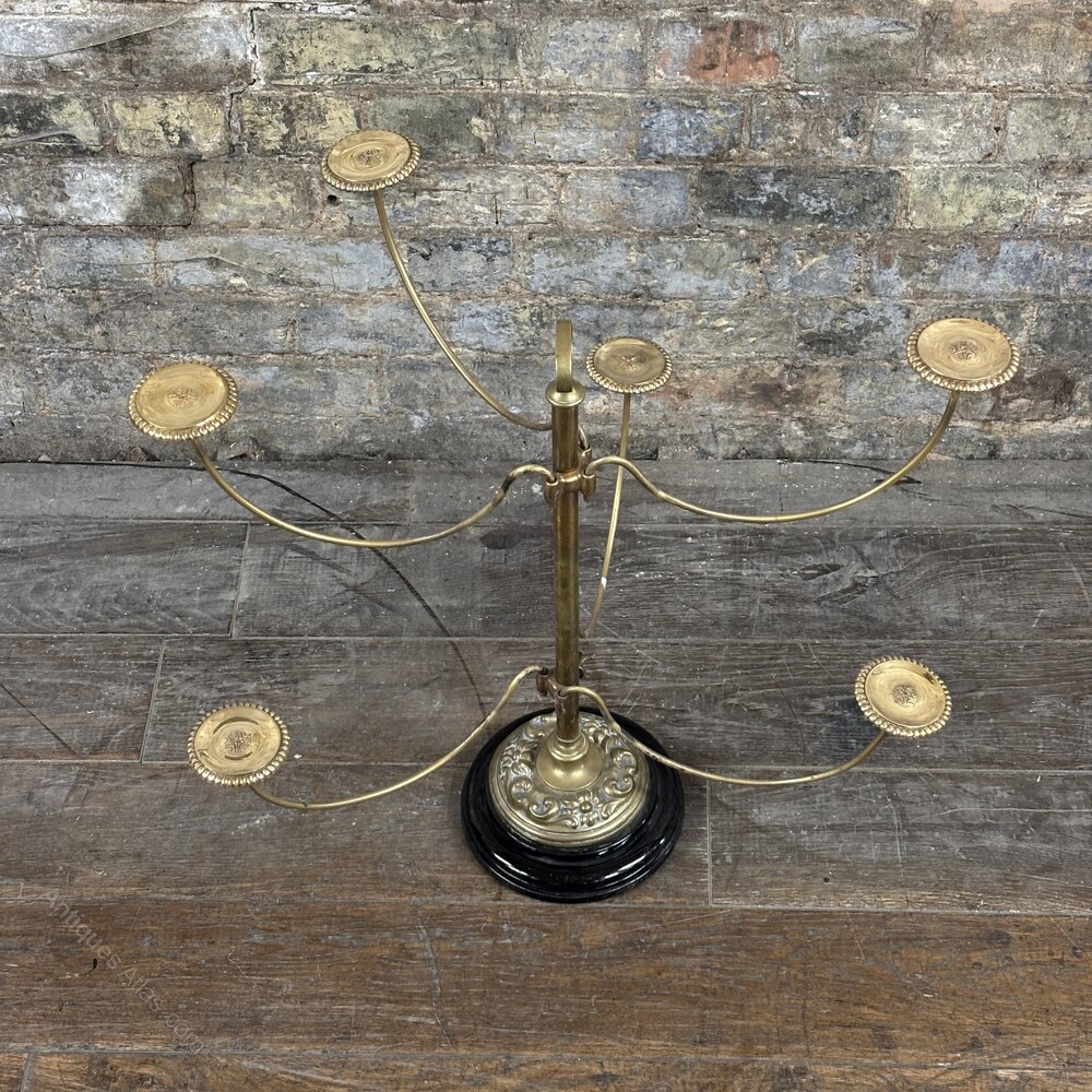 This is a beautifully ornate late 19th century brass and ceramic shop display stand, likely used for showcasing hats or millinery goods. The elegant scroll arms terminate in embossed round plates, ideal for displaying items evenly. Its base is a striking combination of cast brass with floral relief work and a high-gloss black ceramic base.