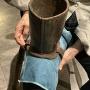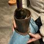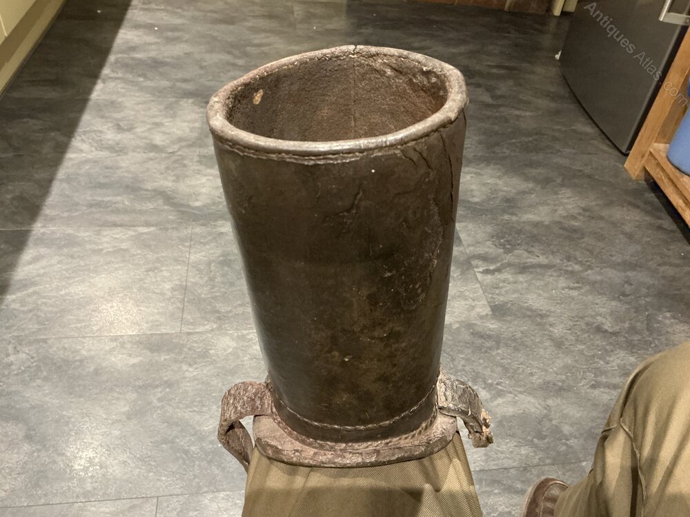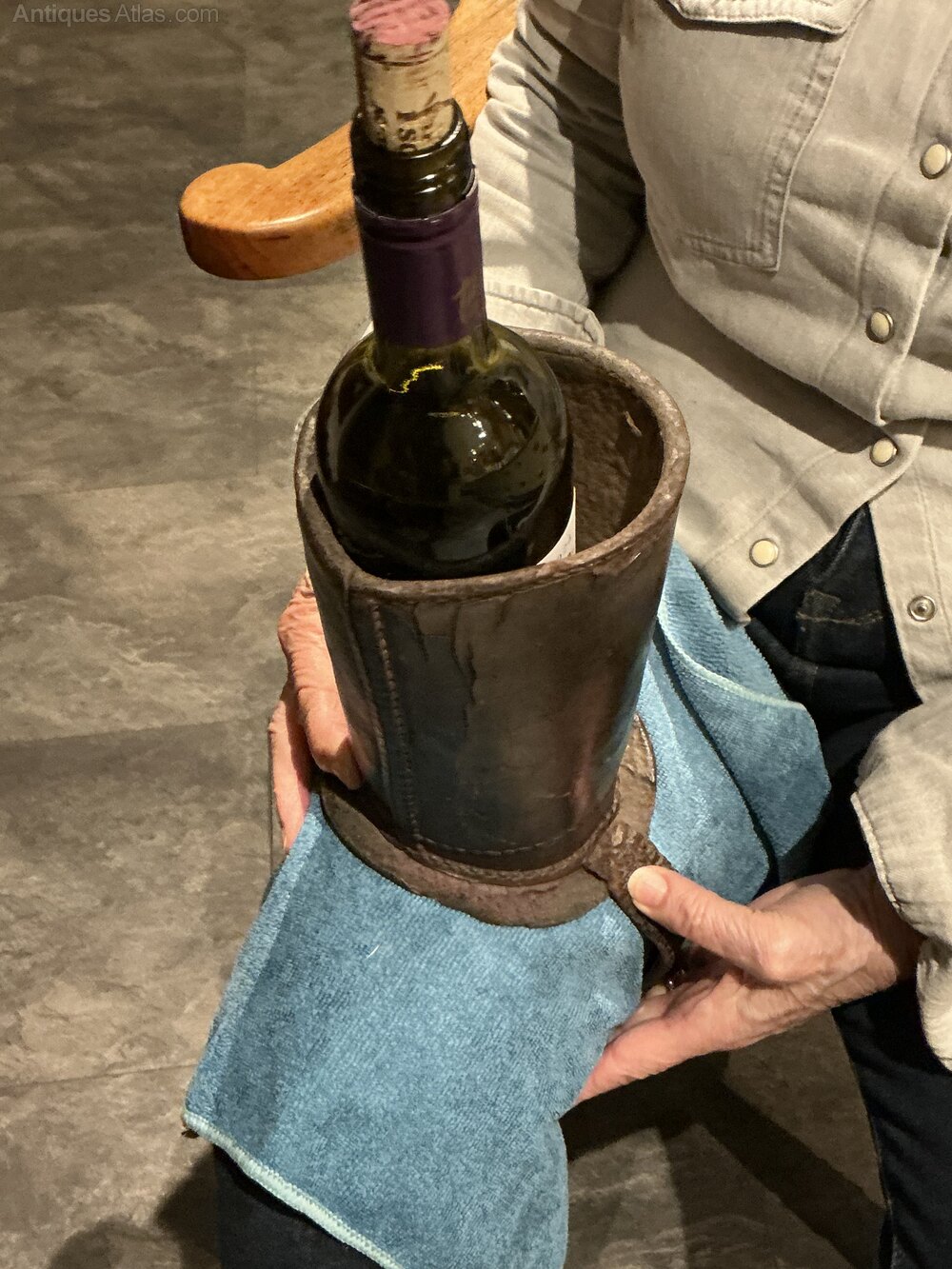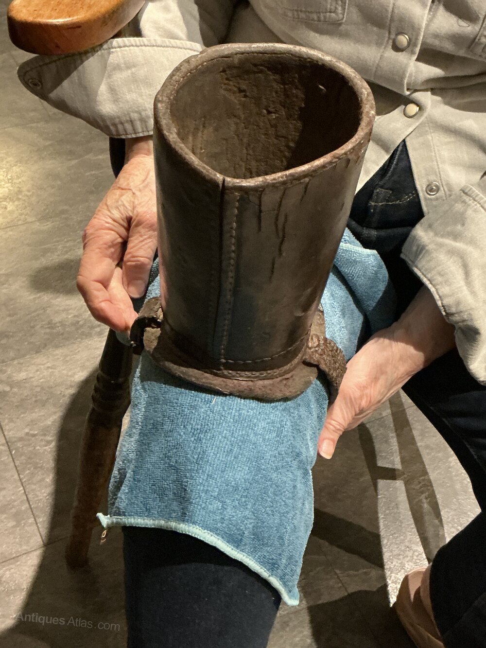 I have been told this item is a leather bottling cup with a thigh strap used to contain a bottle whilst the cork is hammered in with a mallet . I am not so sure, I think it might be a flask holder strapped the the thigh whilst riding . If anyone knows better please tell me ,as I have never come across one before and research has turned up nothing remotely like it . By the way the buckle is missing .It is 20 cms tall and probably dates from mid 19th century or earlier
