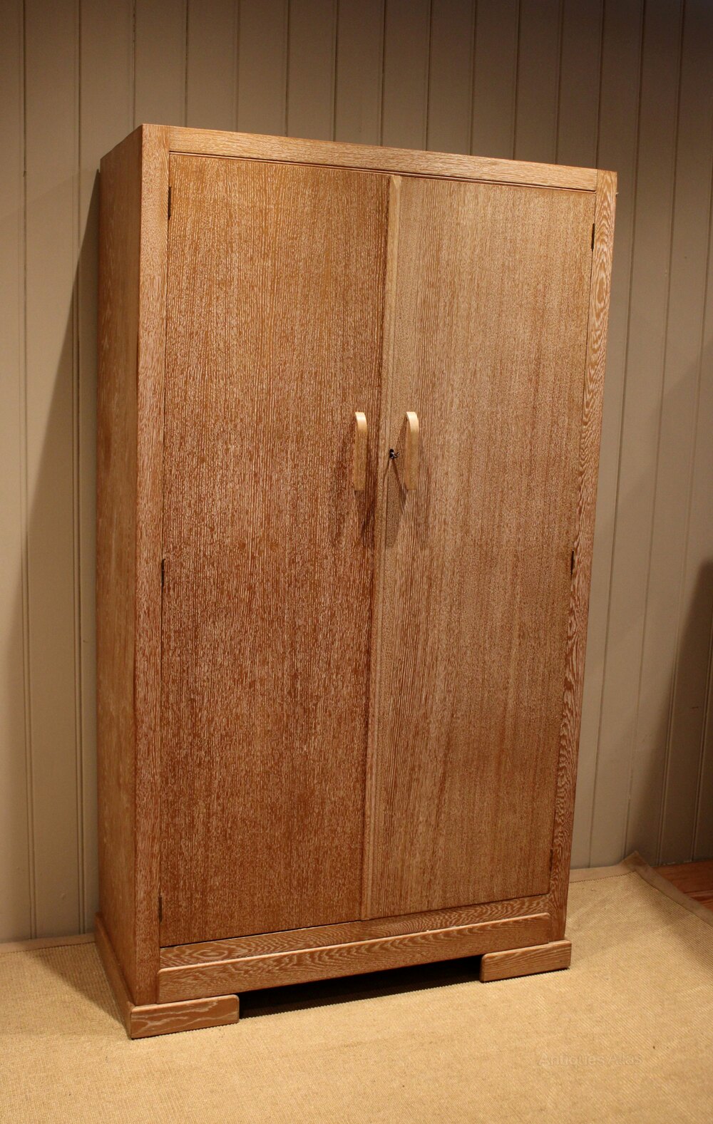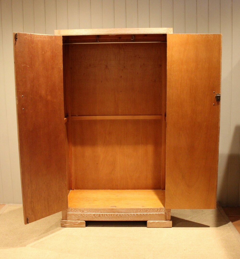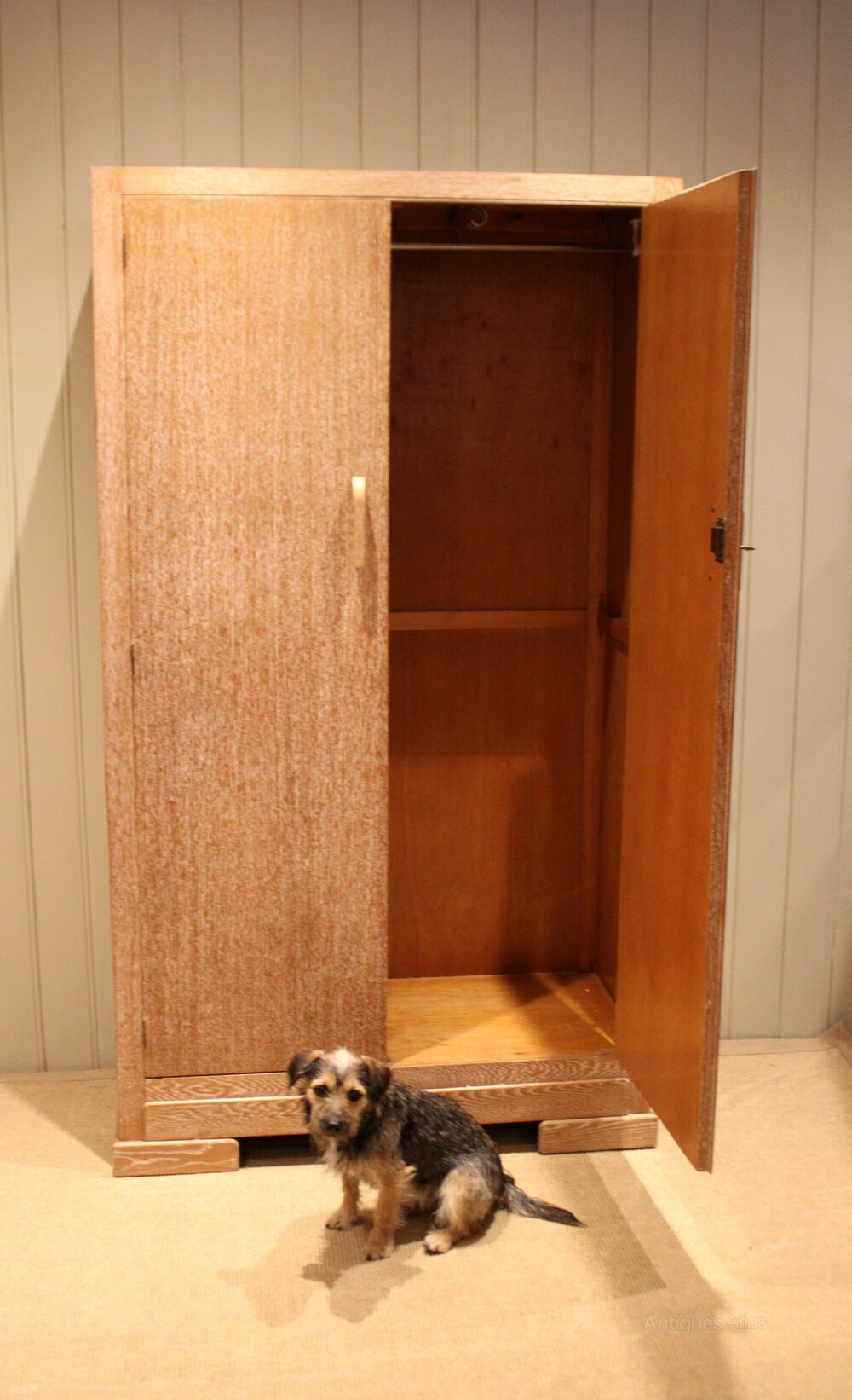 Lightweight limed oak wardrobe having two doors that open to reveal an interior fitted with a hanging rail and some extra hooks , raised on a plinth base . The internal depth is 41 cm .