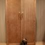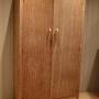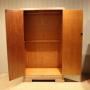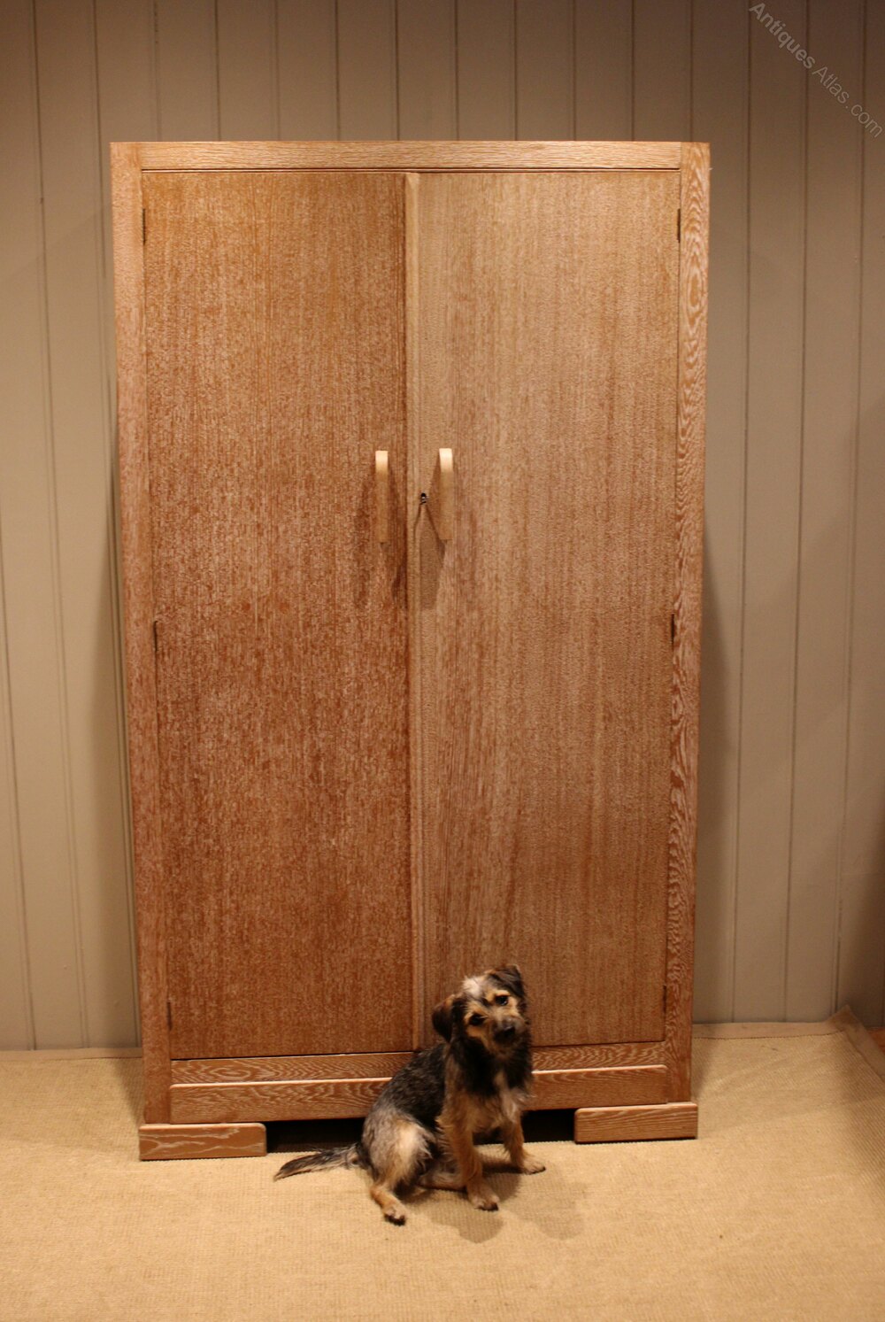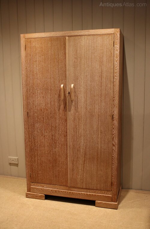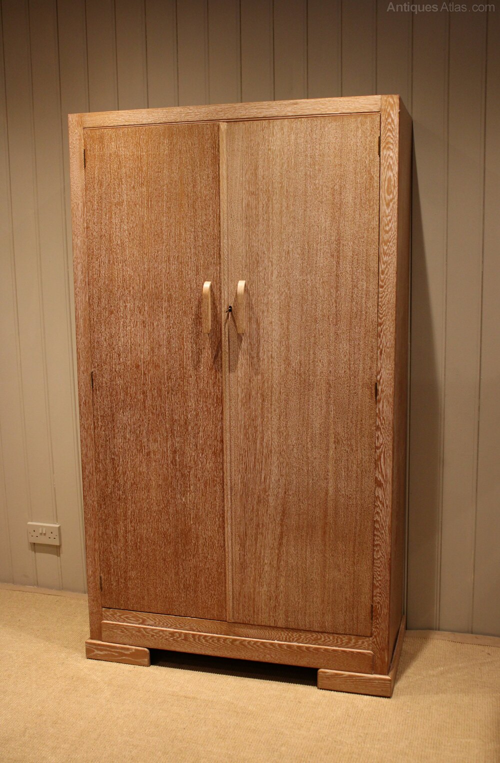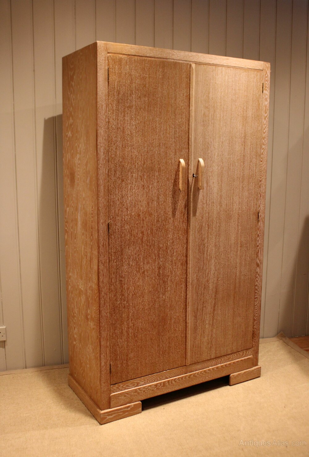 Lightweight limed oak wardrobe having two doors that open to reveal an interior fitted with a hanging rail and some extra hooks , raised on a plinth base . The internal depth is 41 cm .