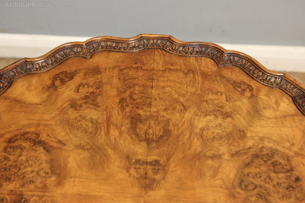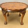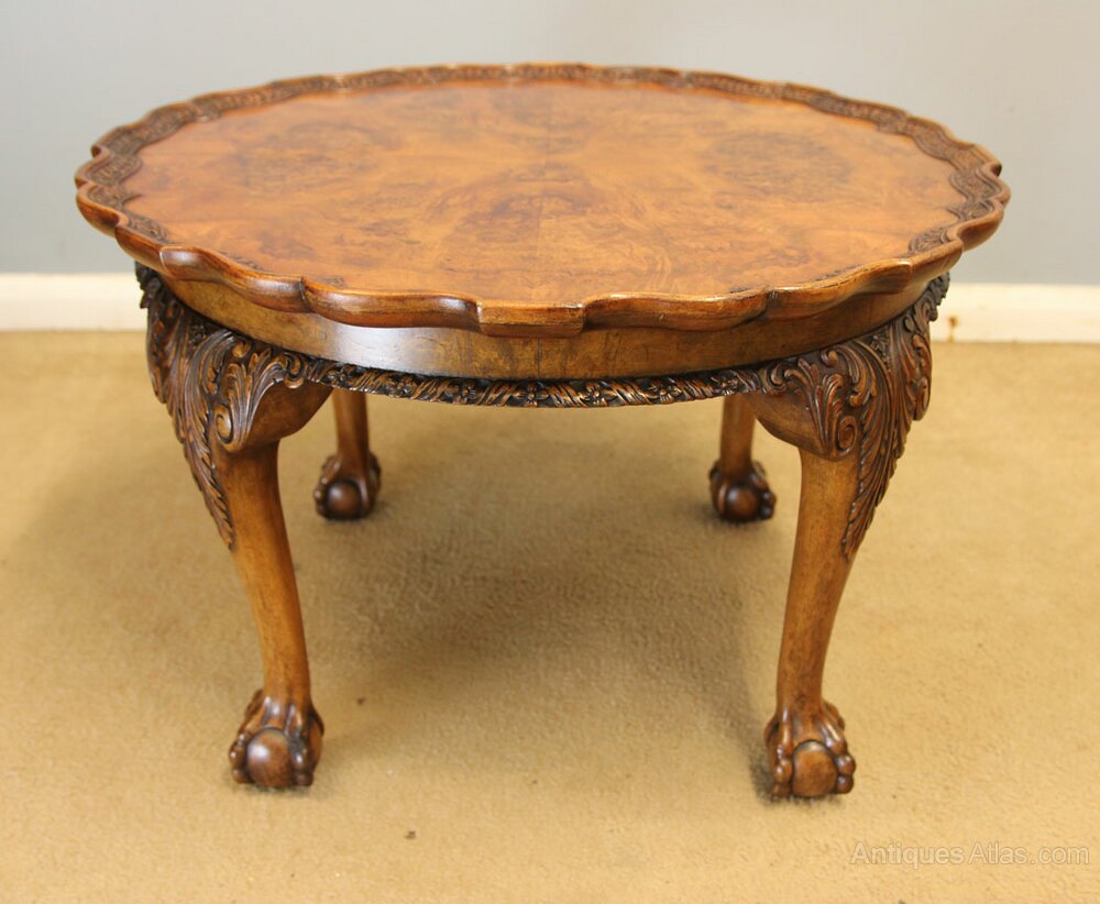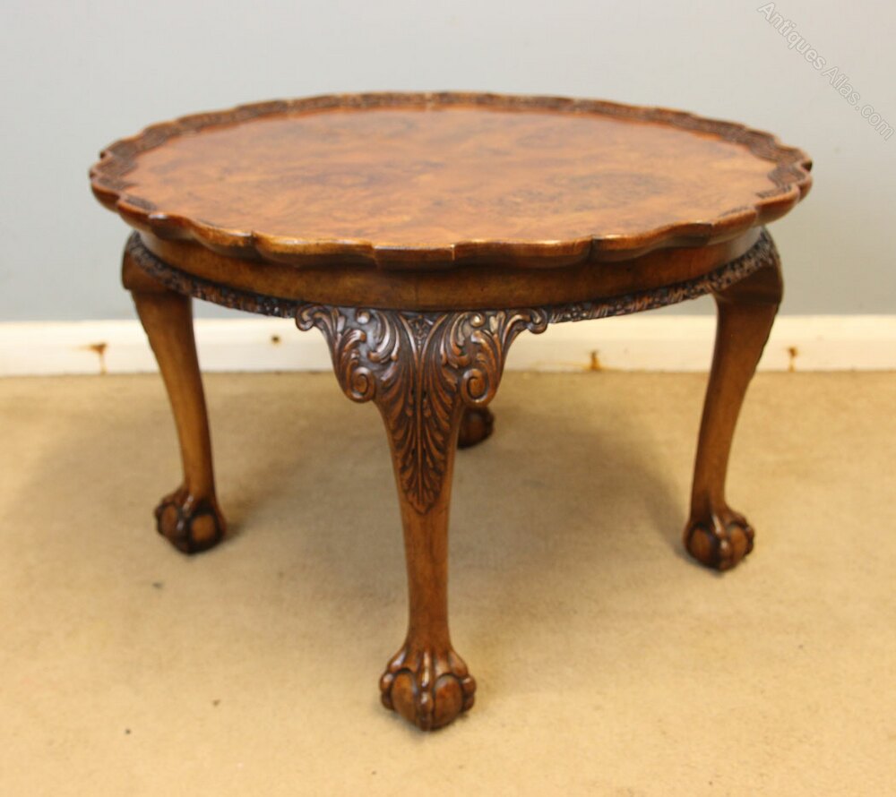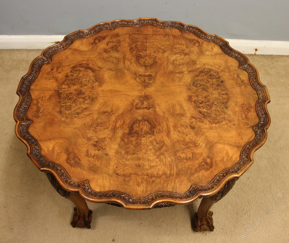 Low Burr Walnut Coffee Table, This Queen Anne Style burr walnut low coffee occasional side table has a burr walnut top with carved decoration and shaped edge, The table is supported by carved legs with ball and claw feet