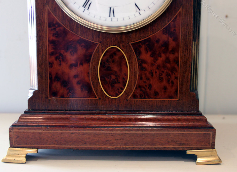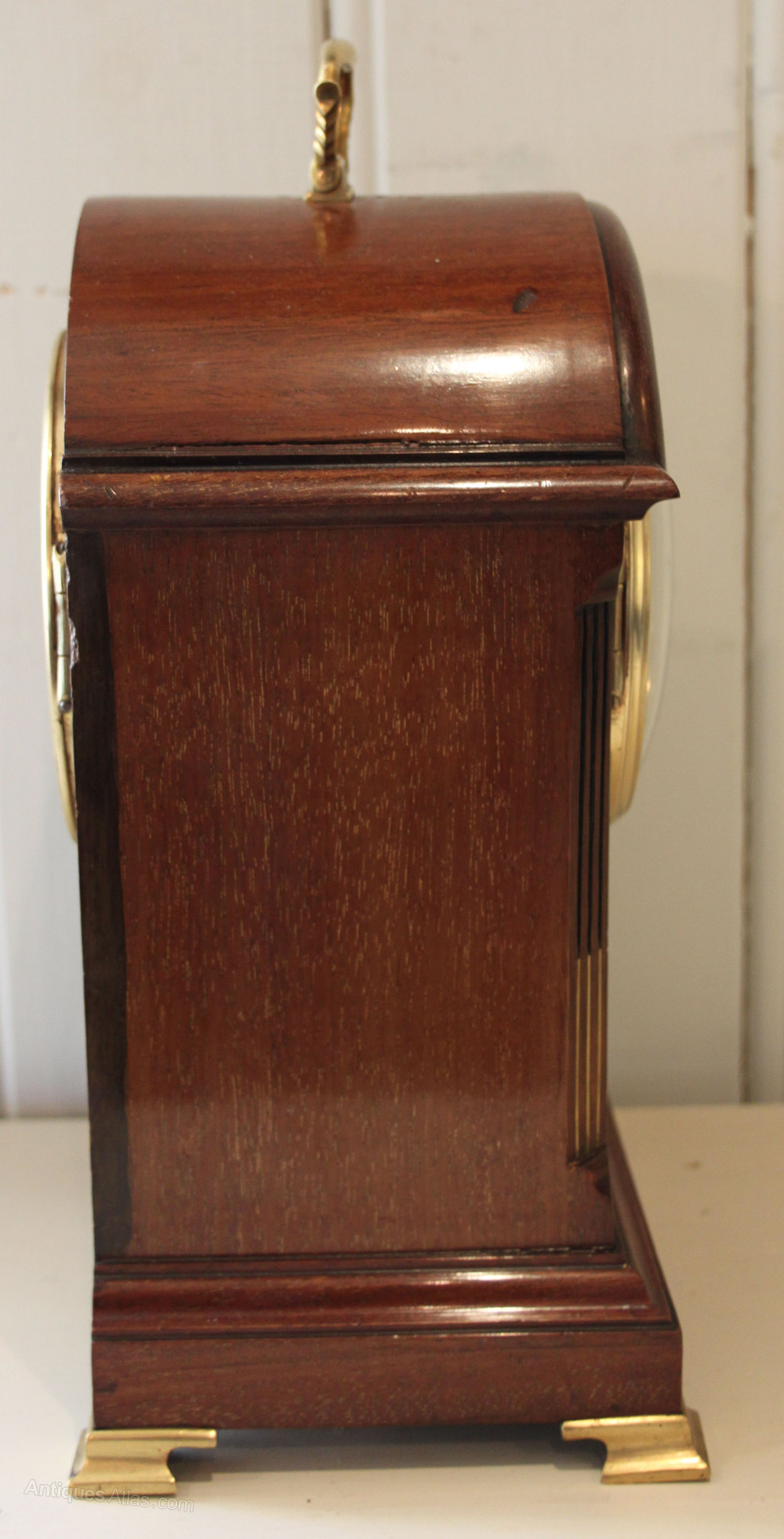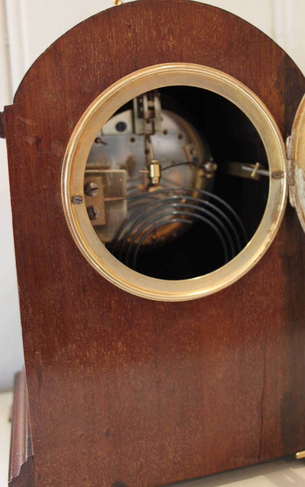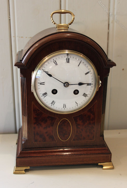A small, English made Edwardian bracket/mantel antique clock. It has a break arch top case, with a brass carrying handle. The canted and reeded sides have inset brass lines. The central oval is inlaid with amboyna wood. The antique clock has a convex dial and white Roman numeral dial.The French 8 day movement strikes the hours and halves on a gong and is stamped WBK Paris