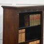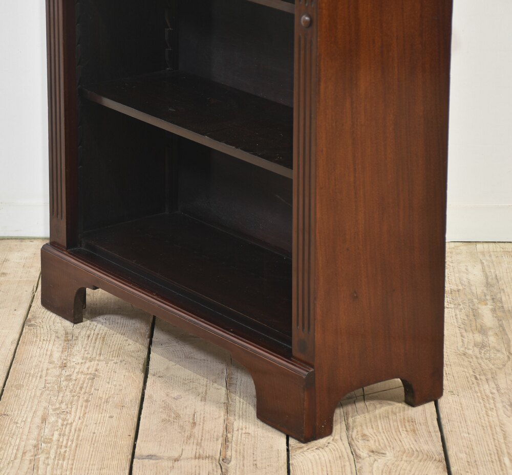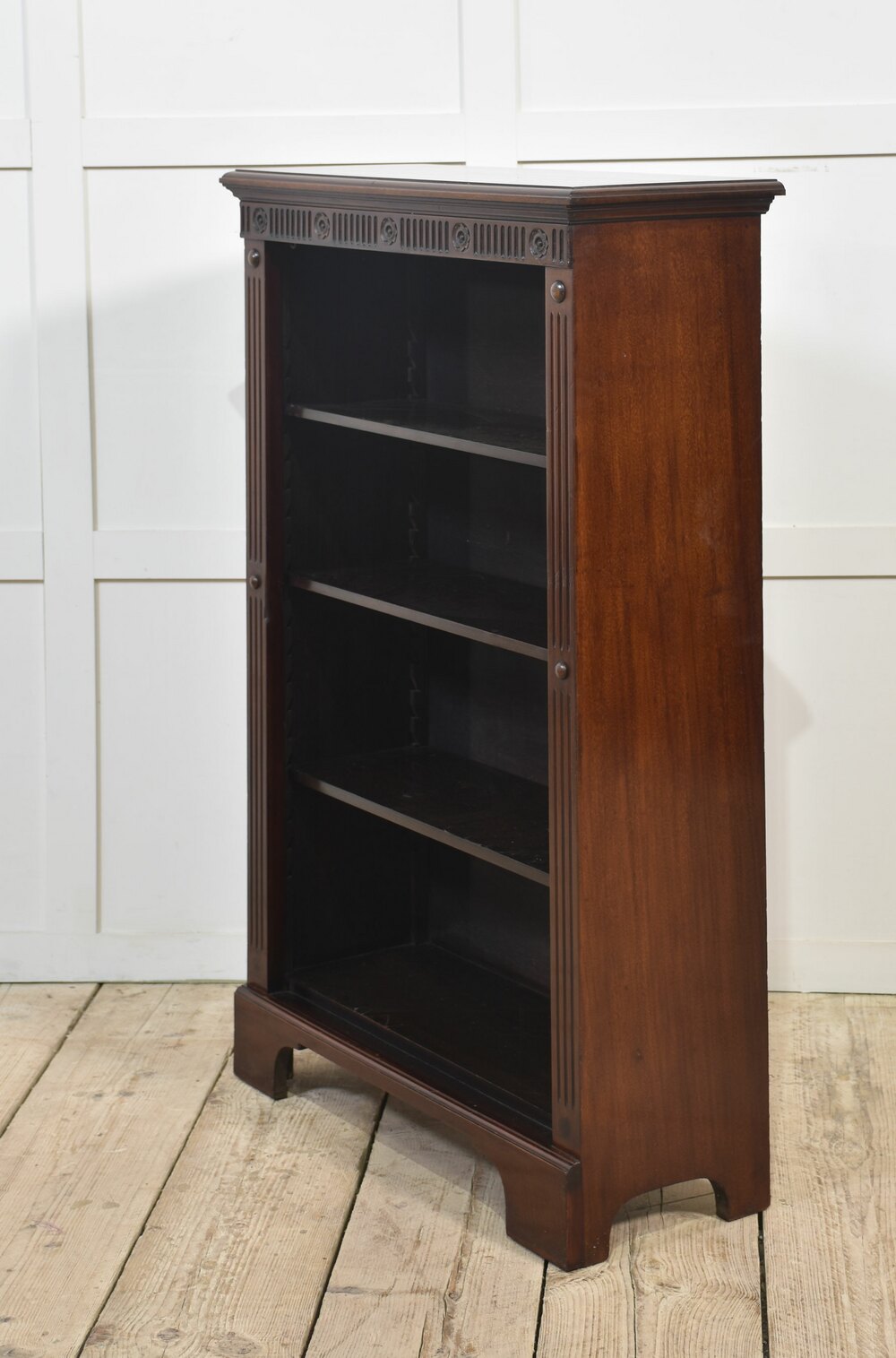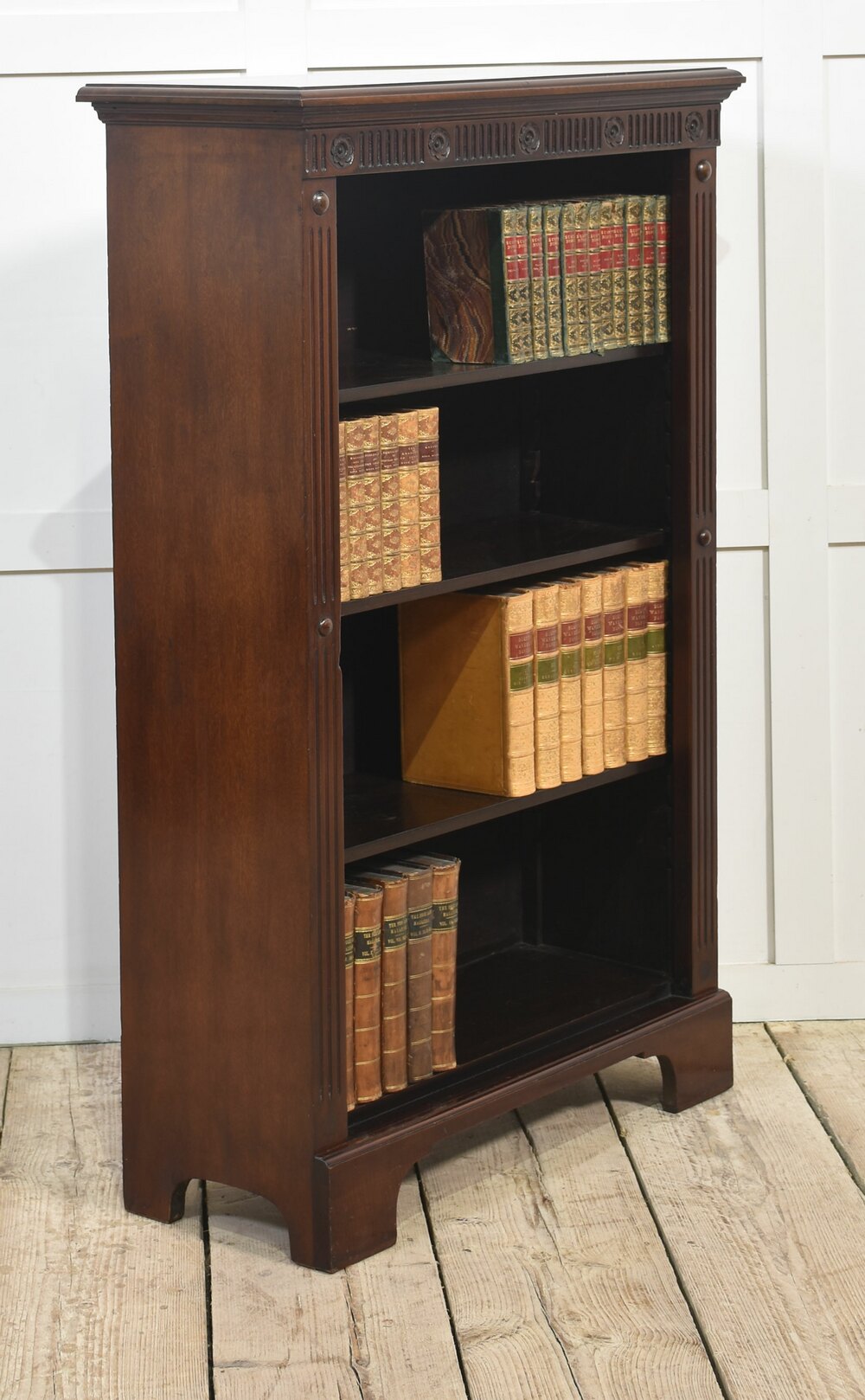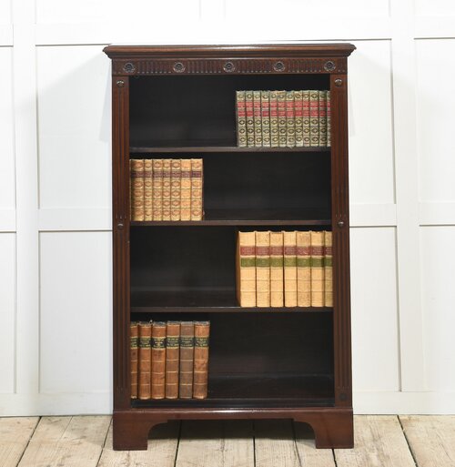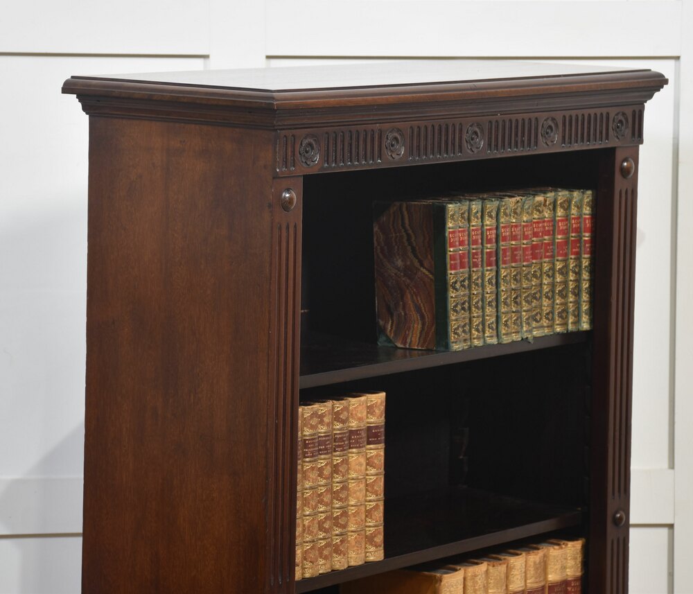 Mahogany open bookcase, the rectangular top with moulded edge to the carved freeze, above adjustable shelved interior, flanked by reeded columns. All raised on bracket feet.