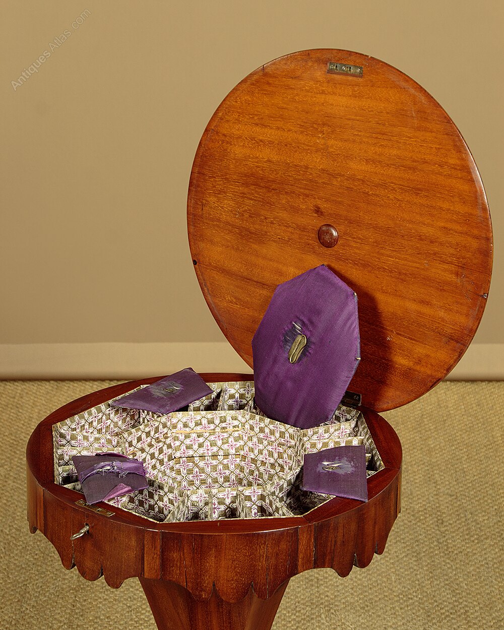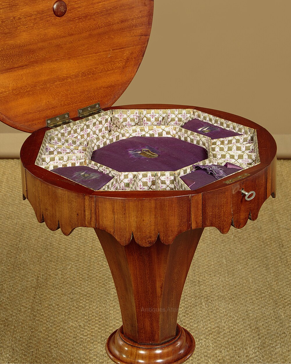 19th.c. sewing table or work box c.1860. 18" diameter to top with a thumb moulded. Opens to reveal a fitted interior with original purple silk and patterned paper lining featuring small compartments for threads etc, around a central well with an octagonal lid. Shaped apron and tapering octagonal section body. Raised on a turned column and carved tripod legs with scrolling feet. Some wear to the top and apron, generally good condition, cleaned and waxed in our workshops. Key supplied.