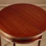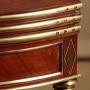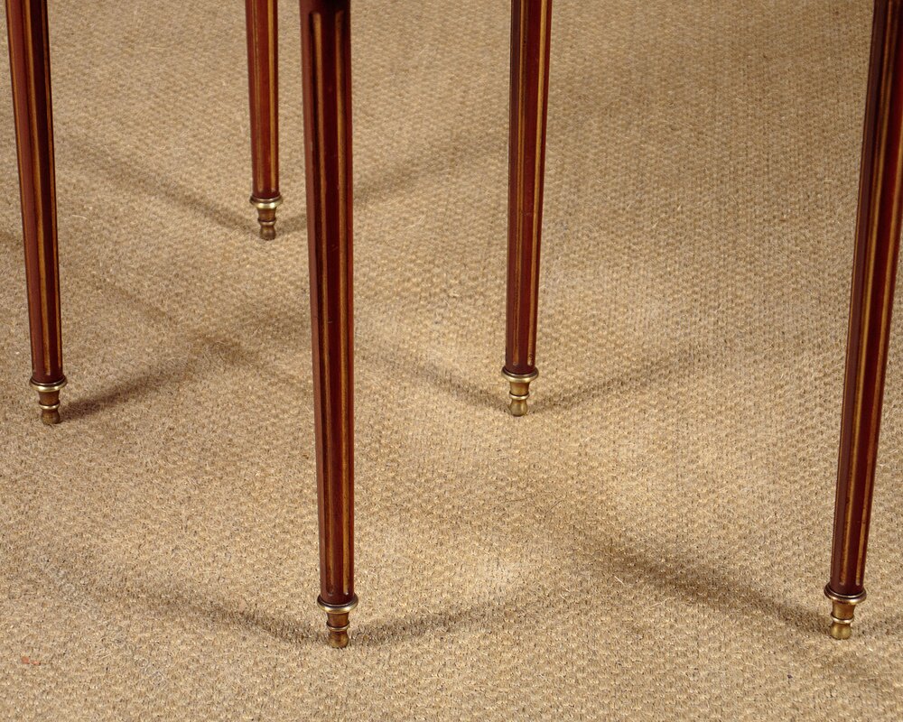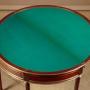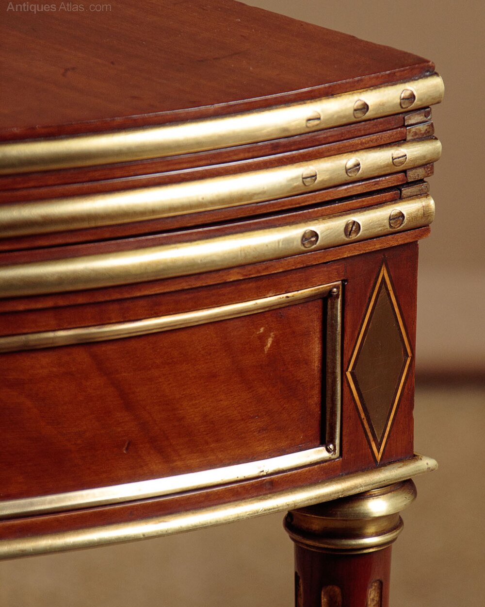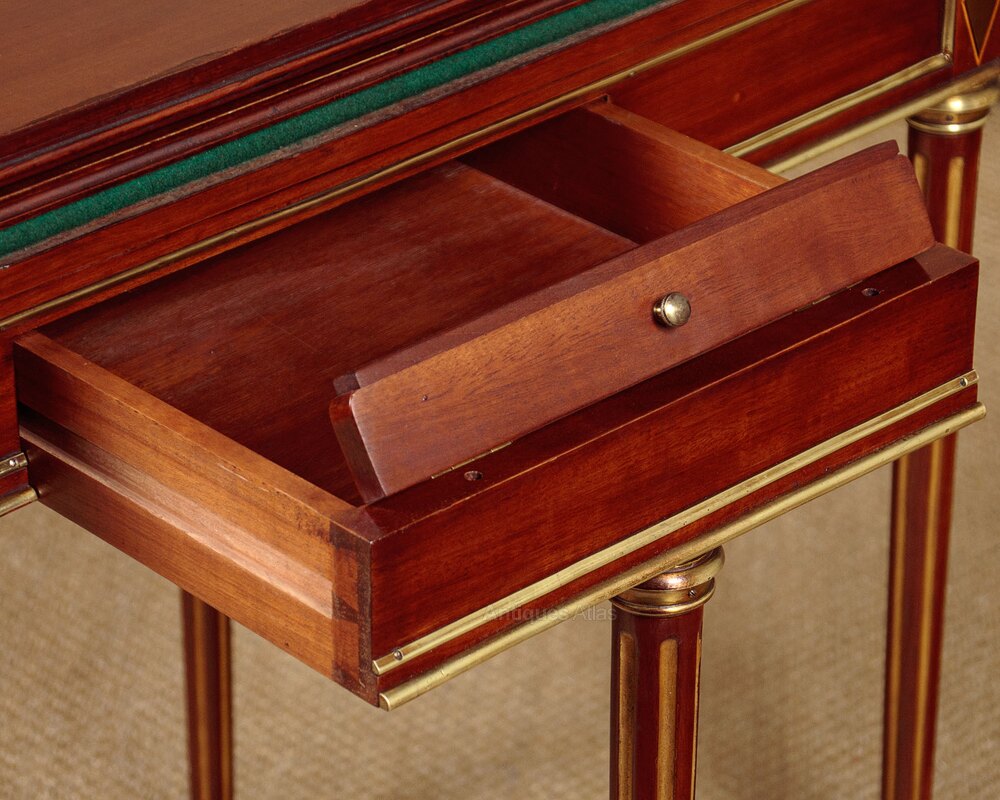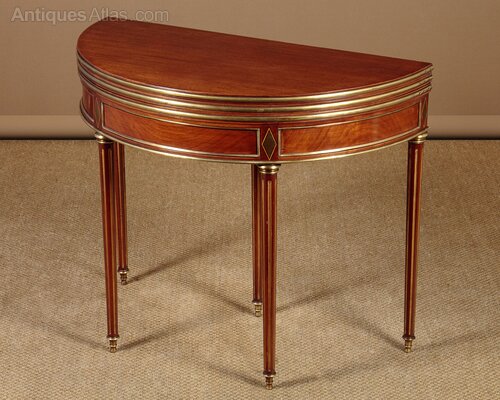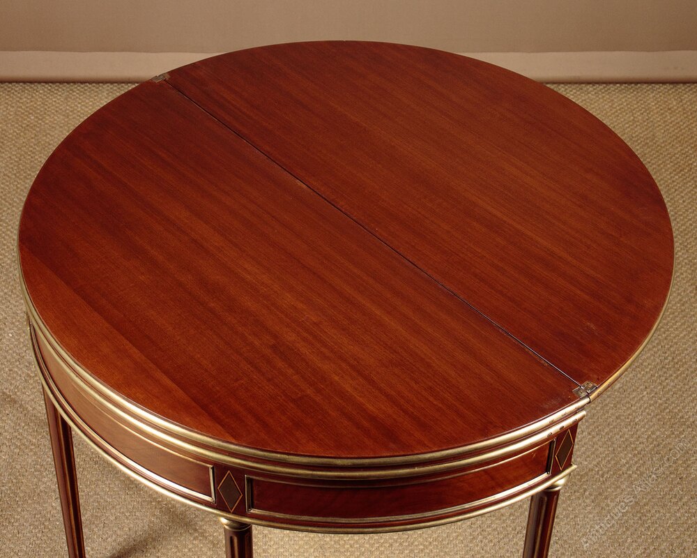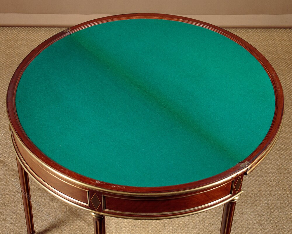 Very smart early 20th.c. brass mounted mahogany fold over table c.1920. Stands flat against the wall as a bow fronted console table or slide out the central rear leg and open to top to make a round supper table for four. Unusually the table also has a second folding leaf which opens to reveal a green baize playing surface for cards. Applied brass moulding to the edges of the leaves, decorative brass inlays and moulding to the mahogany apron front and rear. Small drawer to the rear forming a support for the open leaf. Raised on turned, tapering and fluted rear legs with gilded flutes, brass collars and brass finial feet. Some minor wear to the tops. Generally excellent condition, cleaned and waxed in our workshops.