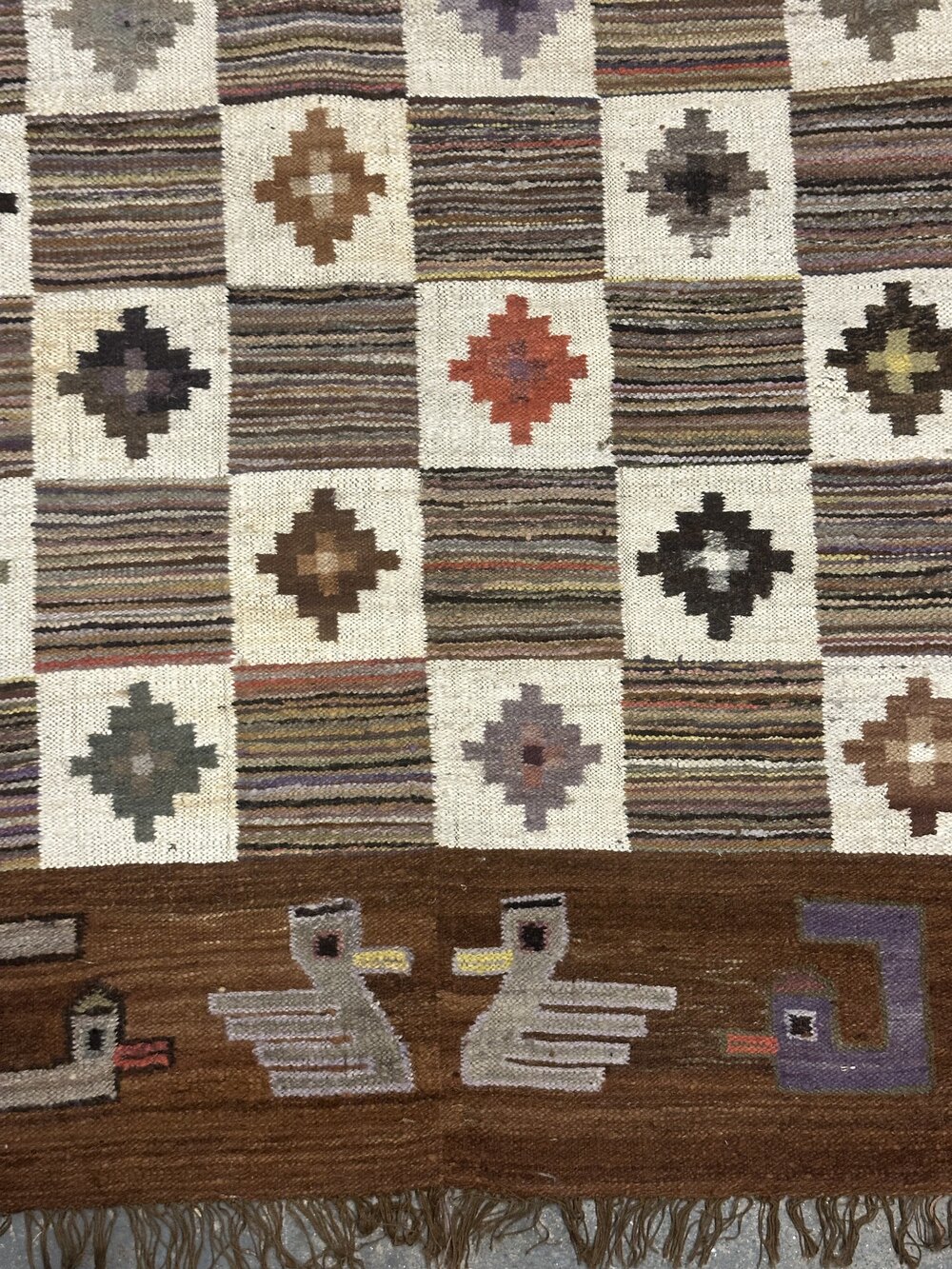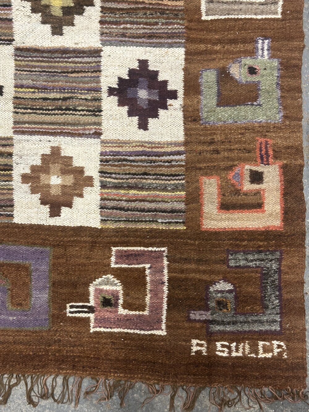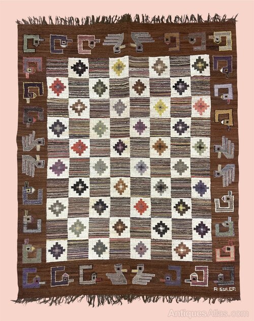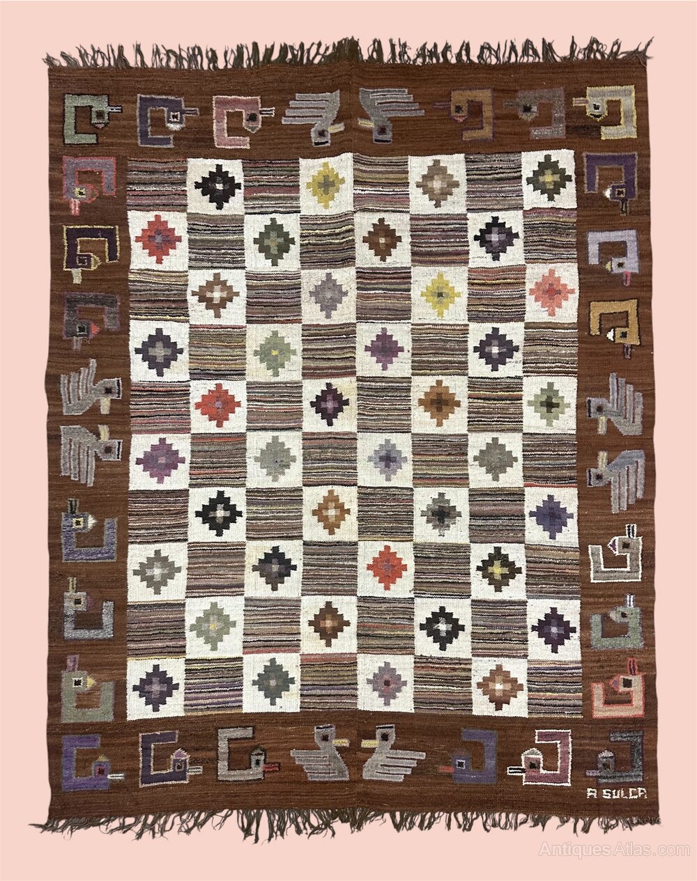 A striking handwoven wool tapestry or rug, signed A. Sulca, likely produced in Peru during the mid-20th century. The design features a bold checkerboard arrangement of striped and diamond-patterned squares, surrounded by a wide border of stylised birds and geometric motifs in earthy browns, creams, muted greens, and jewel tones.