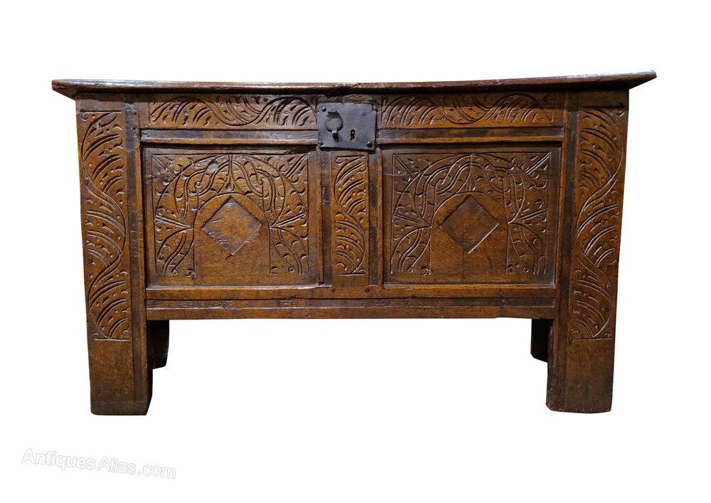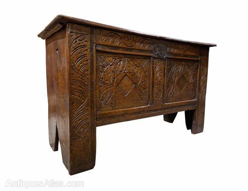 Mid 17thc transitional oak coffer, the panelled front with incised foliate carving and arched panels centred by vacant diamond recess. 18thc wrought hinges replacing original wires. Superb colur and surface.