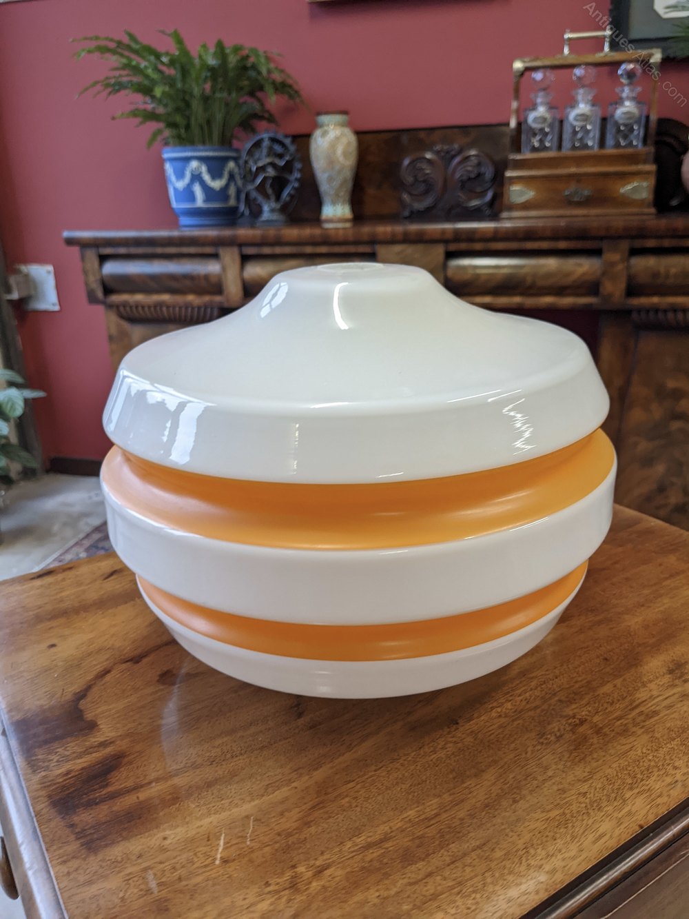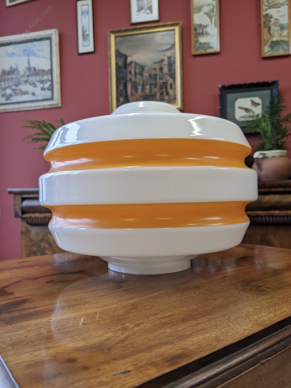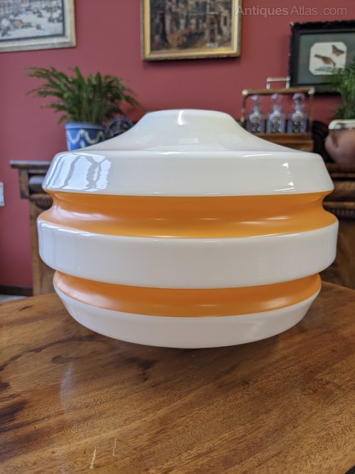 A super retro opaline glass light shade with orange banded decoration.