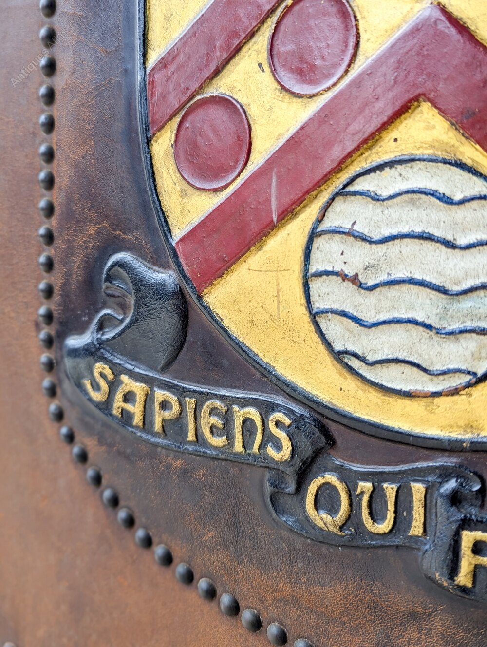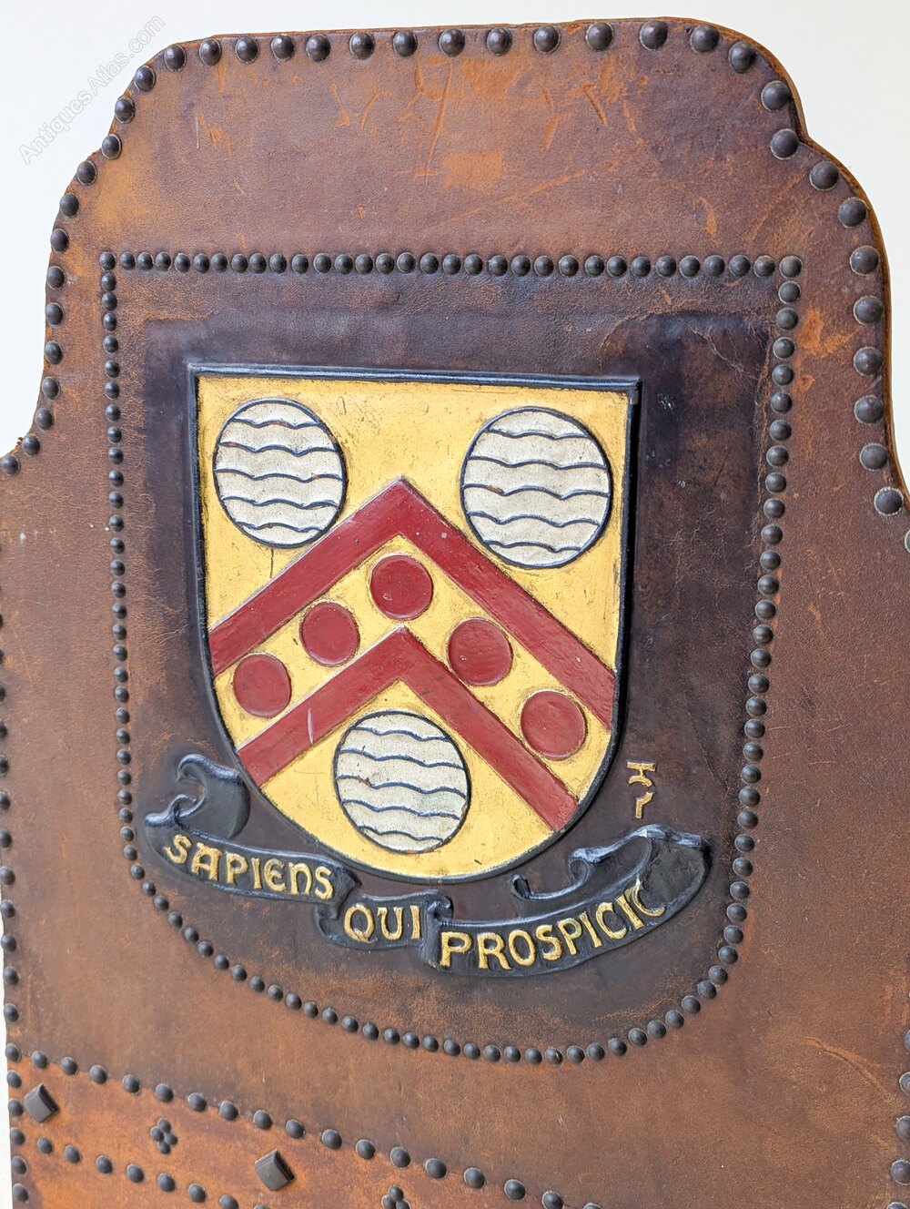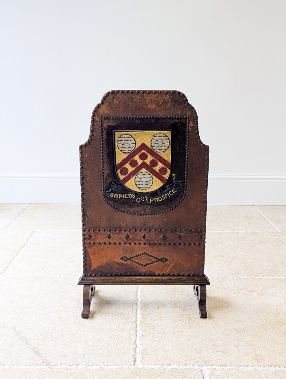 A commanding heraldic fire screen bearing the arms of Malvern College. The screen is formed with a shaped top and studded leather field, centred by a raised relief heraldic shield and motto “Sapiens qui prospicit” (“Wise is the person who looks ahead”), all supported on a finely shaped solid oak stand. The heraldic decoration is modelled directly into the leather rather than applied, and finished with painted and gilt detail.