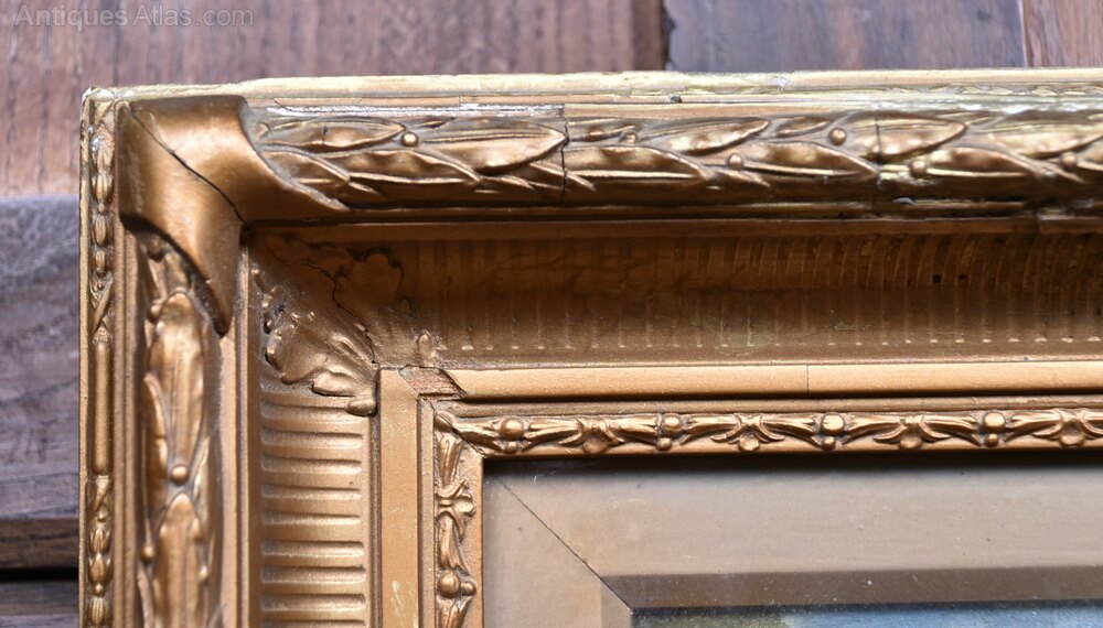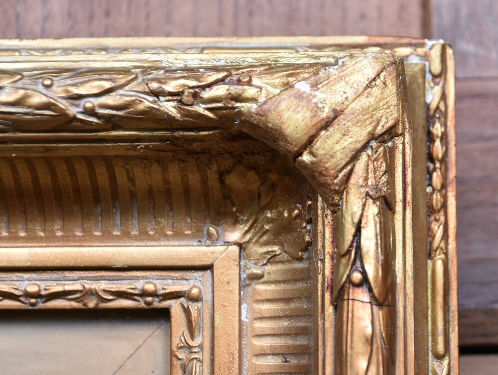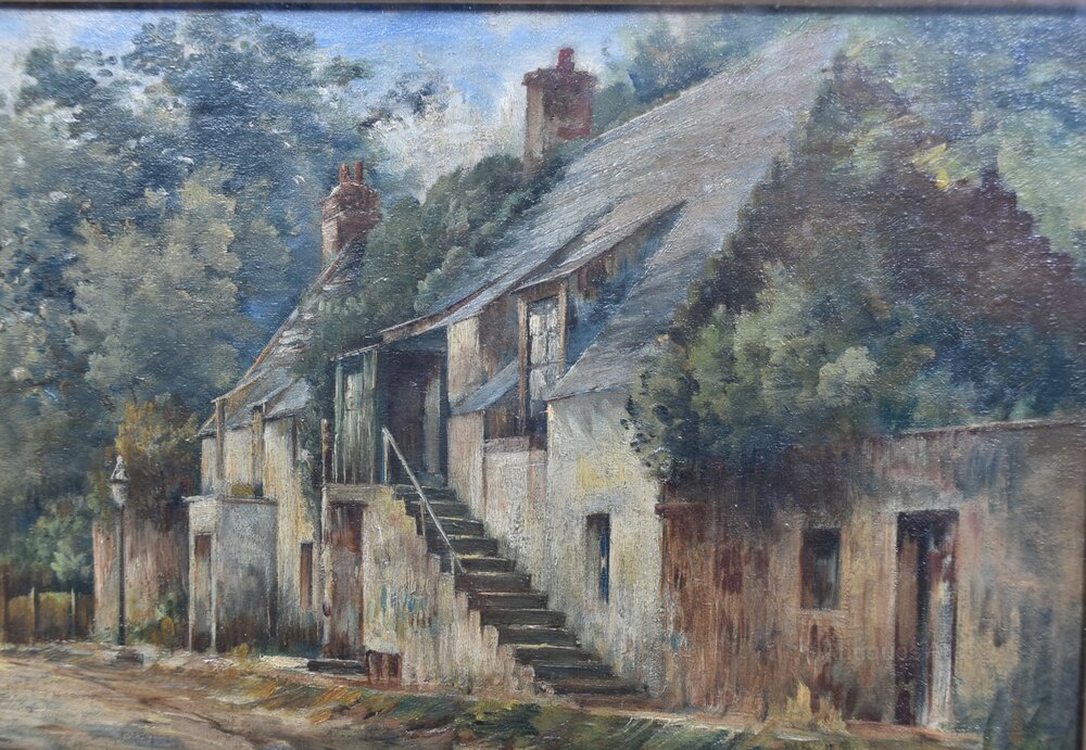 A superb oil painting capturing a tranquil moment of rustic village life. The artist’s stylised red signature mark appears in the lower left corner, partially obscured yet distinctive. At the heart of the composition, a winding dirt path draws the eye toward a cluster of weathered buildings nestled among dense foliage. A figure on a penny-farthing bicycle rides away into the distance, while another crouches near a water source, suggesting quiet labour. The palette is earthy and subdued, with soft light filtering through a cloudy sky to evoke a serene, pastoral atmosphere. Presented in an ornate gilt frame with foliate detailing, the painting offers both visual charm and historical depth—an ideal piece for collectors drawn to period scenes and traditional craftsmanship.