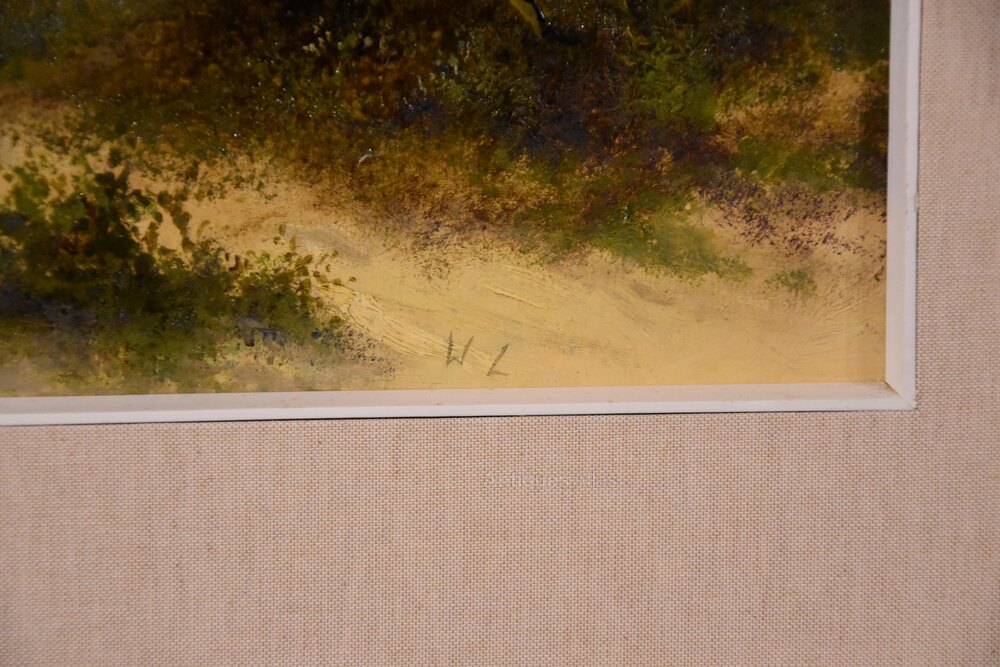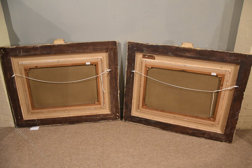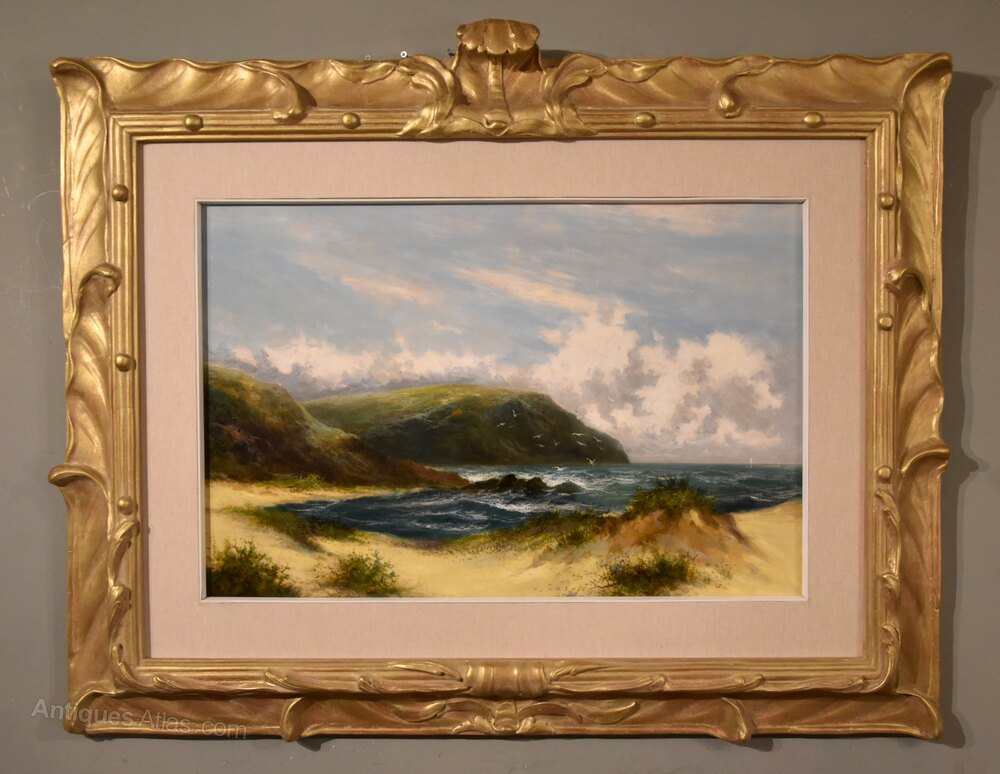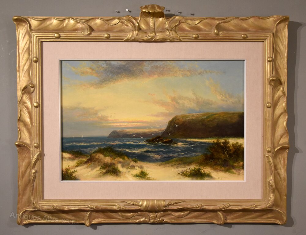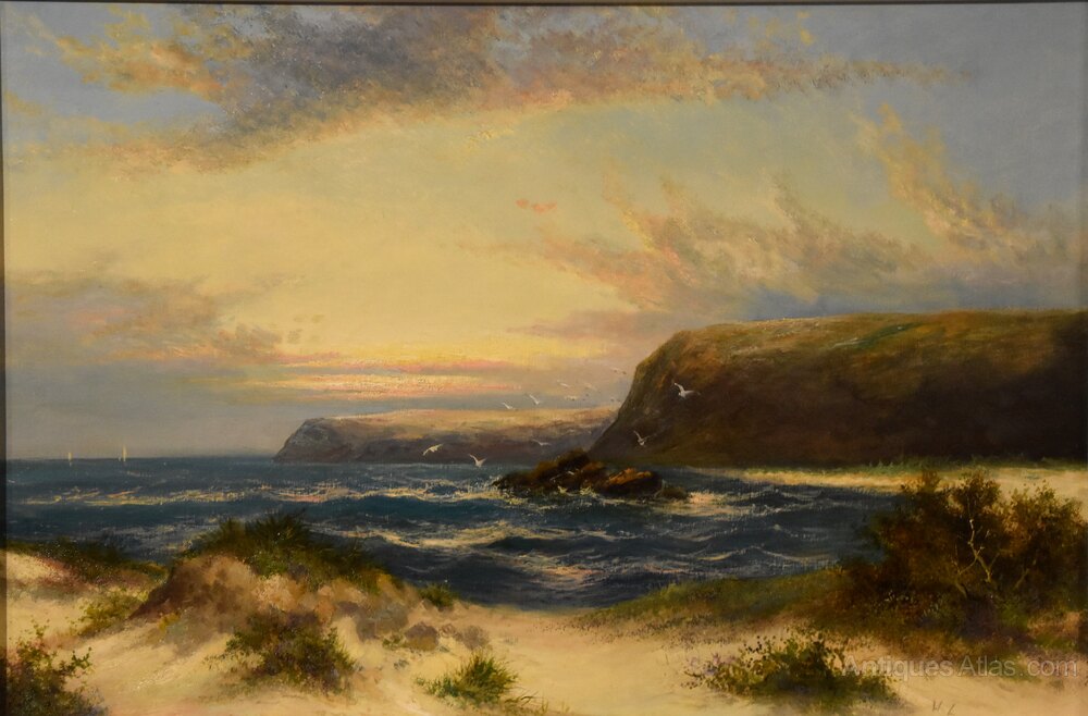 Oil Painting Pair by William Langley "Morning and Evening in the Dunes" flourished 1890 - 1920. Painter of atmospheric landscapes and coastal scenes in the manner of Benjamin Williams Leader. Possible pseudonym for Daniel Sherrin. Both oil on canvas. Signed initials