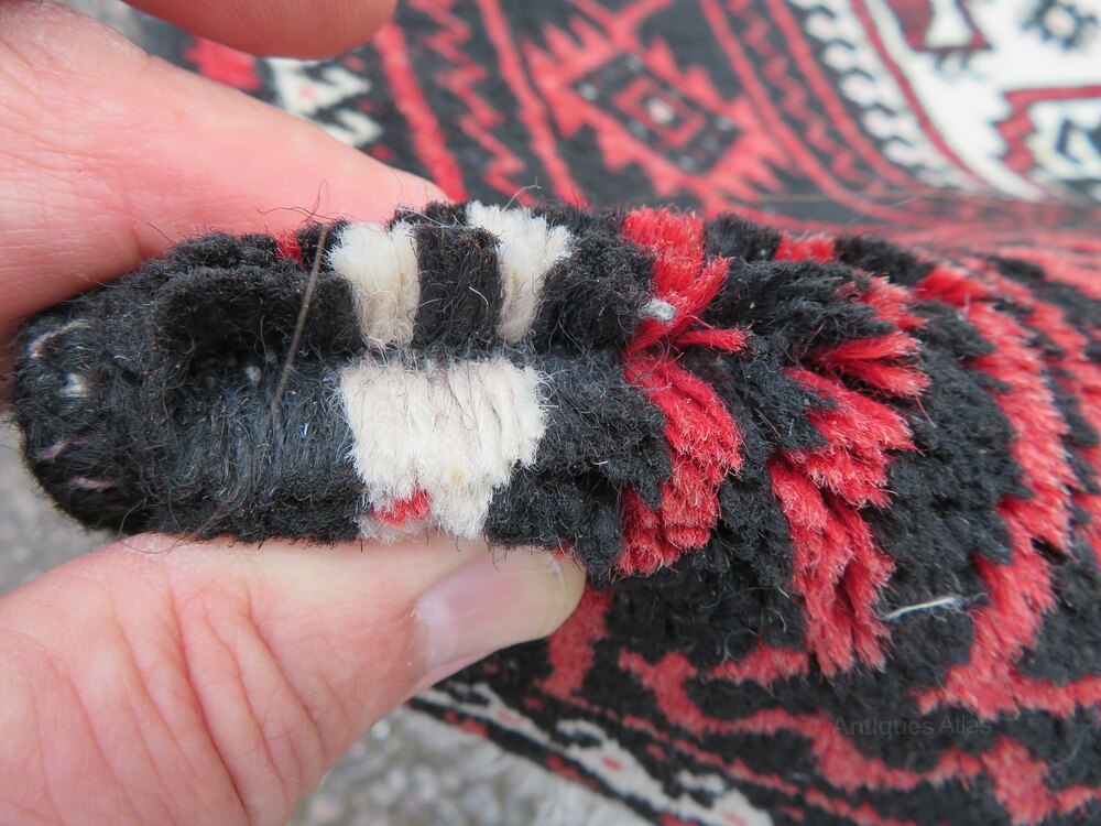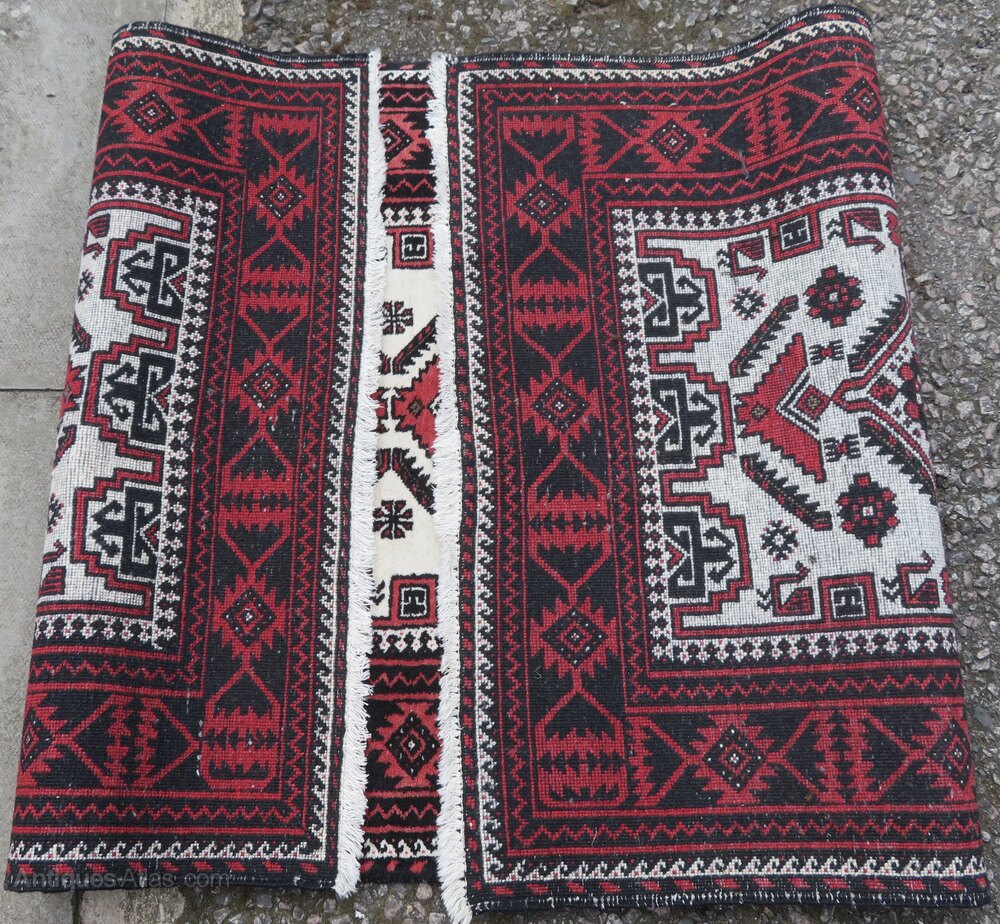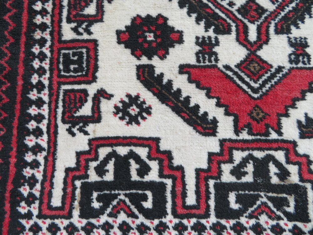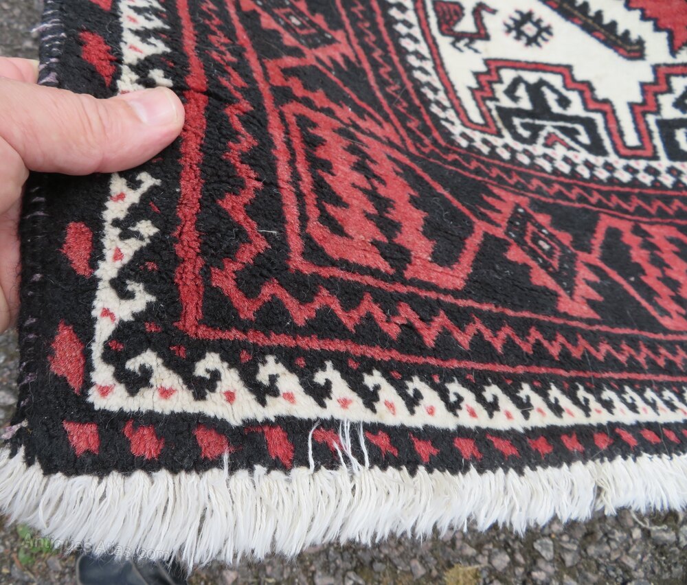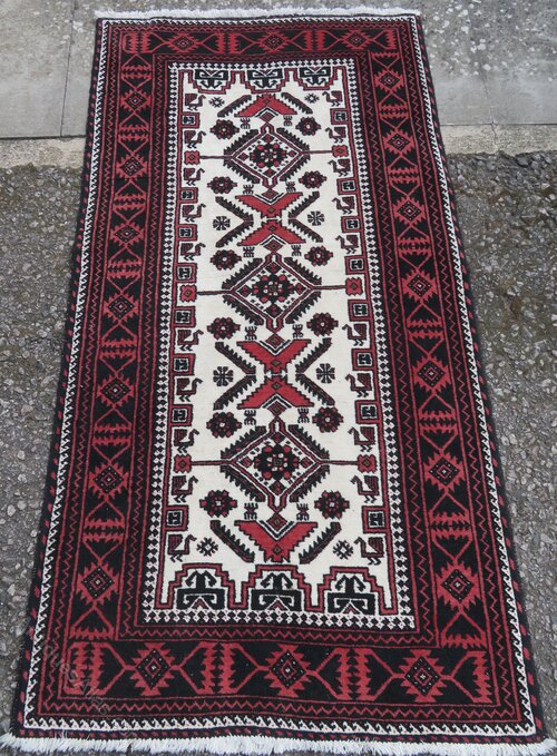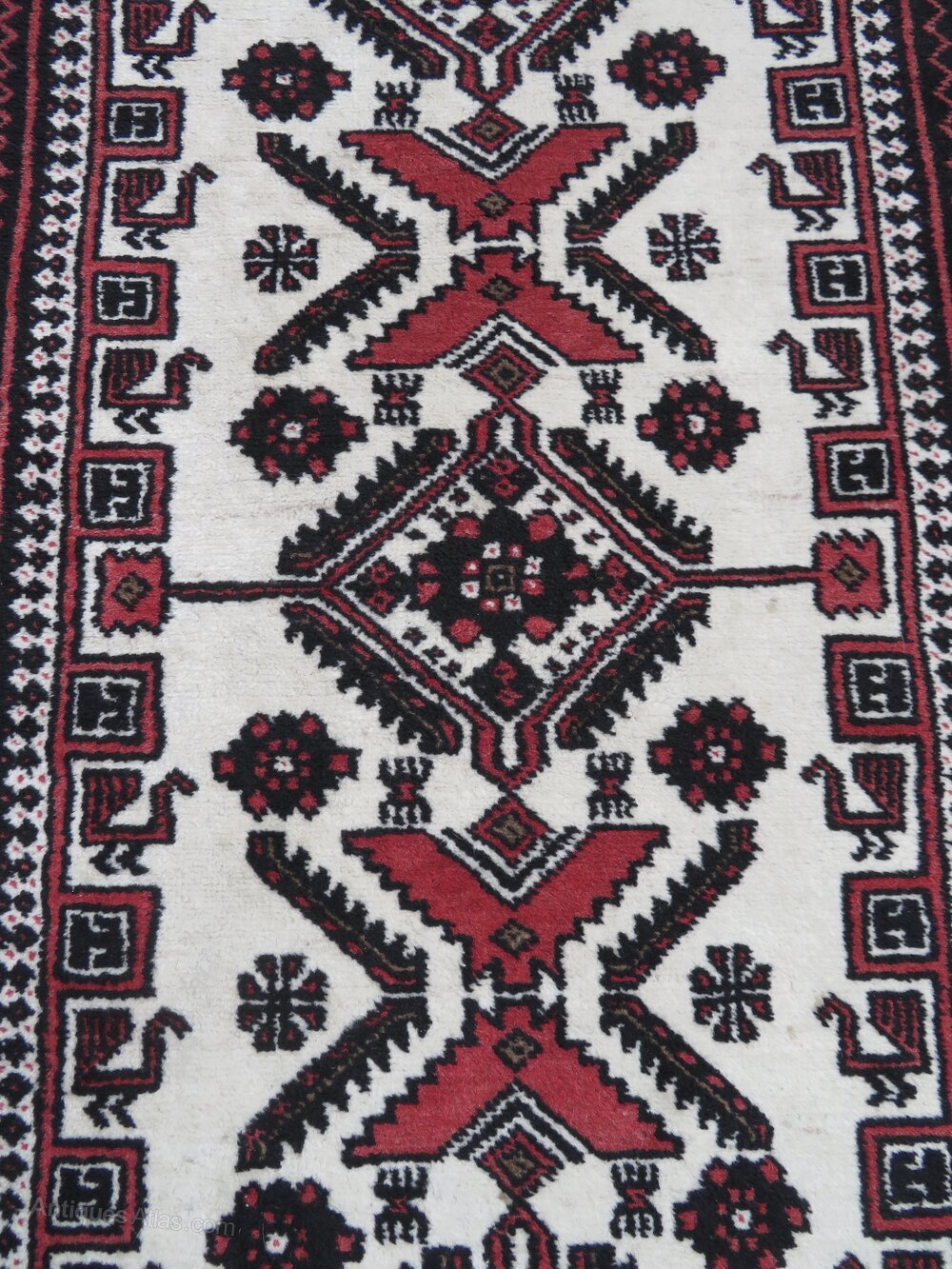 North east persia,probably khorossan province. Ivory coloured central ground colour with to note a row of peacocks running up each side of the castellated inner reciprocal border. With outer ivory ground ''running dog'' reciprocal border. A classic baluch weaving in good pile on cotton foundations. 6 foot 1 inches by 3 foot 2 inches. 186cm X 97cm. At widest points. Fringes not measured in size. Good quality rug for very reasonable money. £325 gbp. U. K post £16. Many more very sensibly priced rugs & carpets. Tf 5. Purveyors of unusual rare distinctive quality tribal rugs & carpets,howard & sons seating,some orientalist items & decorative objects for the everyman.