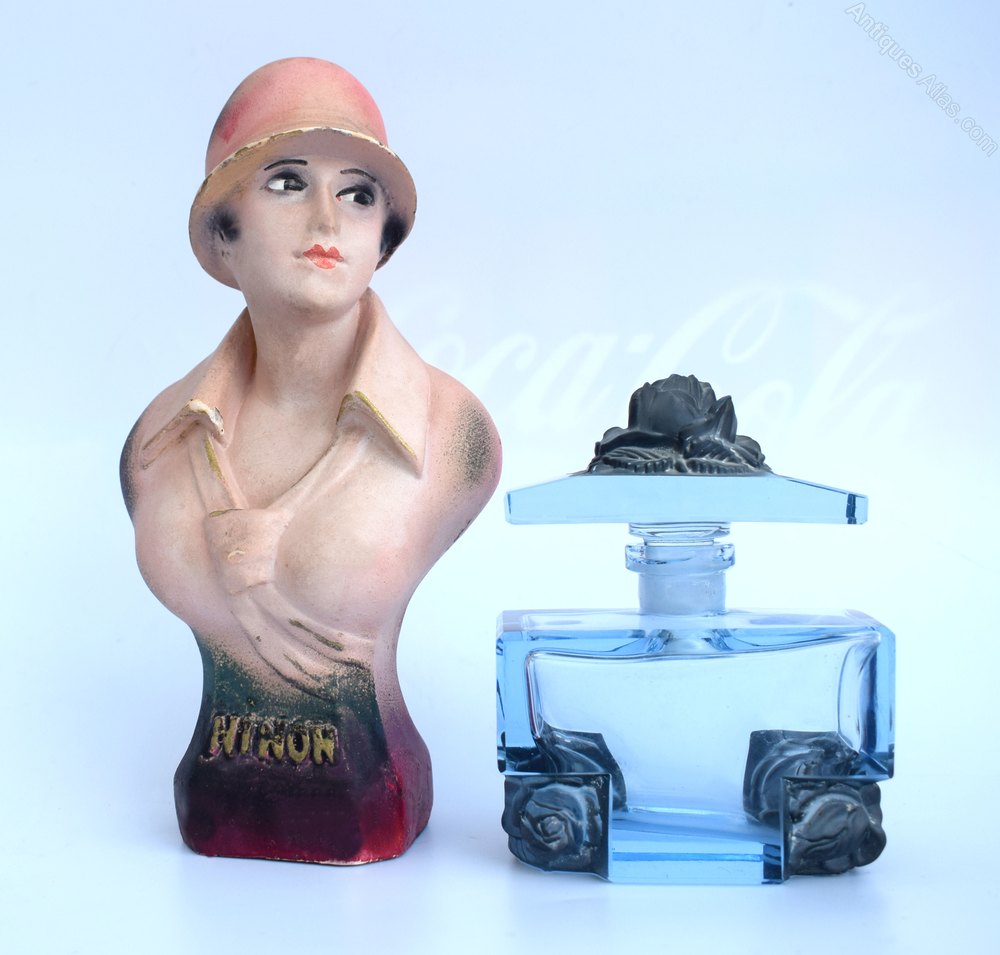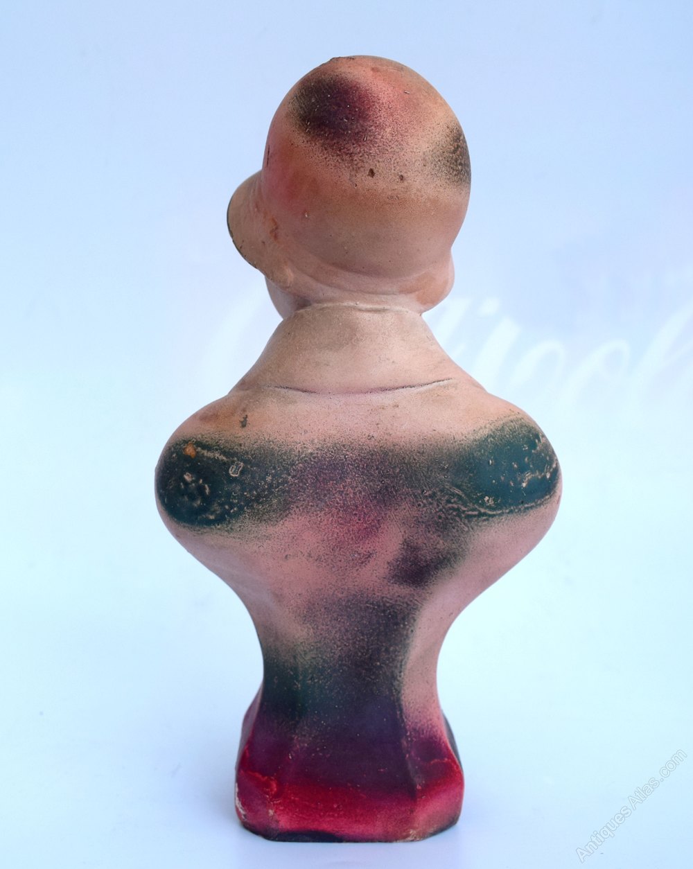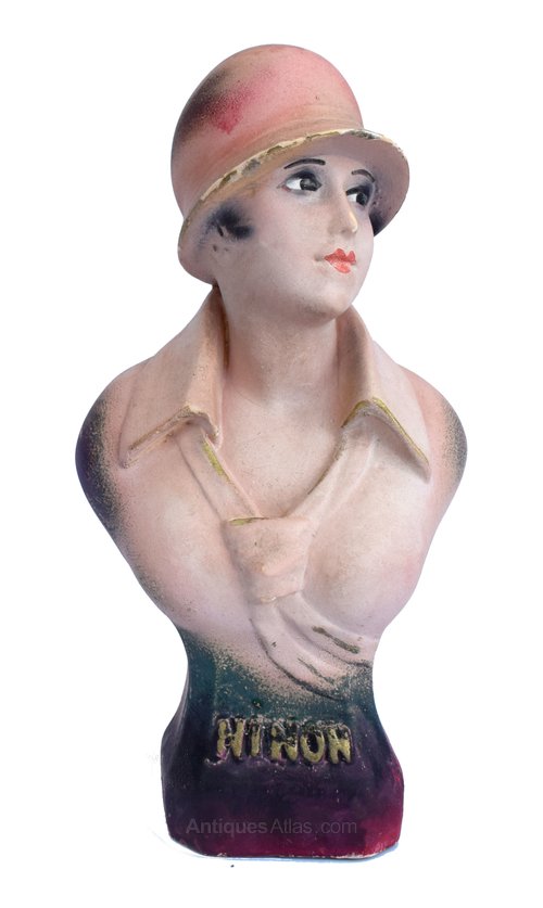 A rare and wonderful find is this original 1930's French Art Deco shop counter advertising bust. Noteworthy because of her size, easily displayed and not often found. Embossed to her base is the word NINON. She's made from plaster and solid rather than hollow. She's been skillfully and delicately painted with cupid bow lips, charcoal eyes and brows with a cloche hat she makes a perfect figure. Her overall condition is very good, only to note the odd scuff and abrasion on the rim of her hat. She weighs a delicate 300.43 Grams. FREE UK DELIVERY