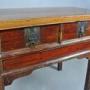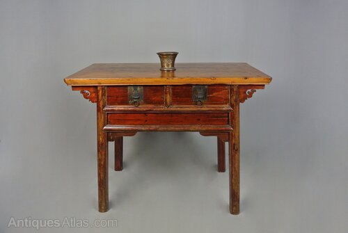 With a well developed rich and warm colour to the elm, this small and original 19th Century Chinese Elm altar table has a boarded, cleated and oversailing top over two front frieze drawers and retains the original bronze drawer pulls (with sliding sections which secure the drawers).