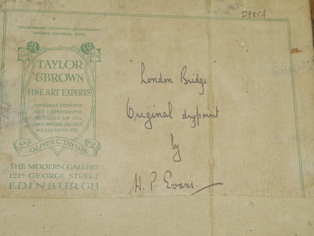 A good quality drypoint etching by H P Evans, a label to the reverse for Taylor & Brown, George Street< Edinburgh, with another label showing the etching was a gift in 1927.