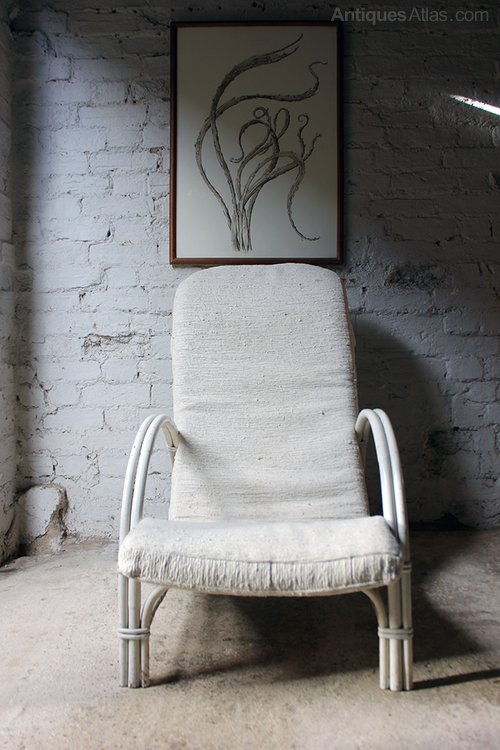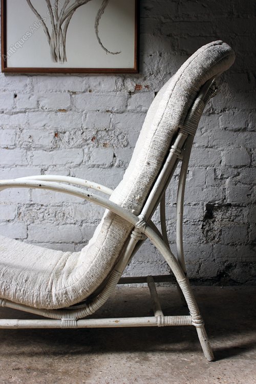 The beautifully sculptural wicker and bamboo white painted low frame, having elegantly art deco inspired shaped half moon arm supports, with a cream berber Moroccan wool drop in shaped padded roll seat by Terence Conran, bearing an ivorine plaque inscribed 'DRYAD, CANE FURNITURE LEICESTER ENGLAND 37’, the whole with decorative paint losses to the wicker surviving from Art Deco period England and in the style of Paul Frankl.