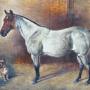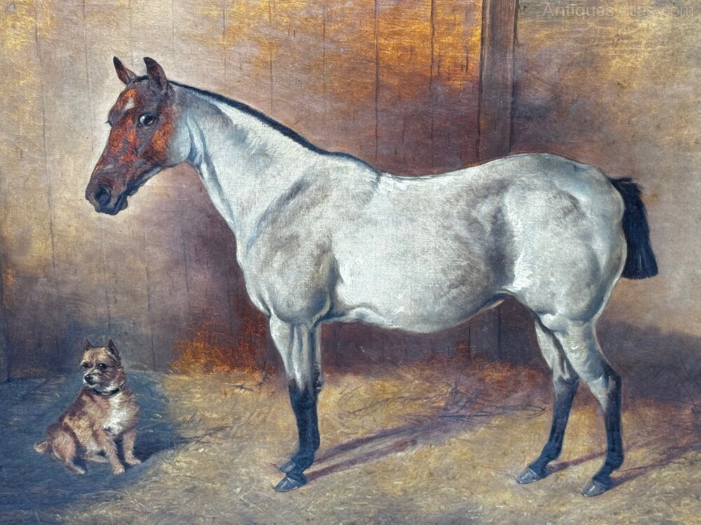 This refined Victorian equestrian interior presents a distinguished strawberry roan gentleman’s hunter standing in quiet composure within a timber stable, accompanied by an alert terrier seated attentively at its feet. The warm, atmospheric tones of the stable evoke a moment of calm either before the rigours of the hunt or in the peaceful aftermath of a ride. The horse’s strawberry roan coat—highly prized for its rarity and visual allure—is rendered with notable sensitivity, imbuing the composition with individuality and an elevated sense of sporting distinction. The inclusion of the terrier introduces an intimate note of companionship, symbolising the loyalty and traditions of the gentlemanly sporting milieu of the late 19th century.