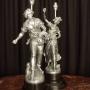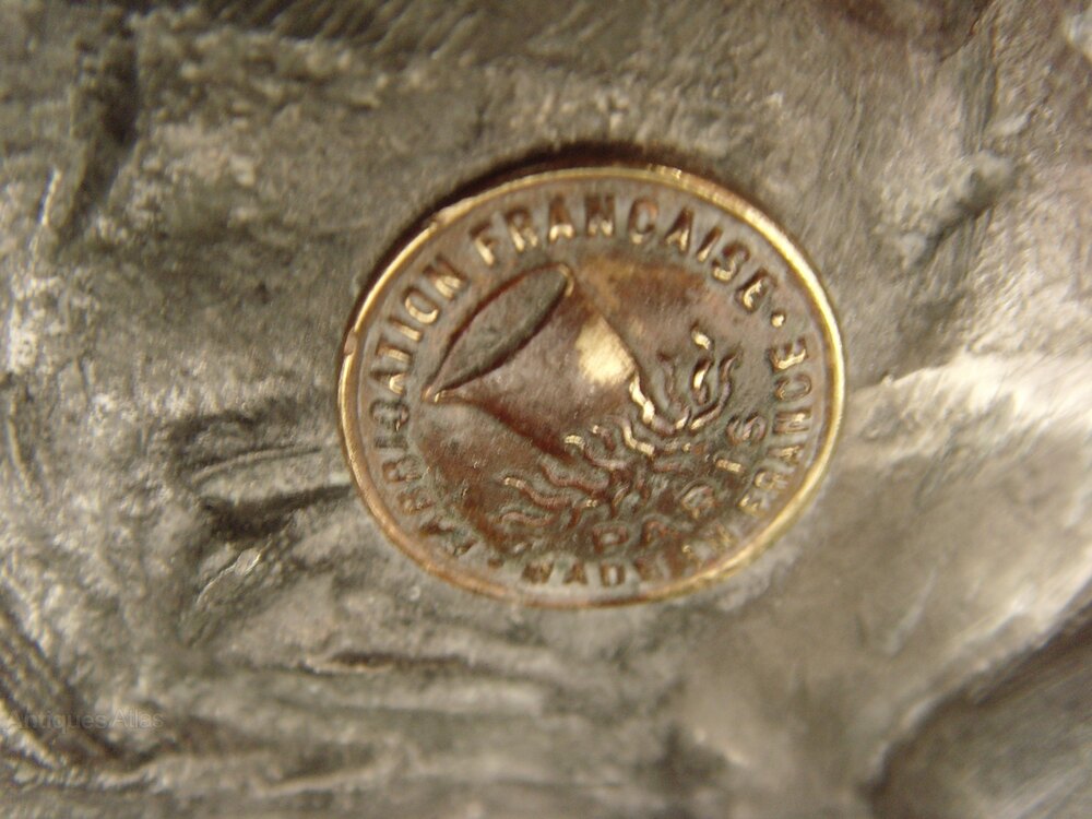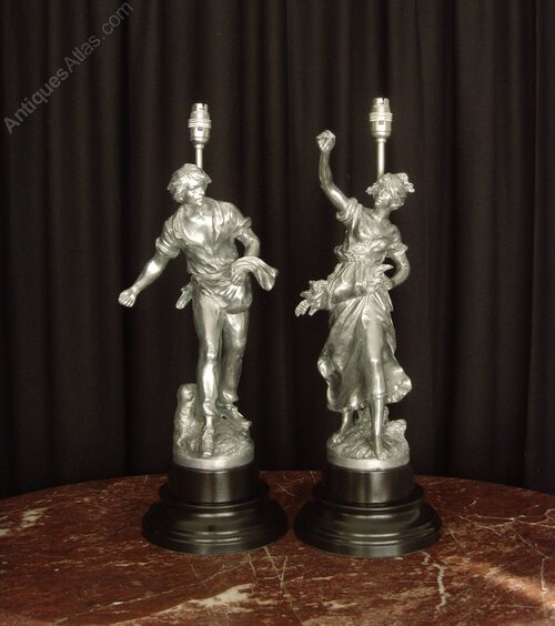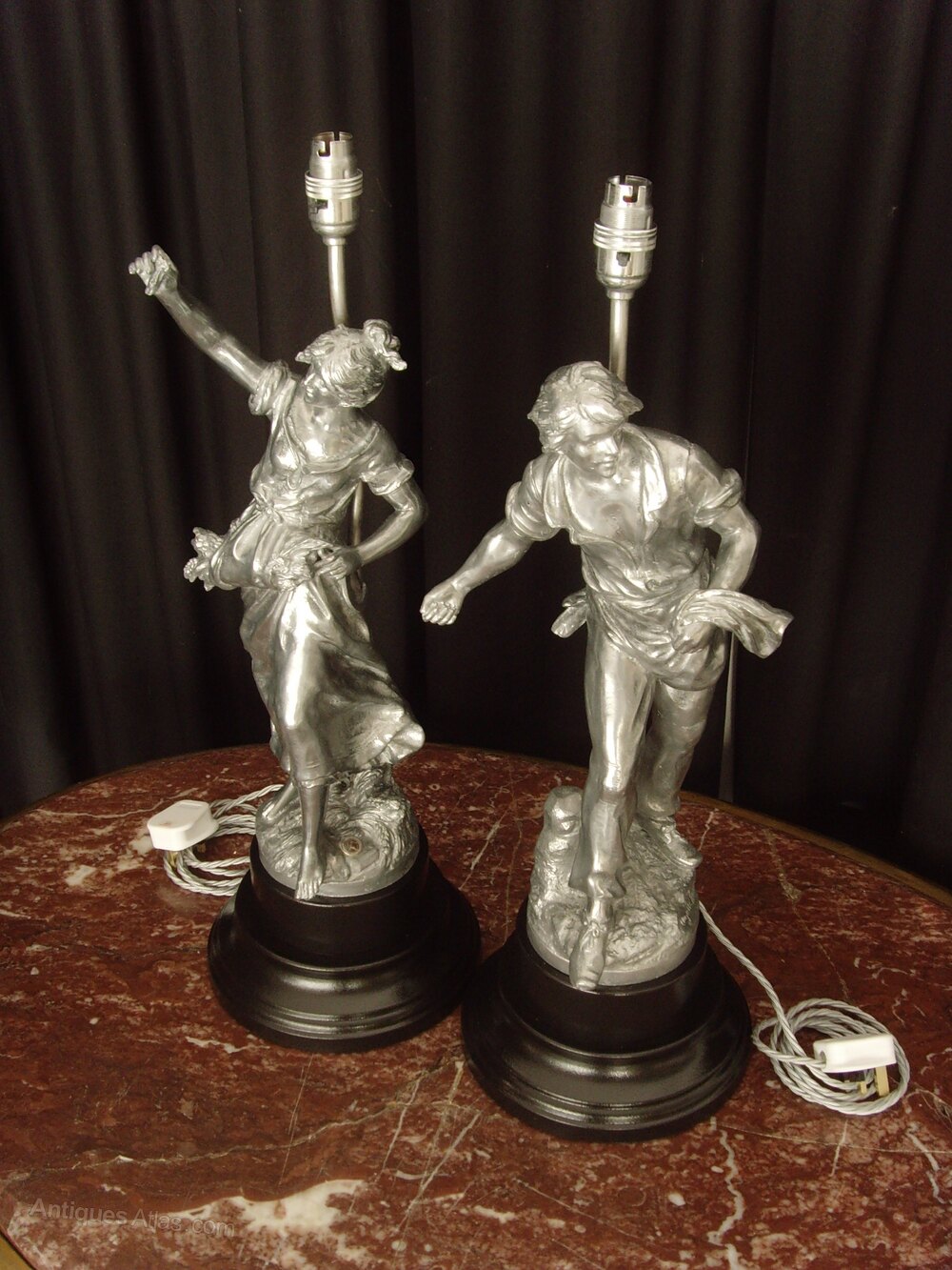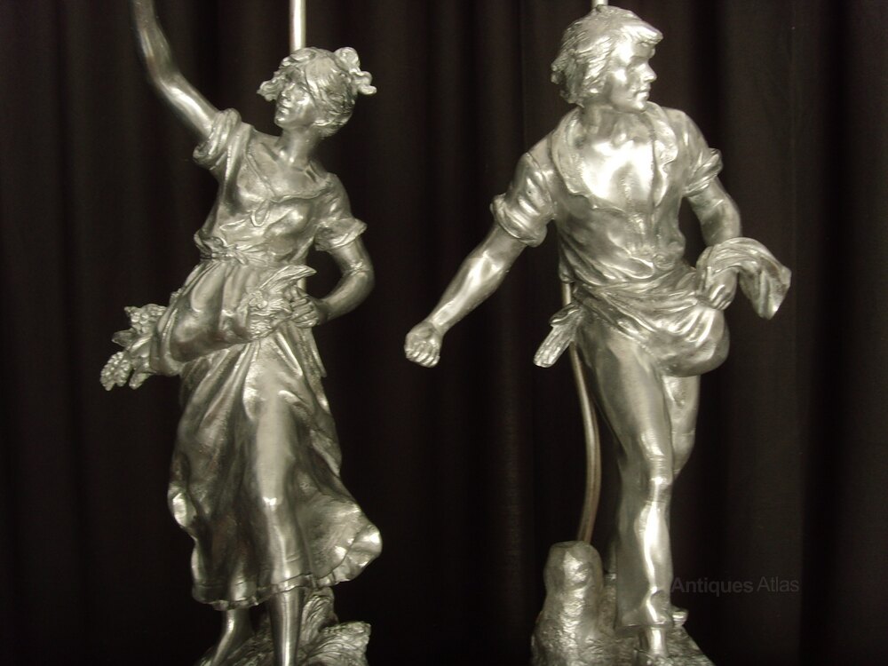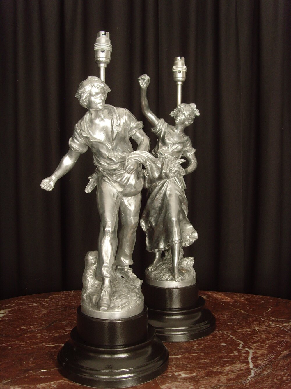 We are offering this pair of silver toned French Spelter Figurative Table Lamps, after and signed Auguste Moreau. The lamps depict a pair of male and female rural figures. The male is scattering seeds, while the female is carring a bundle of corn in her apron and holding alofit an ear of corn. Presumably, these spelter lamps were cast from one of his signed bronzes. The lamps each bear a circular brass plaque which states 'Fabrication Francaise. Paris. Made in France' bearing a picture of a foundry ladle in the centre.