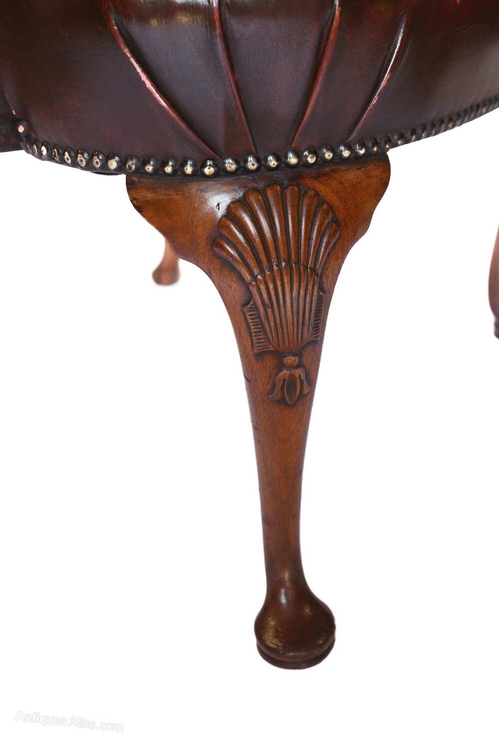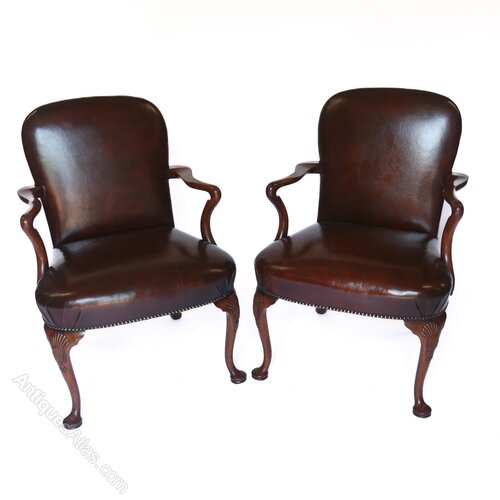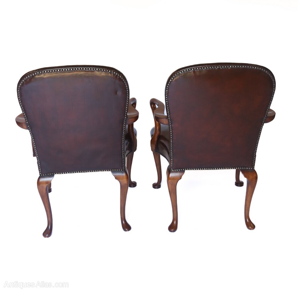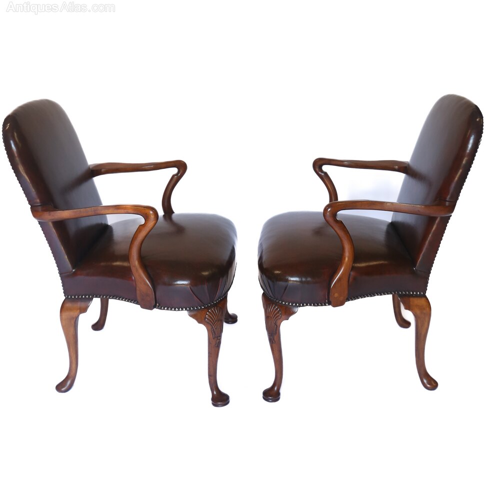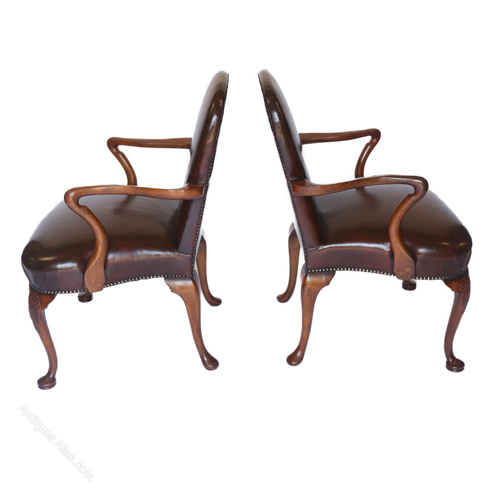 Pair Georgian Revival Walnut & Leather open elbow chairs circa 1920s