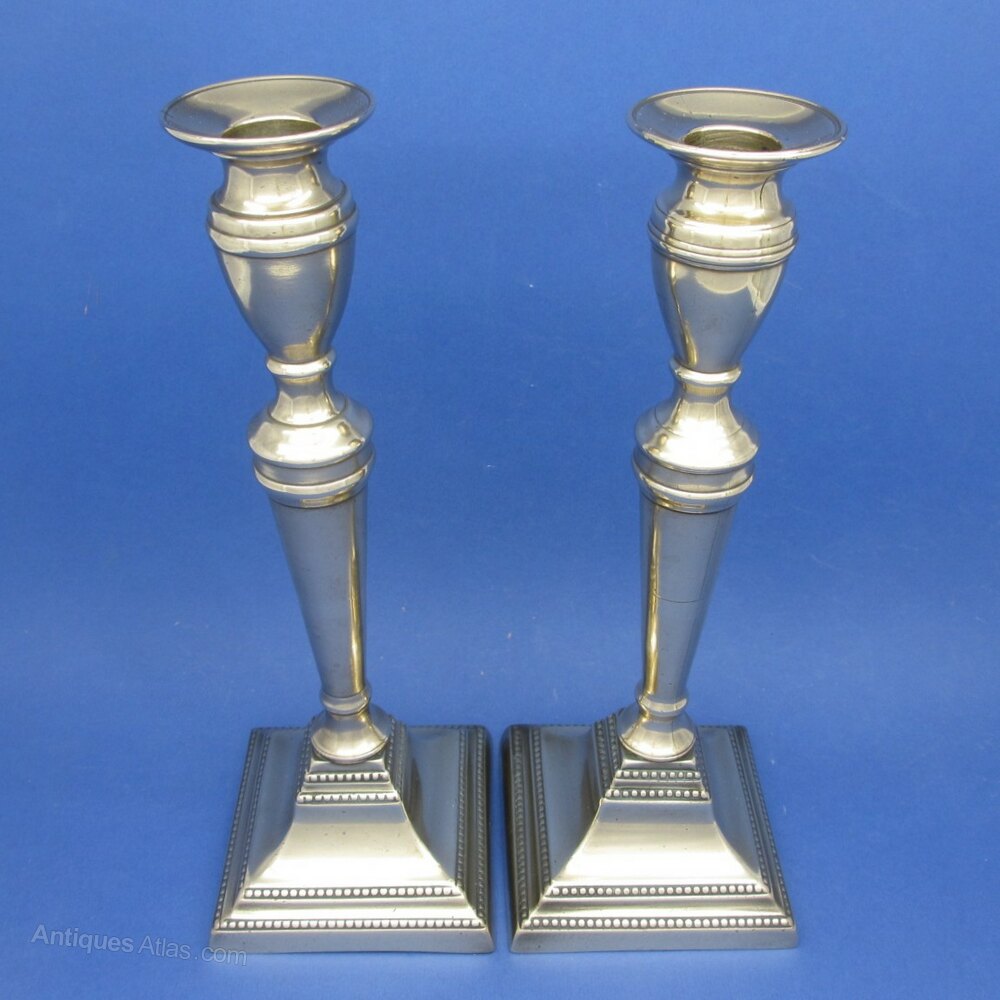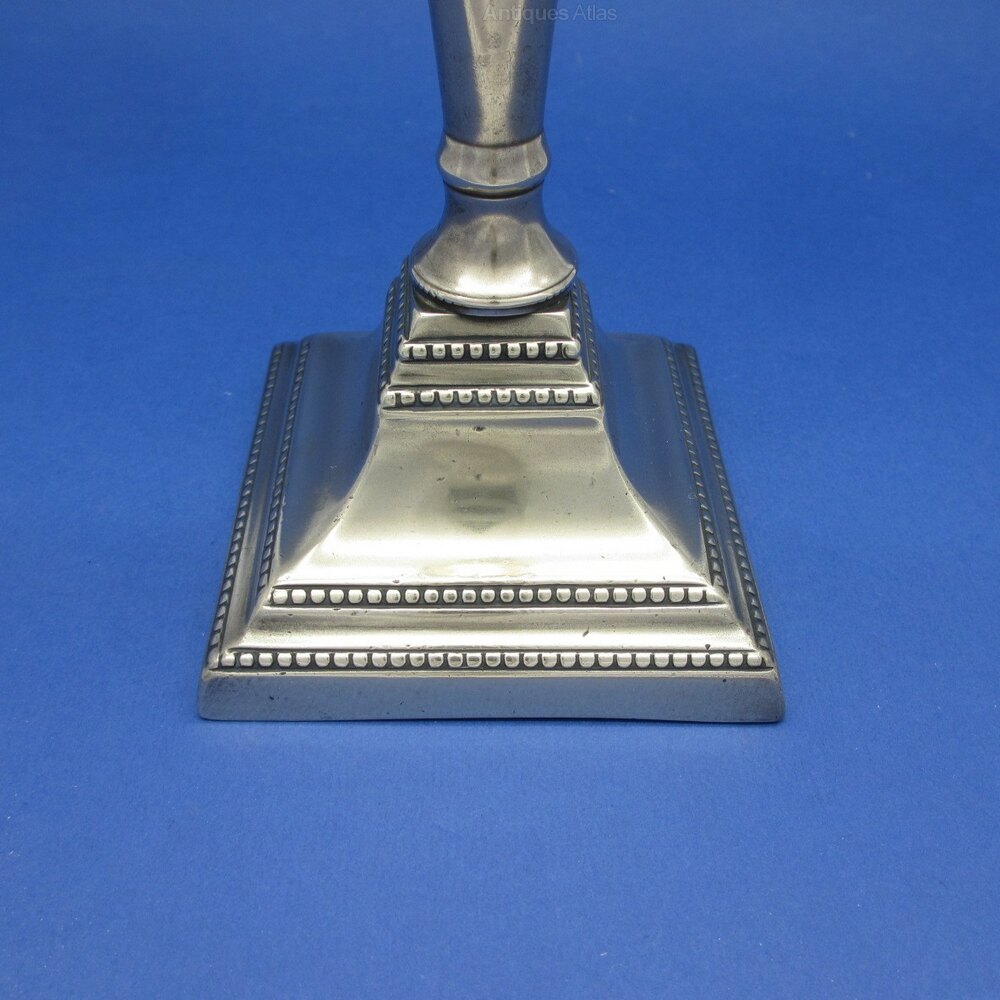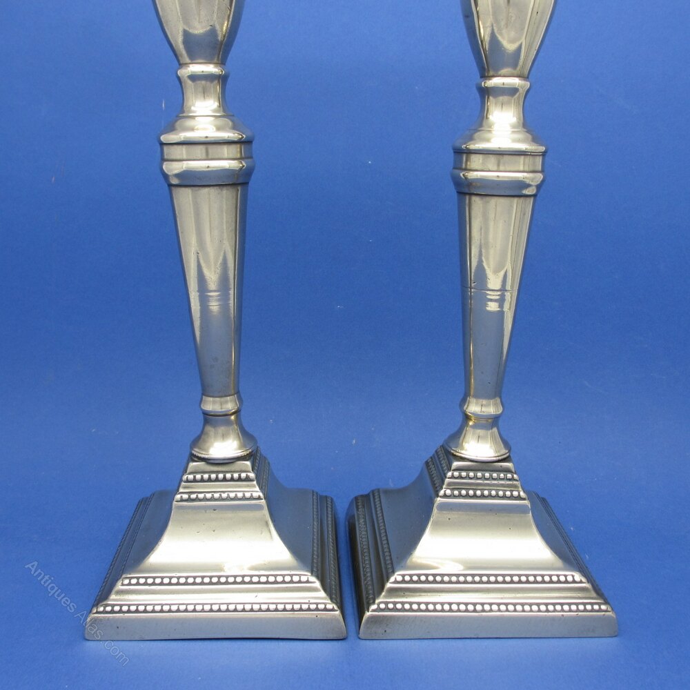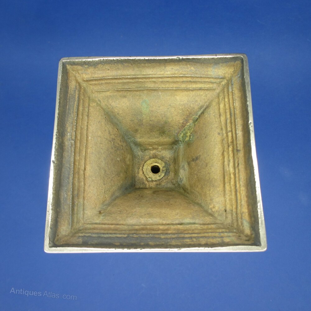 This is a Pair of Late 18th Century Classical Designed Brass Candlesticks on Square Bases.