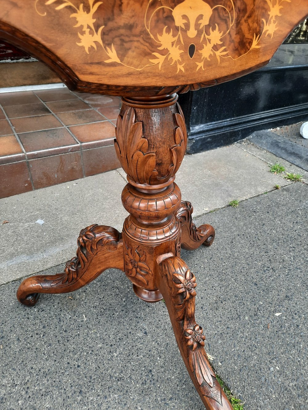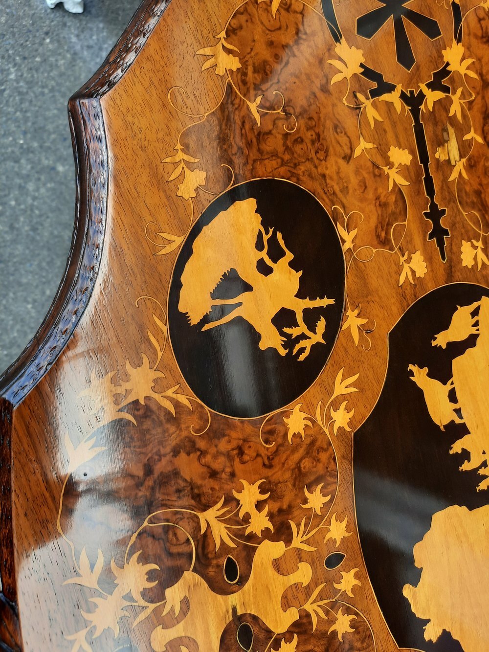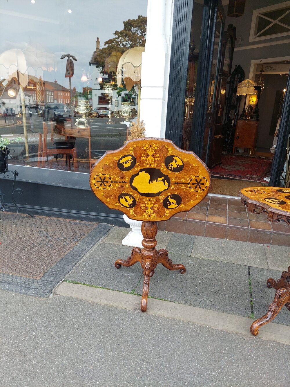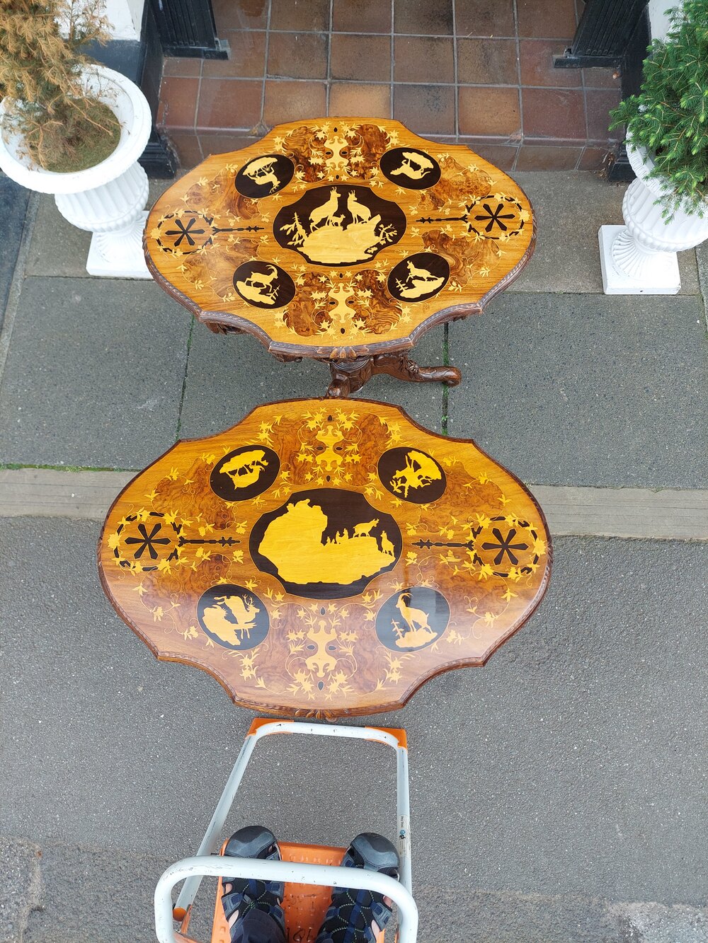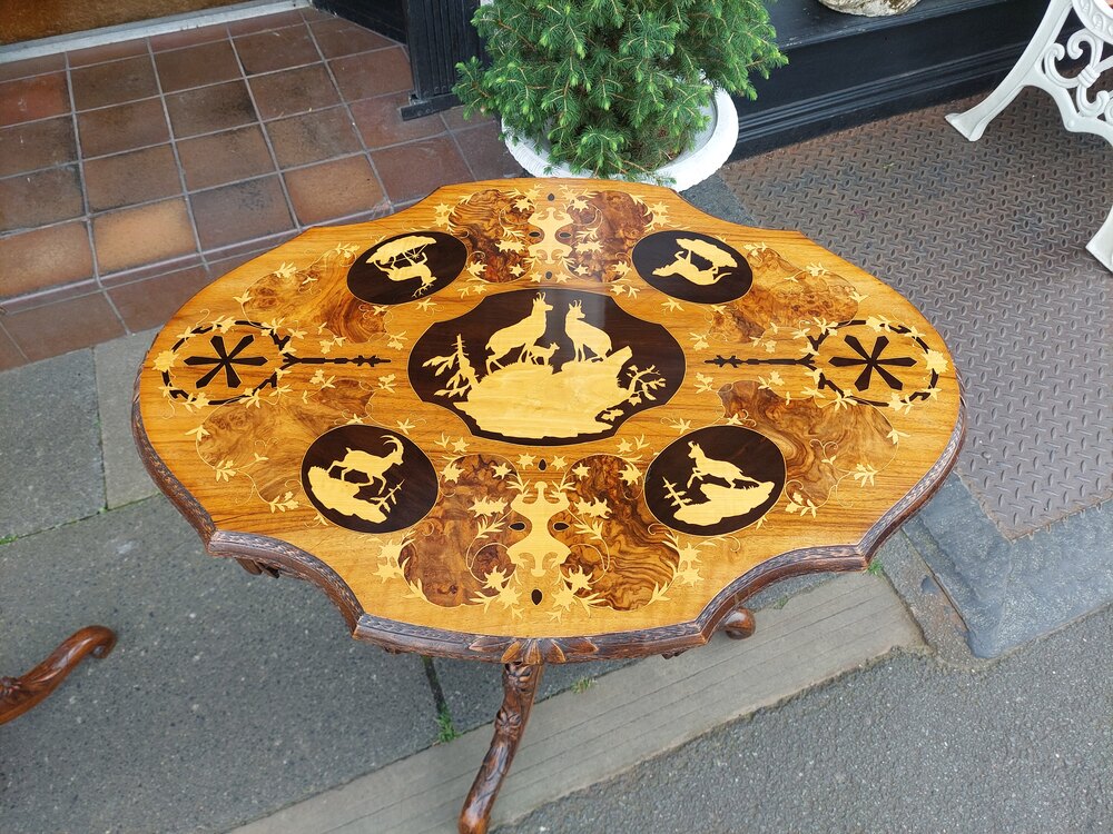 Pair (matched) of 19th Century Black Forest Linden and Marquetry Inlaid Occasional Tables, the shaped oval top decorated panels of Ibex, Chamois and Montain Deer landscapes above a pierced foliate frieze on carved acanthus column and tripod support - Swiss Gand Tour Piece - 29.5"w x 21"d x 29.5"h