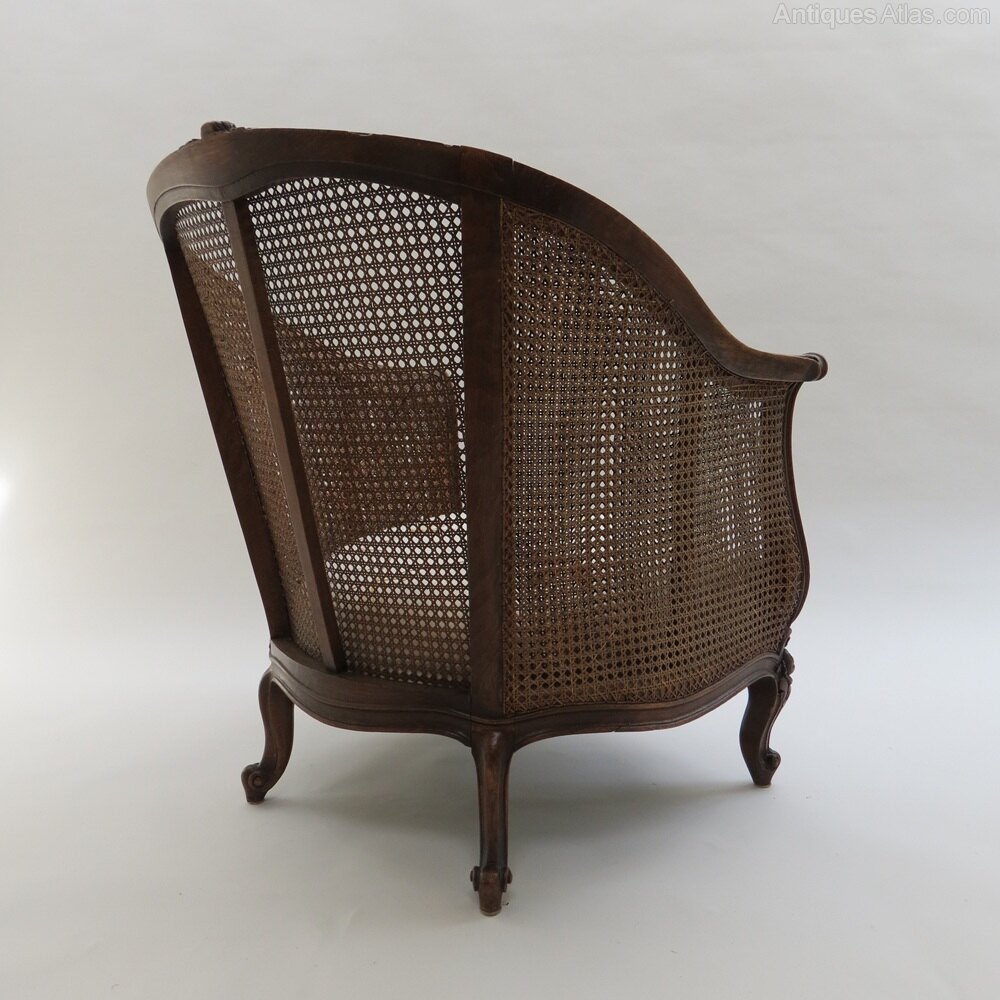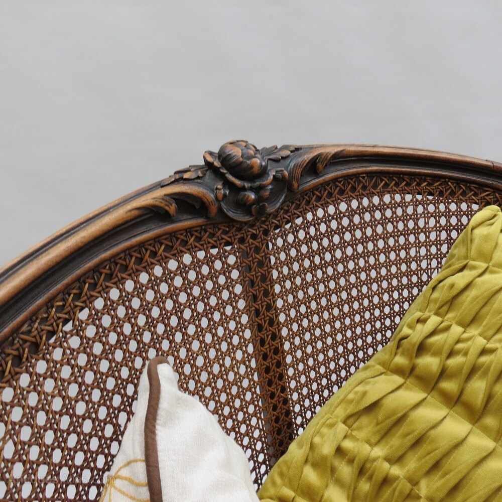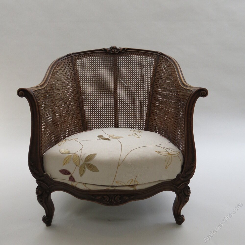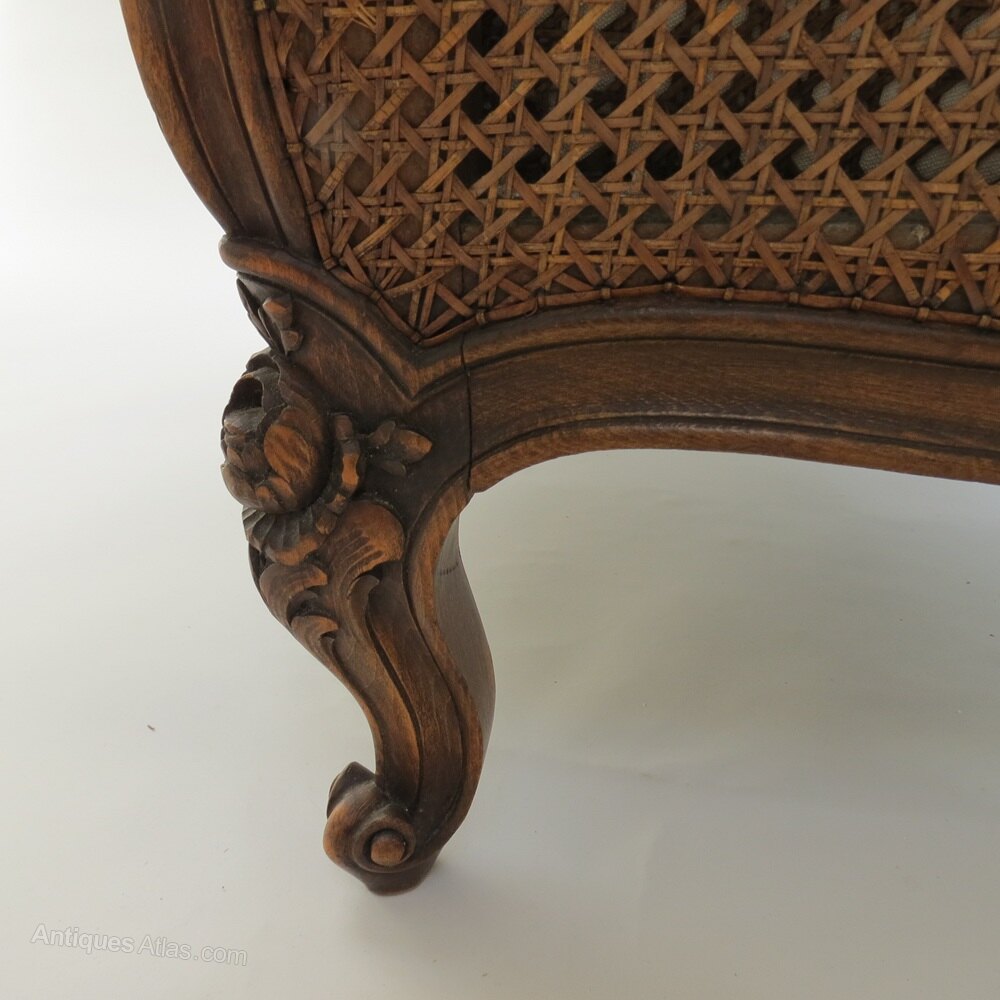 Wonderful pair of French Bergere rattan chairs dating from 1880s, Beech frames with rattan sides and back and stylish cabrio legs. Both chairs have been reupholstered at some point, and the upholstery is in good condition. The carved frames and rattan are in good overall condition. One chair has a couple of small losses to the rattan, this is only noticeable on close inspection.