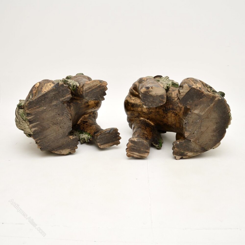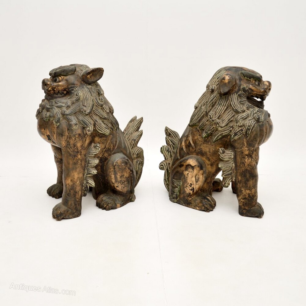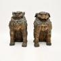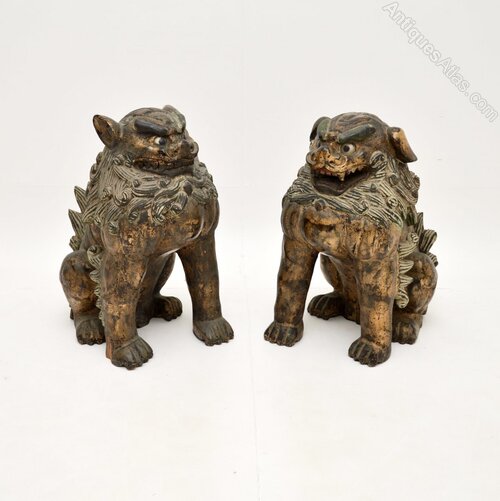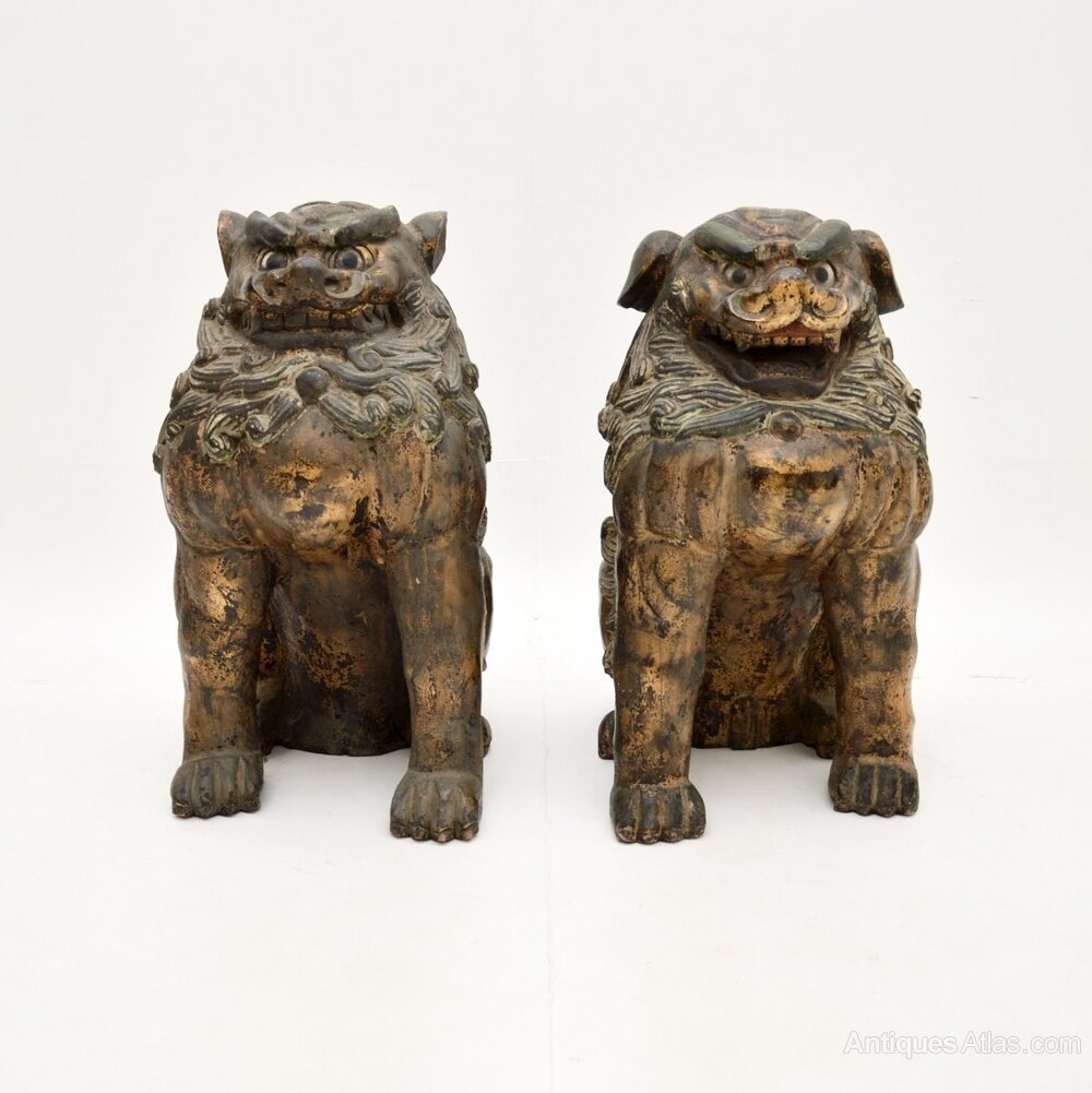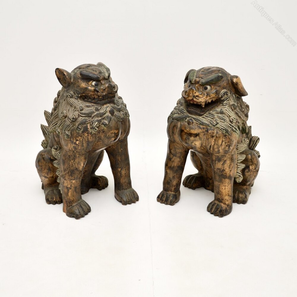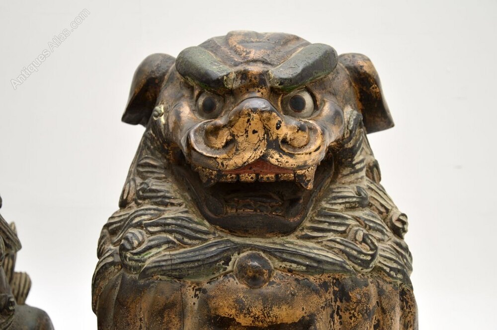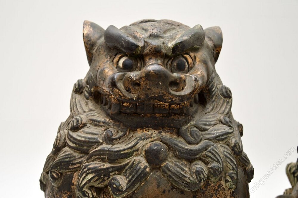 A large and extremely impressive pair of antique Chinese carved wood foo dog statues. They date from the 19th century and are genuine antiques, not to be confused with the many contrived versions more commonly seen. They were most likely made in China, or possibly in Tibet.