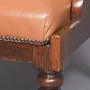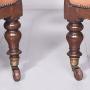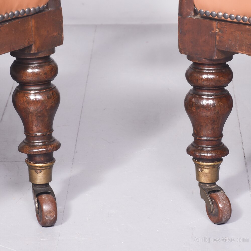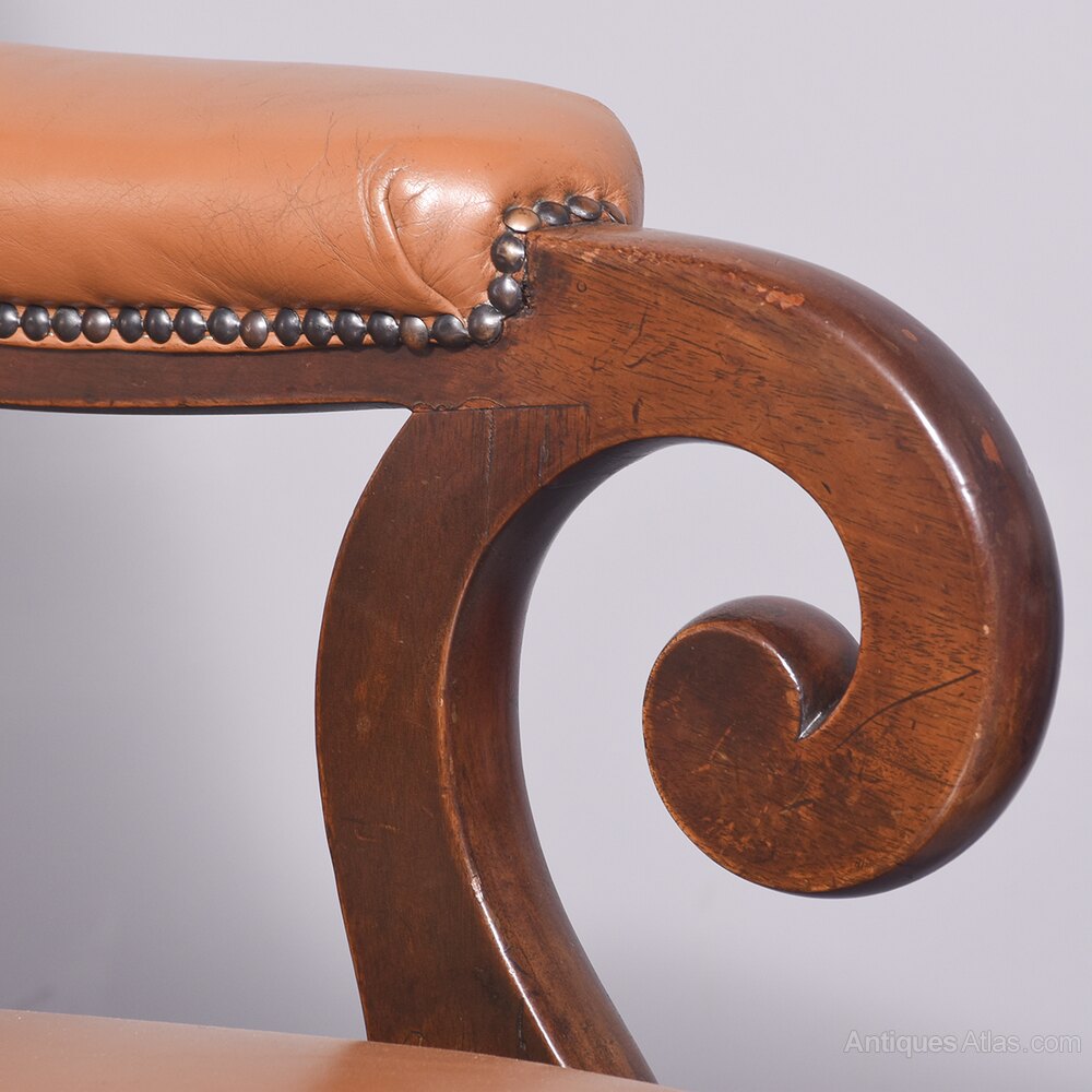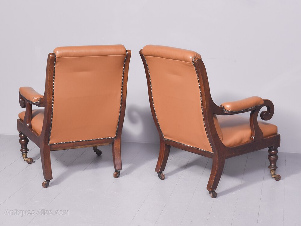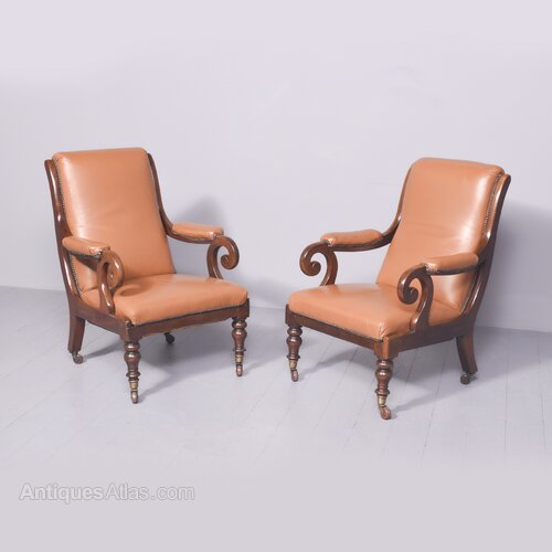 Circa 1825. A quality pair of George IV mahogany library chairs. The upholstered back, arm rests and seat in tan leather with the leather held in place by closed brass studding. The mahogany frame supporting the arms with scrolling ends supported on shaped uprights, the simple seat, back legs are square and slightly out swept and front legs are turned and ring turned finishing with a brass cup with brown castors beneath. Provenance ‘The Royal & Ancient Golf Club, St Andrews’.