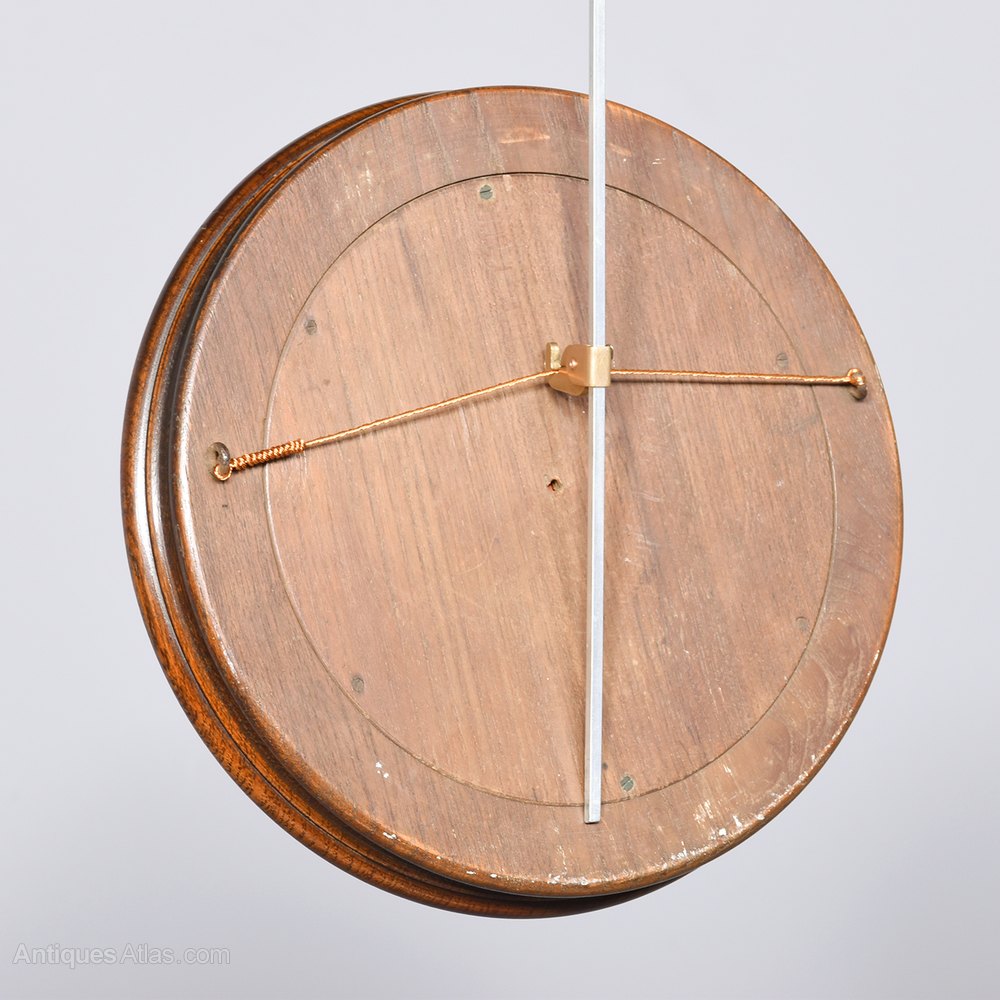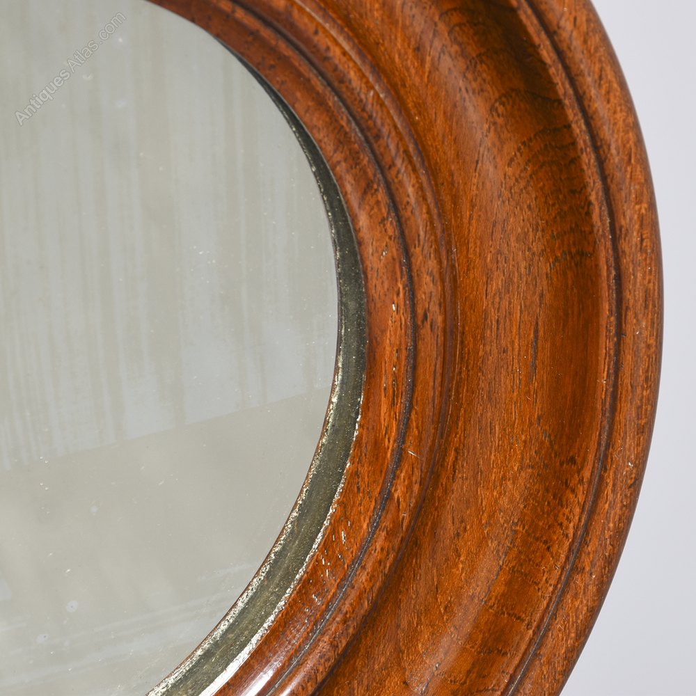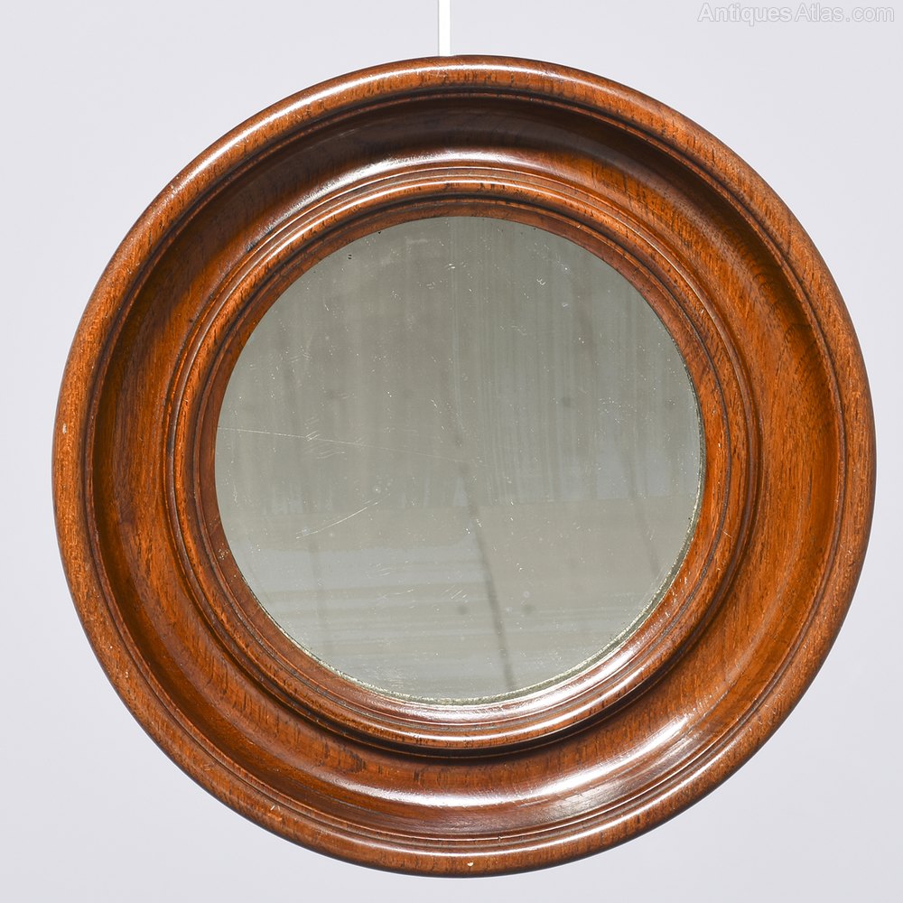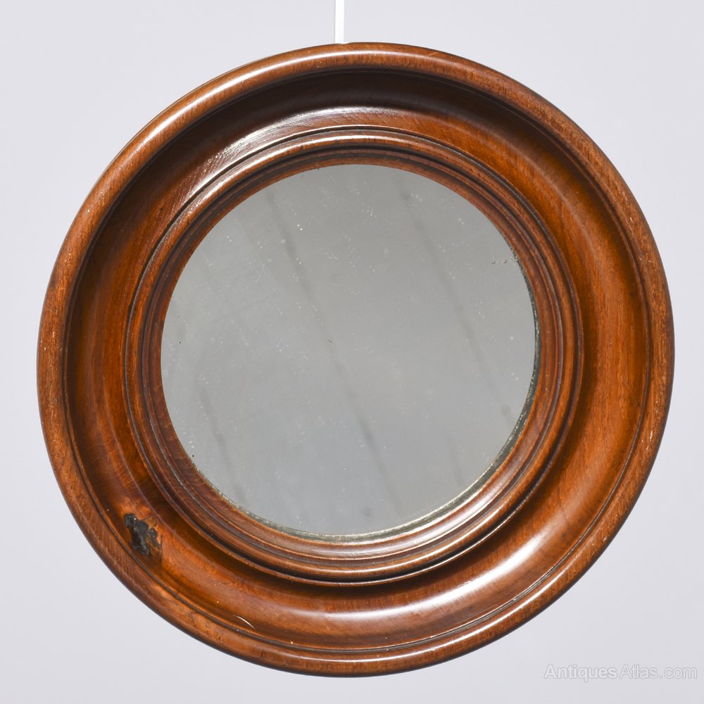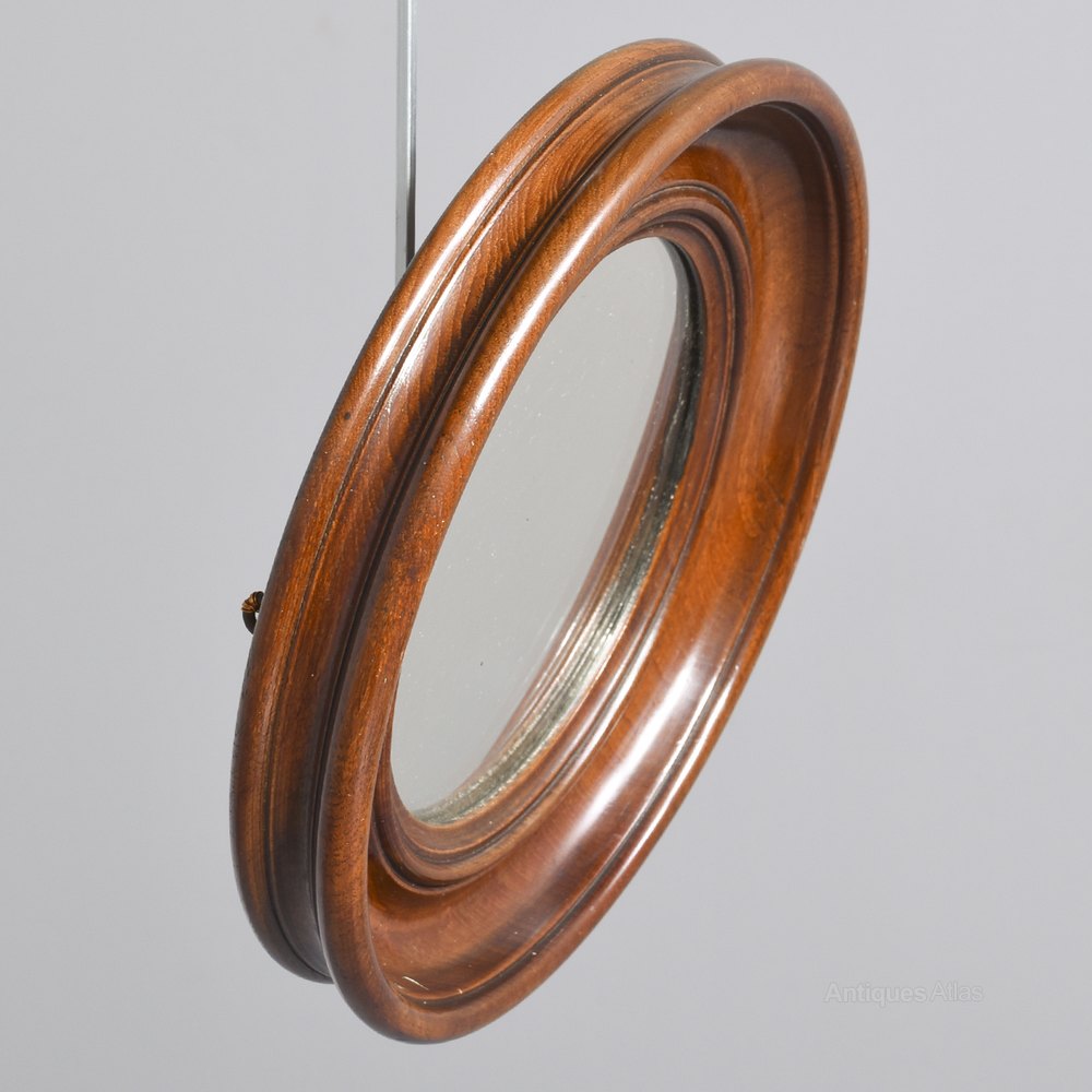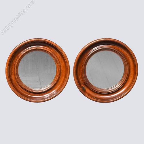 Circa 1900. A pair of circular walnut framed mirrors. The frames retaining their original plates are mounted in convex style frame with various stepped mouldings on the inside and outside of the frames.